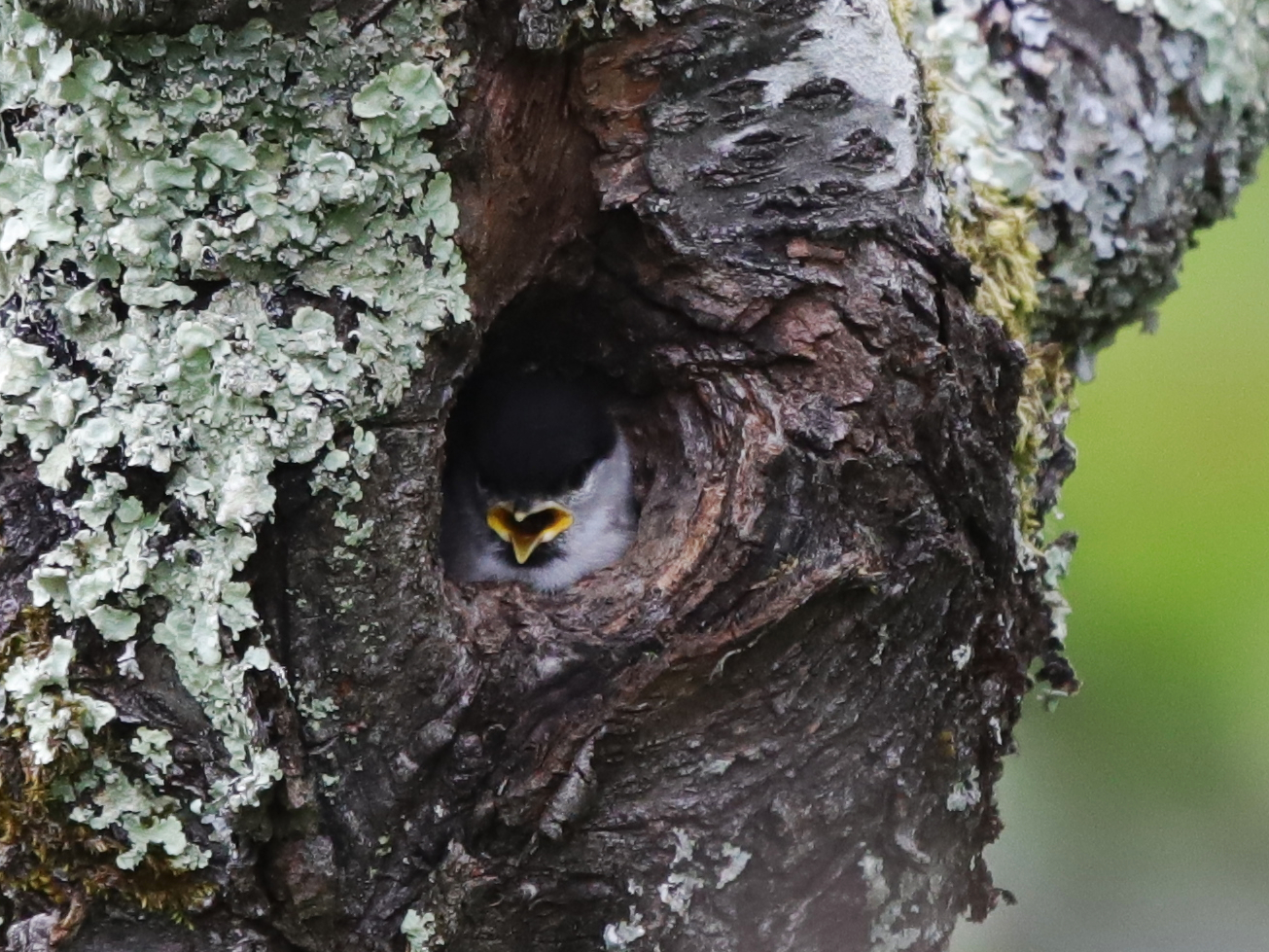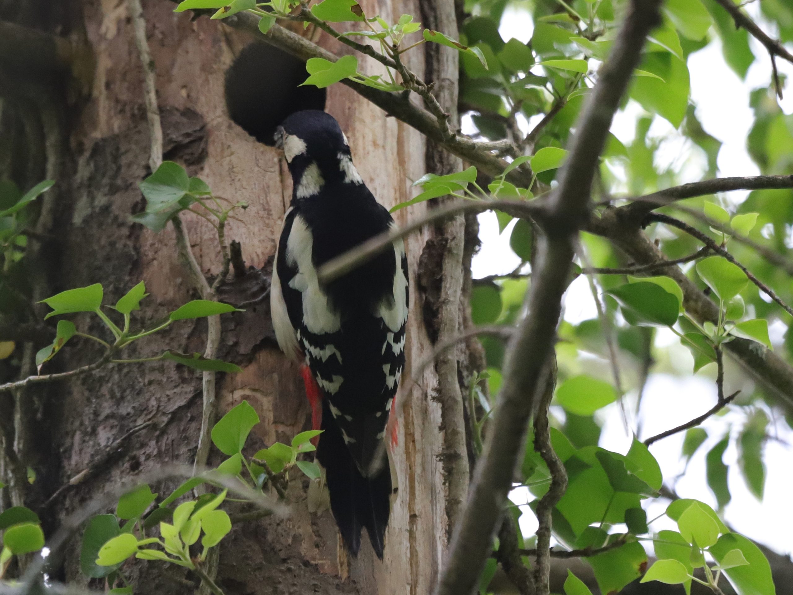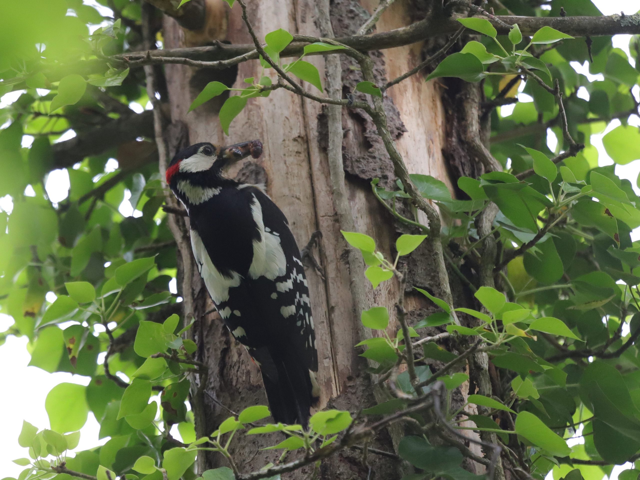 Trouver un nid de Pic épeiche n’est pas trop difficile, les jeunes appellent sans cesse. Par contre, les adultes sont très méfiants et il faut du temps pour qu’ils osent s’approcher et nourrir le ou les oisillons. Il y a d’abord eu la femelle – arrière de la tête noire – puis le mâle – arrière de la tête rouge.