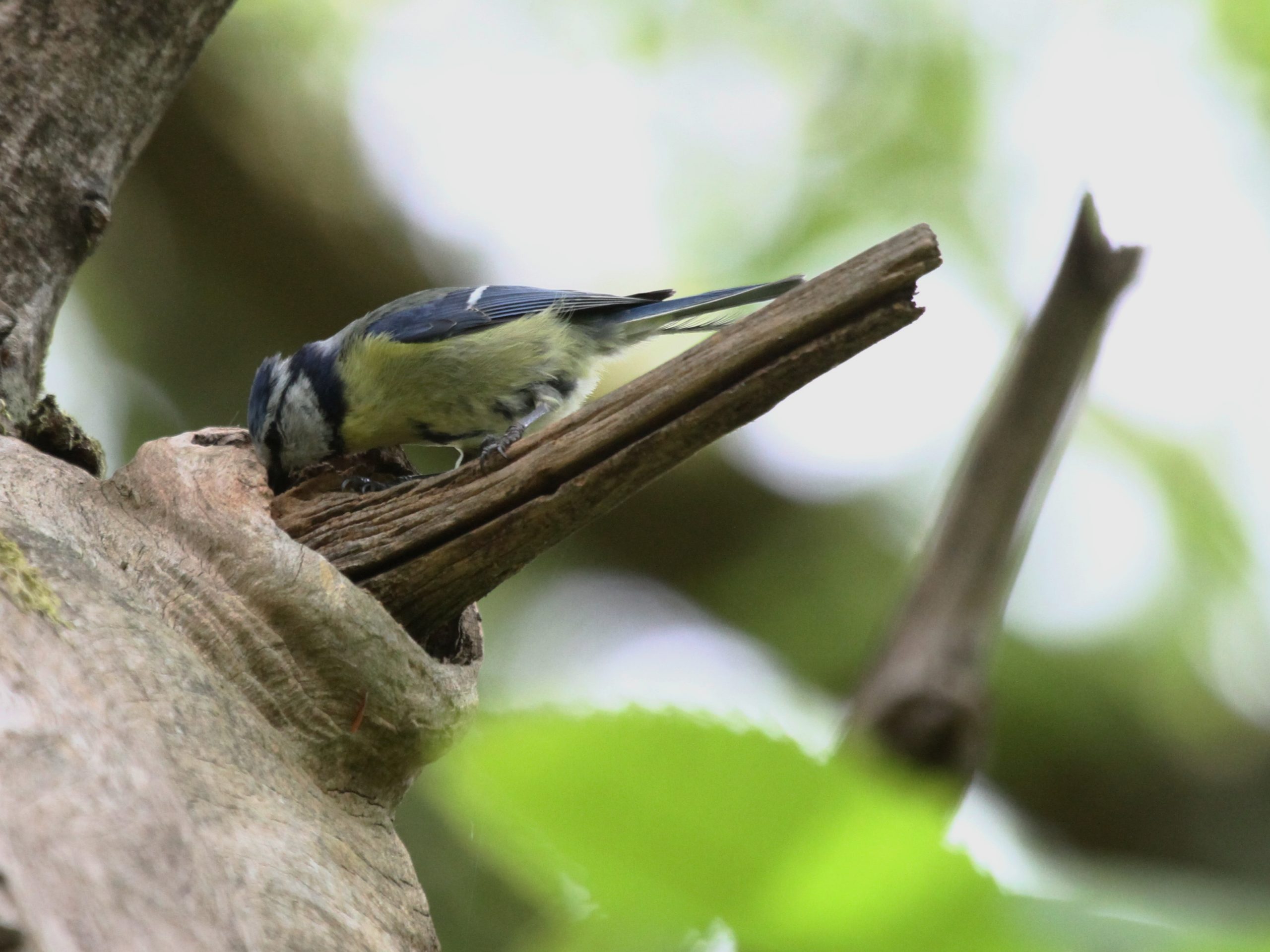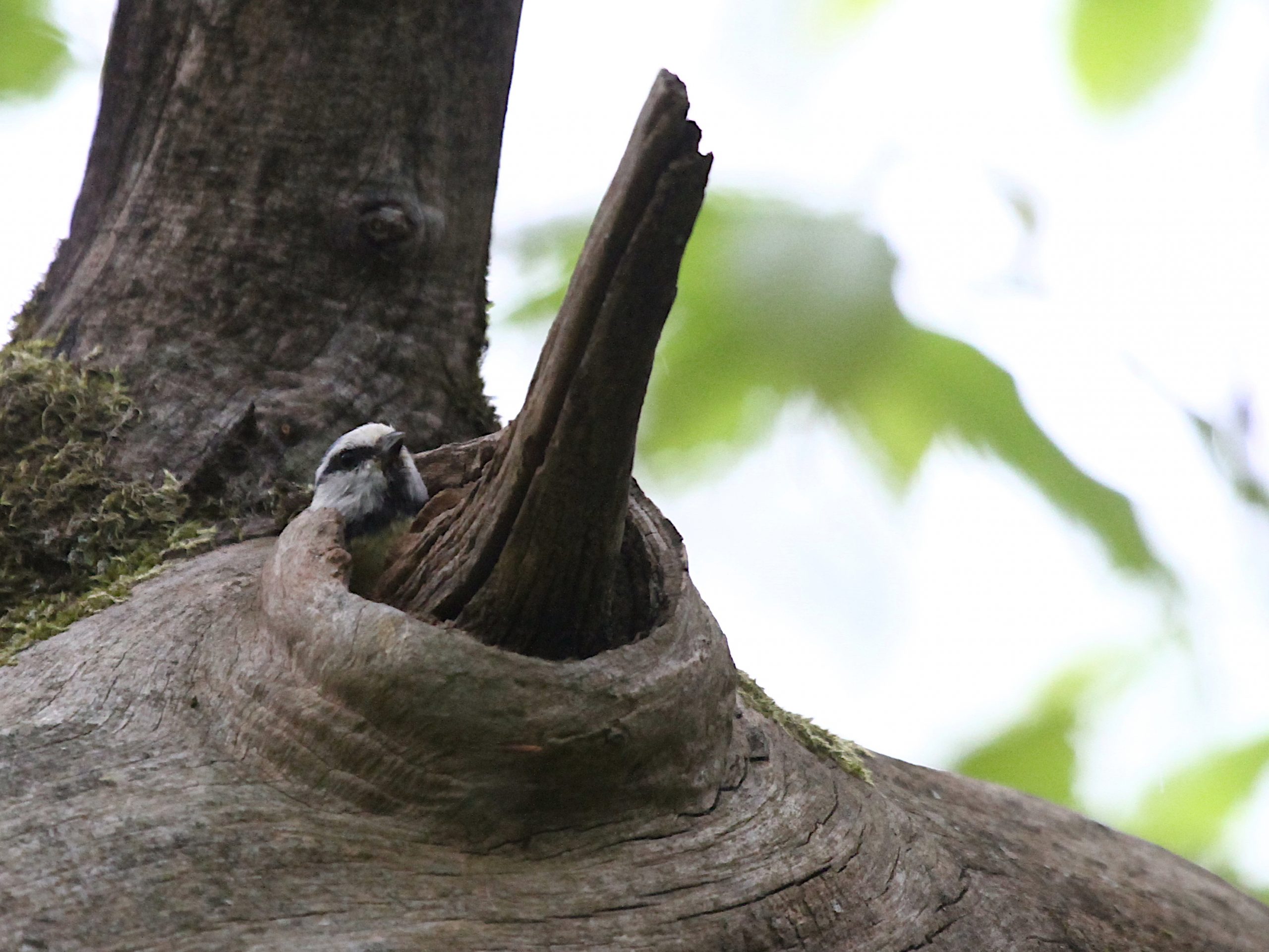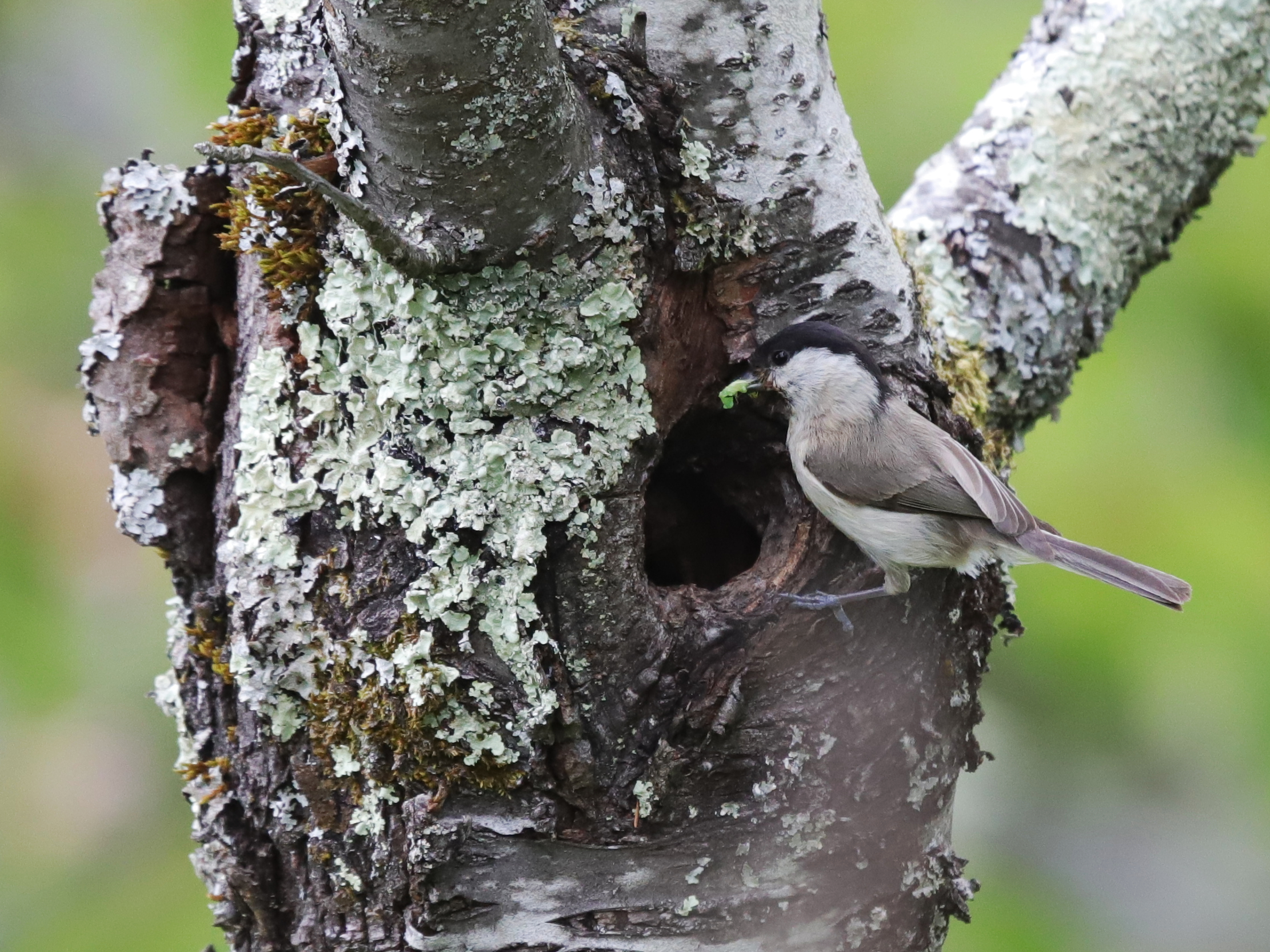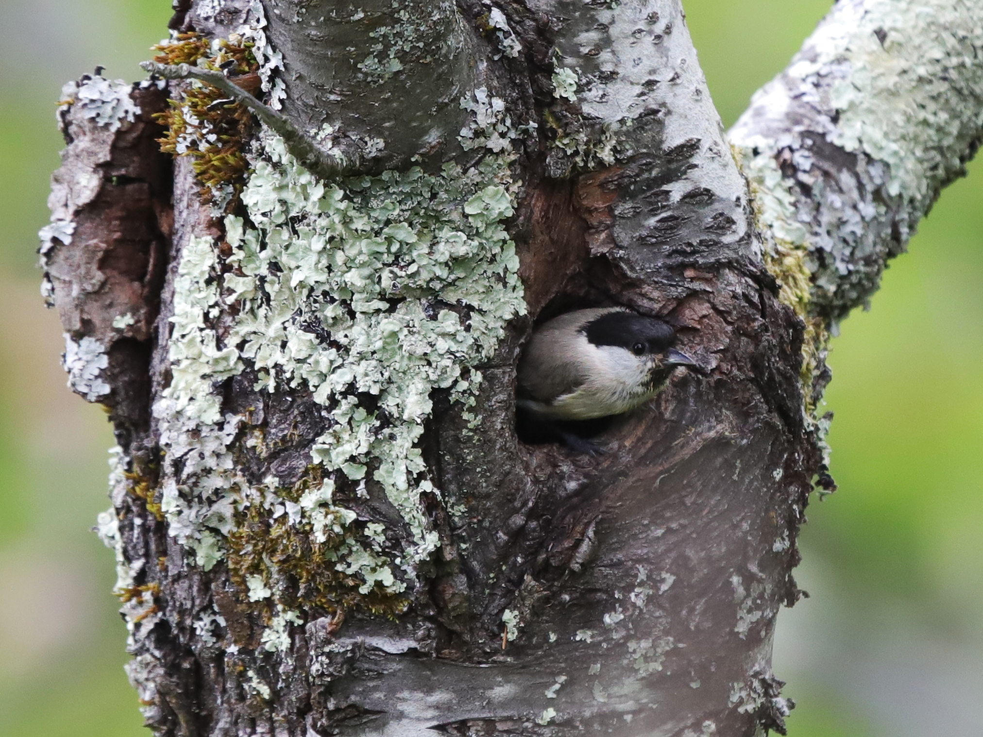 Trouver un nid de Pic épeiche n’est pas trop difficile, les jeunes appellent sans cesse. Par contre, les adultes sont très méfiants et il faut du temps pour qu’ils osent s’approcher et nourrir le ou les oisillons. Il y a d’abord eu la femelle – arrière de la tête noire – puis le mâle – arrière de la tête rouge.
