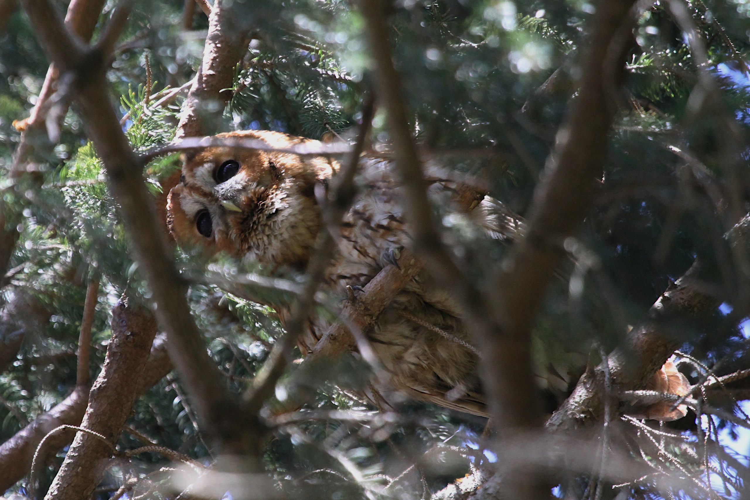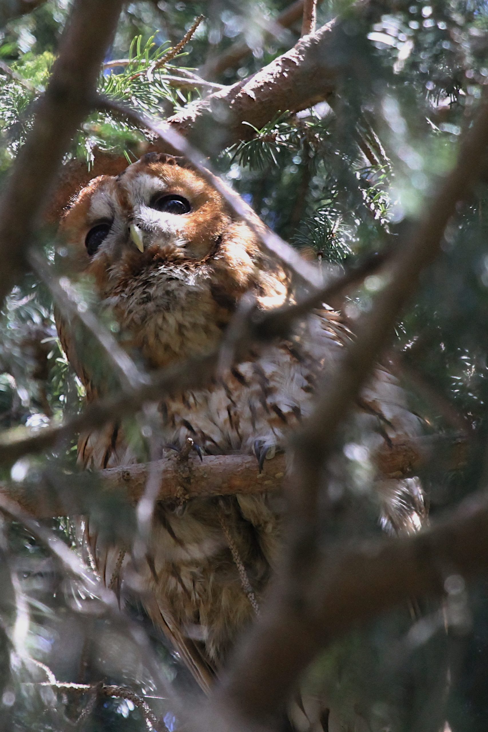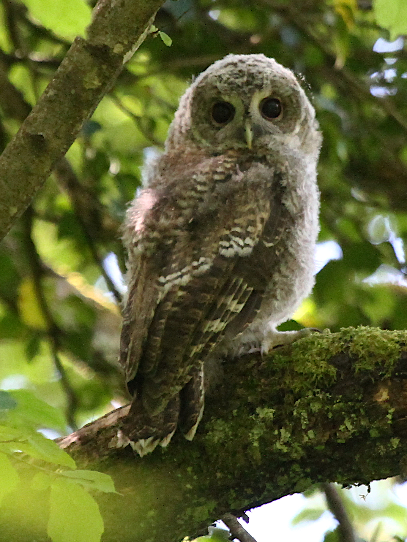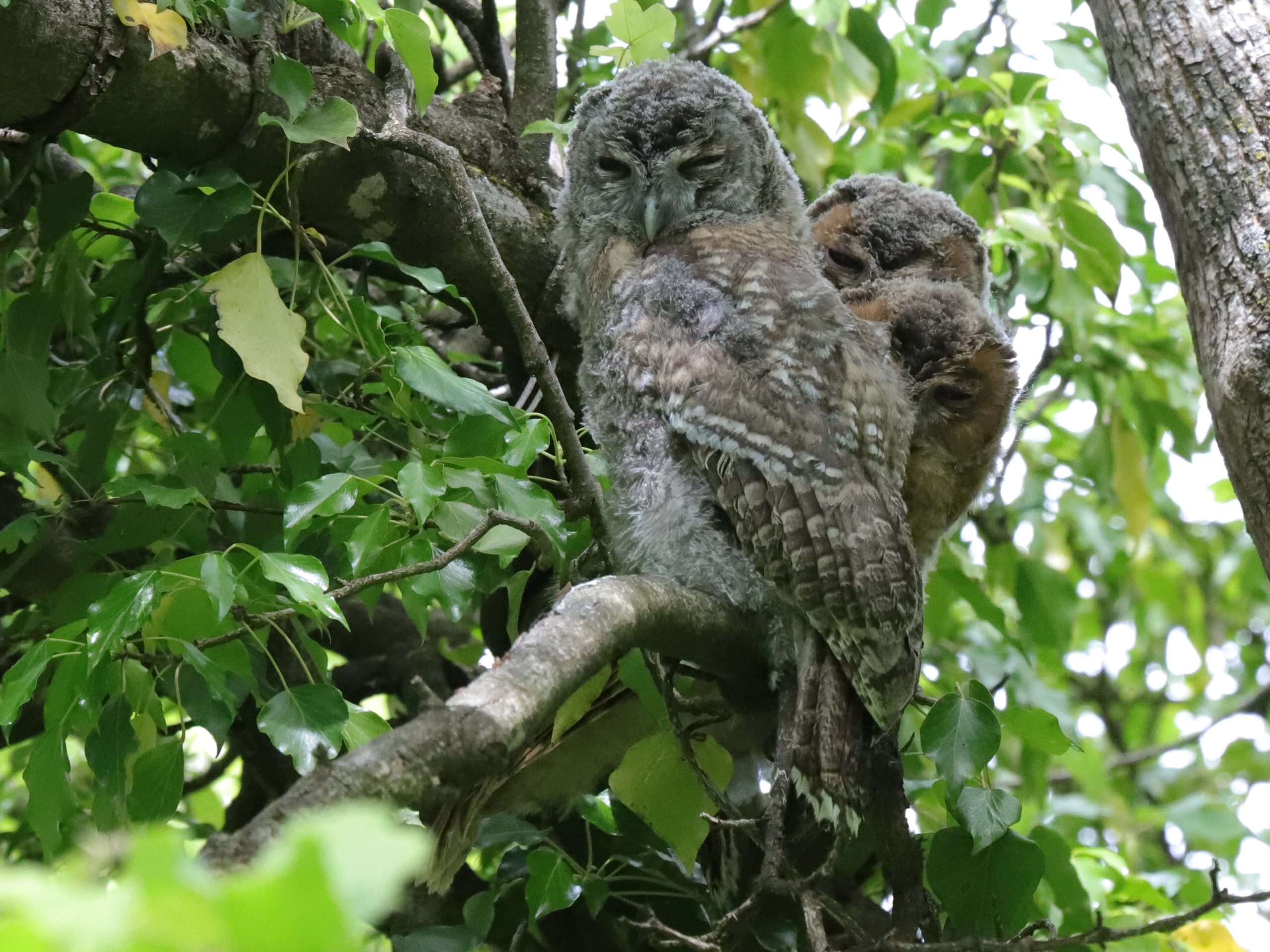Tout d’abord une nichée de Chouettes hulottes. Au moins trois petits, peut-être quatre ou cinq et les deux adultes à leur côté. Impossible de cadrer tout ce monde, qui s’est ensuite éparpillé dans les châtaigniers, harcelé par les merles. Quand le calme est revenu, j’ai pu retrouver deux des jeunes et un adulte, assoupi contre un tronc.