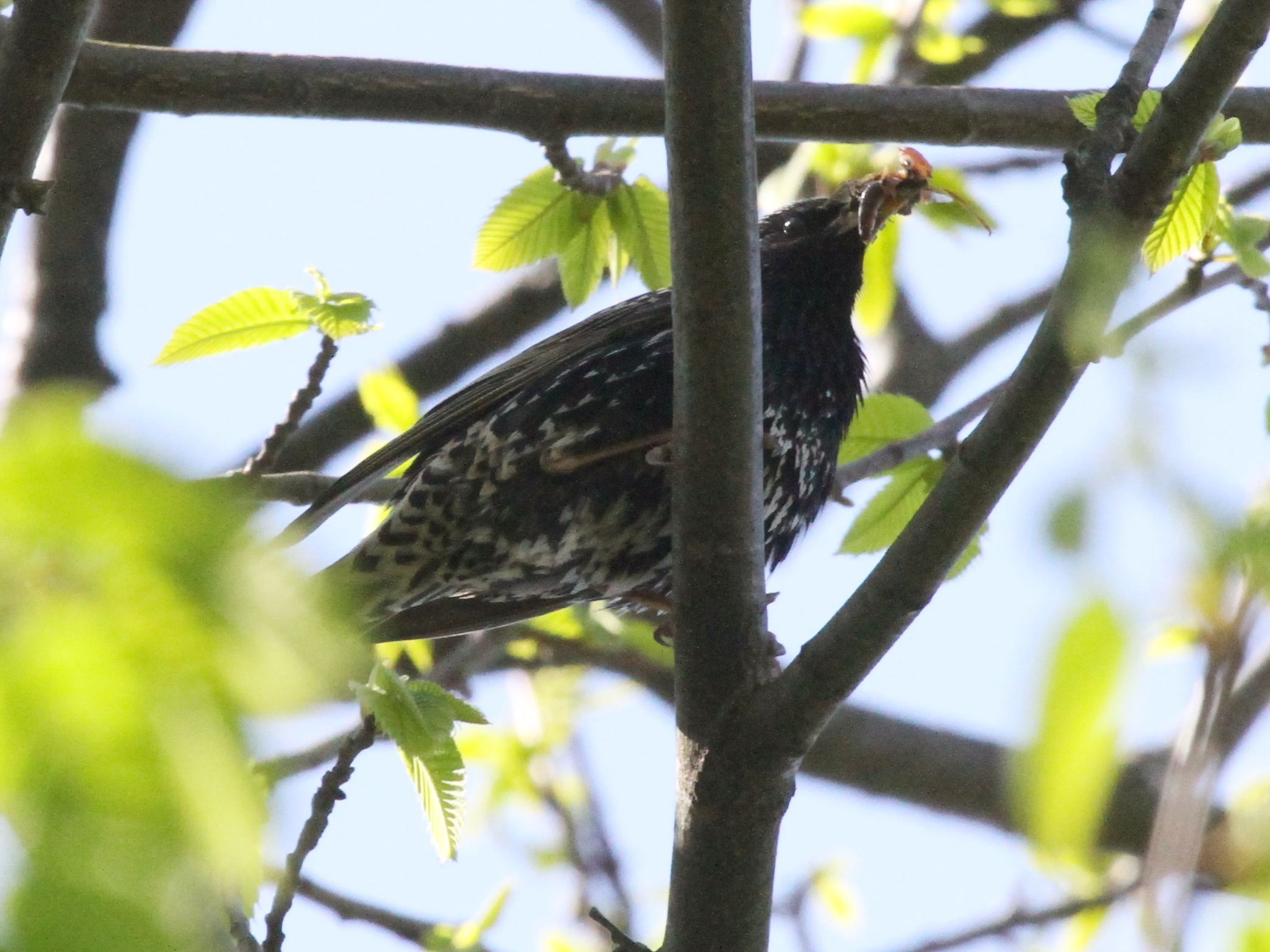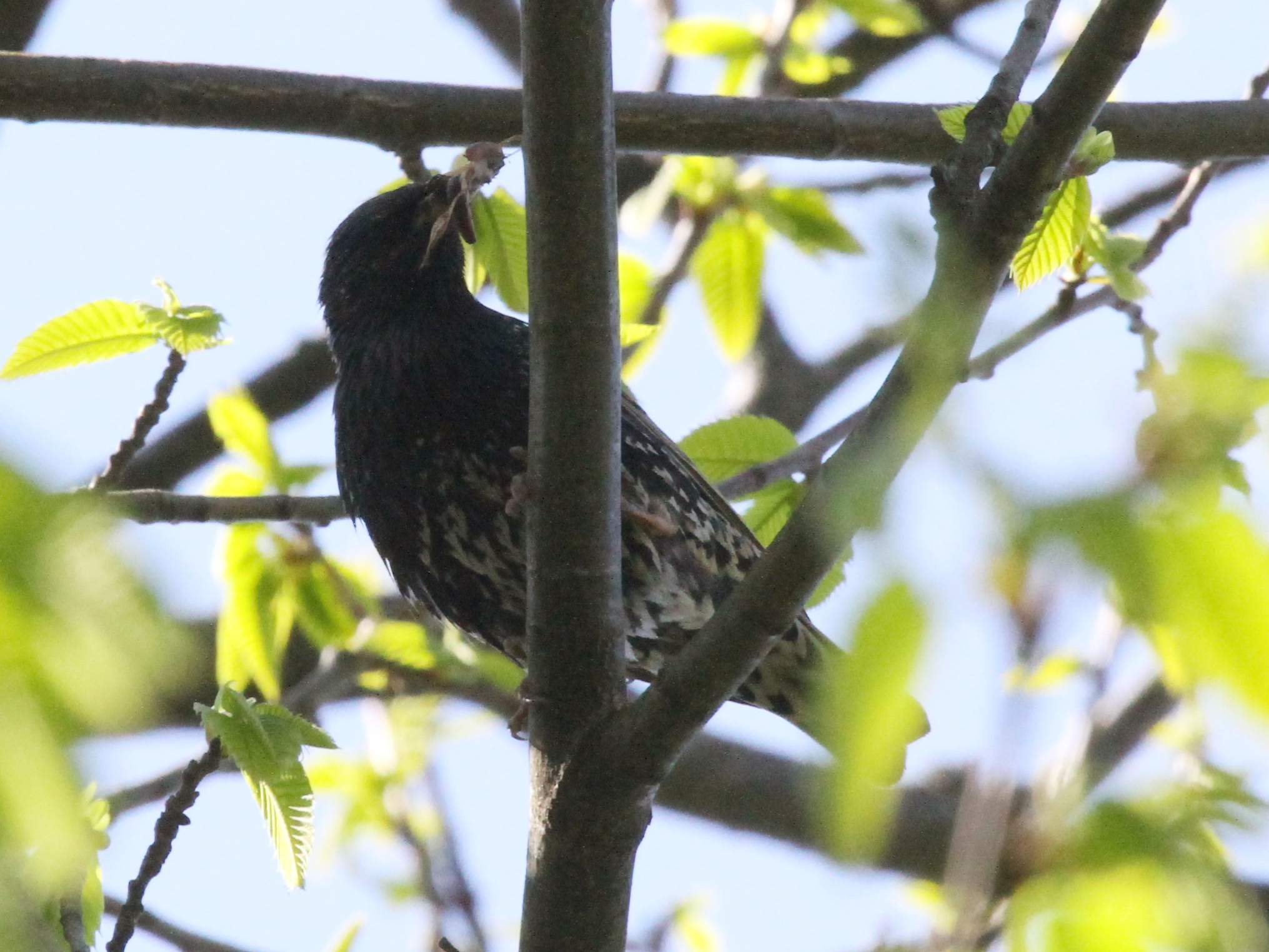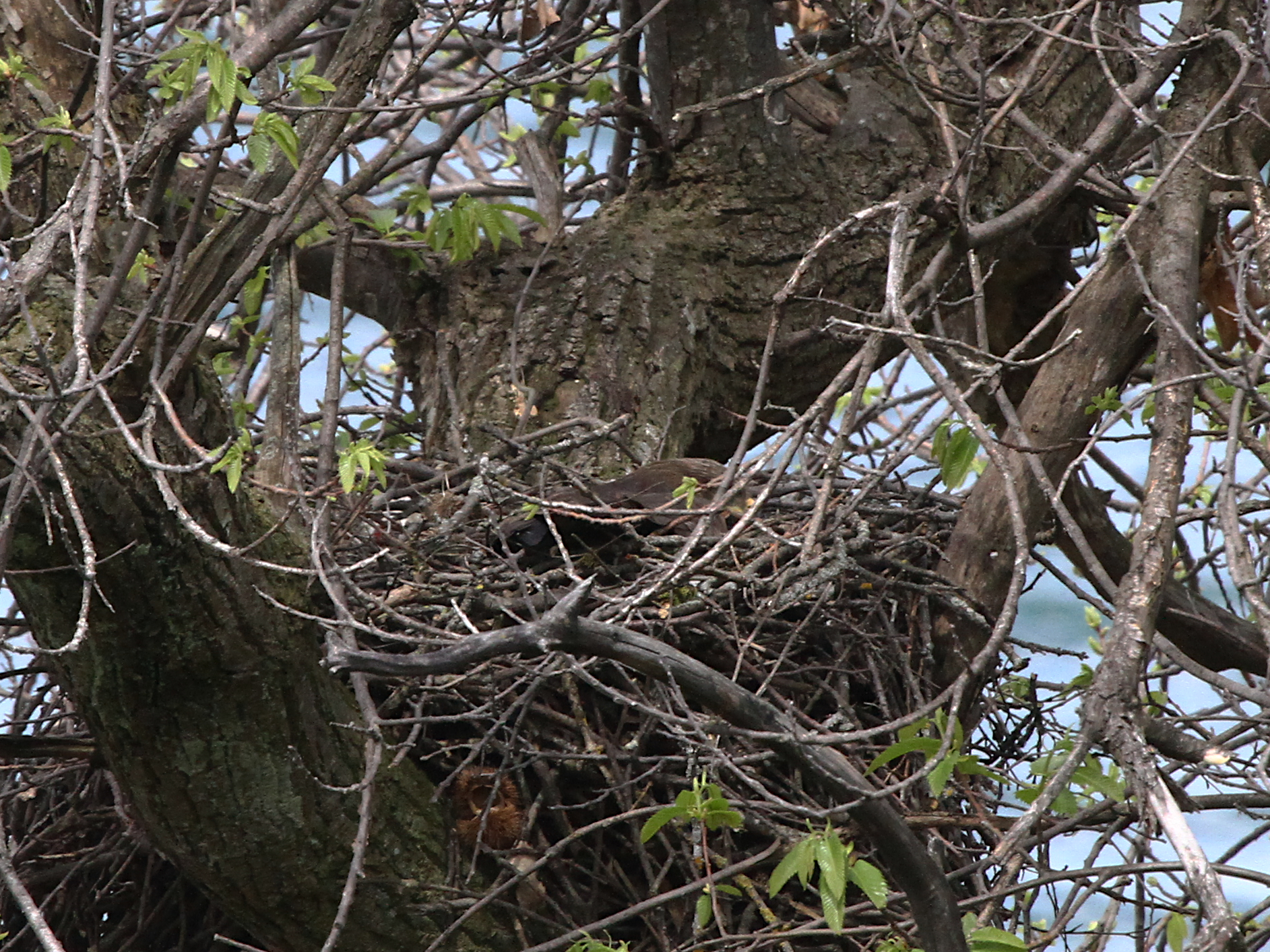 Les Milans noirs, qui couvaient encore la semaine dernière, sont maintenant dans l’obligation de nourrir leurs poussins. Je n’ai pu voir s’il y en avait deux ou trois. Si les feuilles ne se développent pas de trop, je pourrai contrôler dans quelques jours, quand ils seront plus grands.