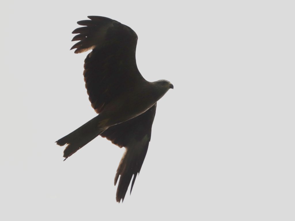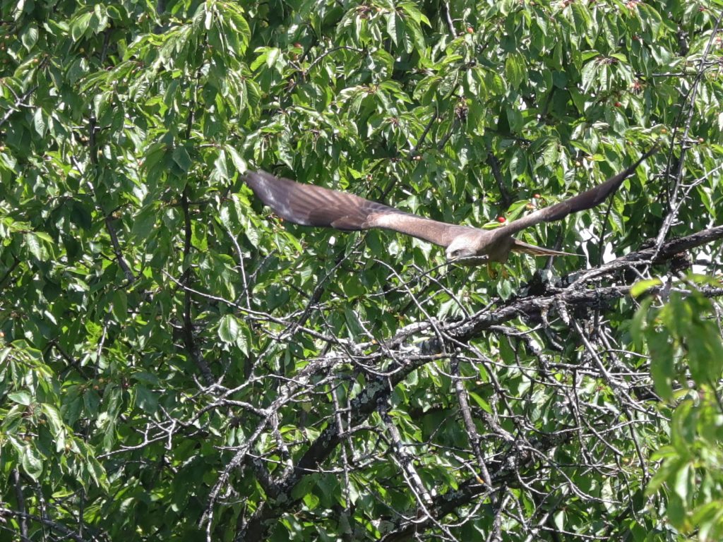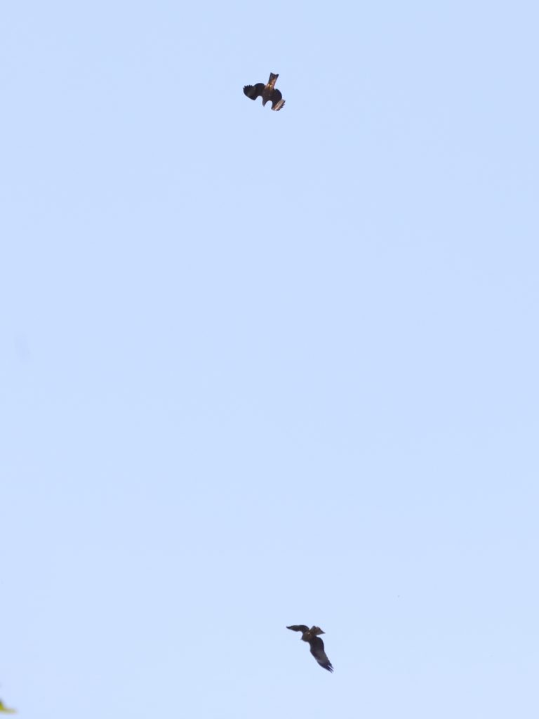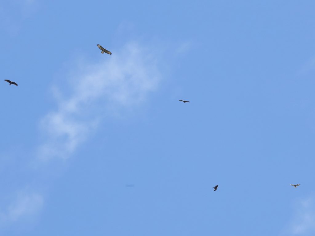 Les Milans noirs se rassemblent ces jours-ci en groupes, de 5 à plus de 60 oiseaux, et tournent dans les ascendances thermiques. Des intrus comme les Buses variables se glissent parfois dans ces spirales, sans bagarre. Un Milan noir a pris son en-cas en vol alors qu’un autre est venu me survoler d’assez près pour un portrait en gros plan.