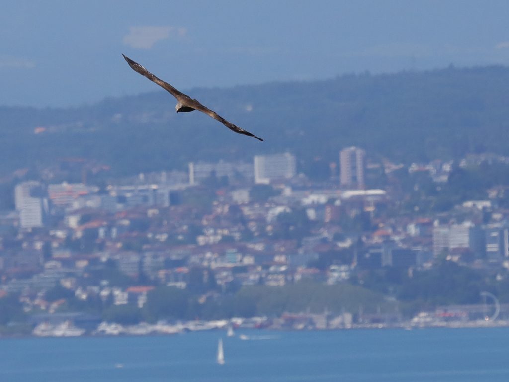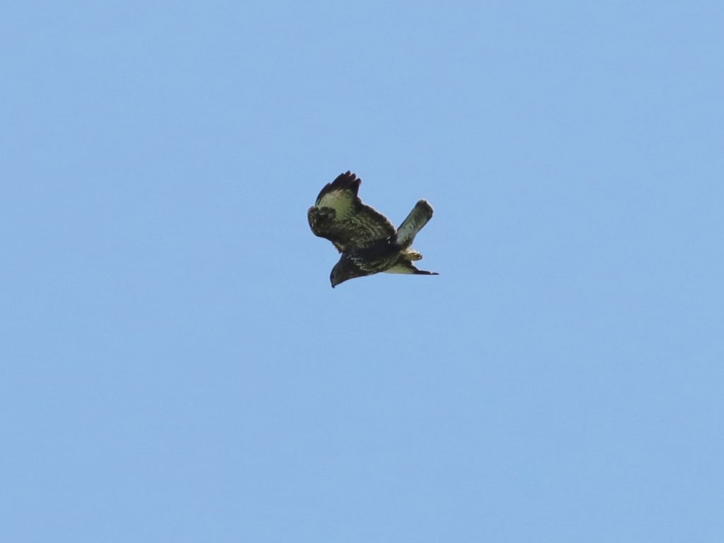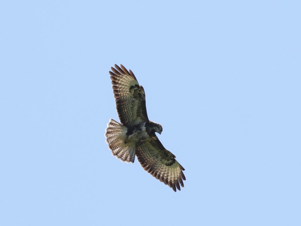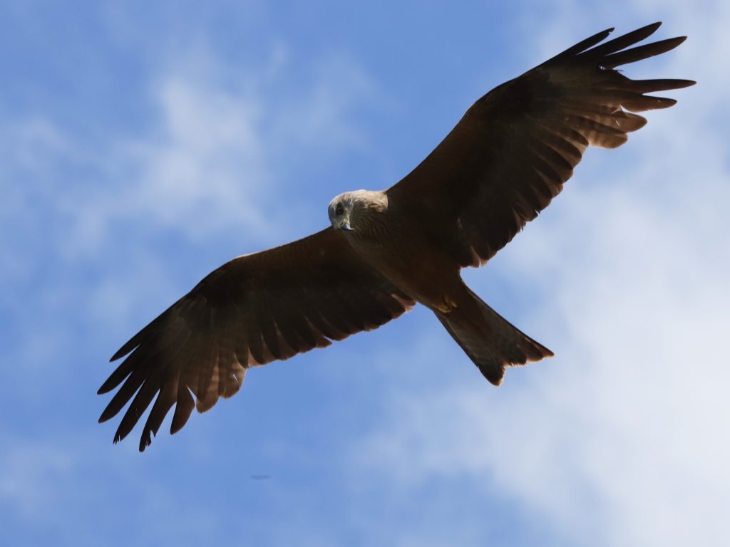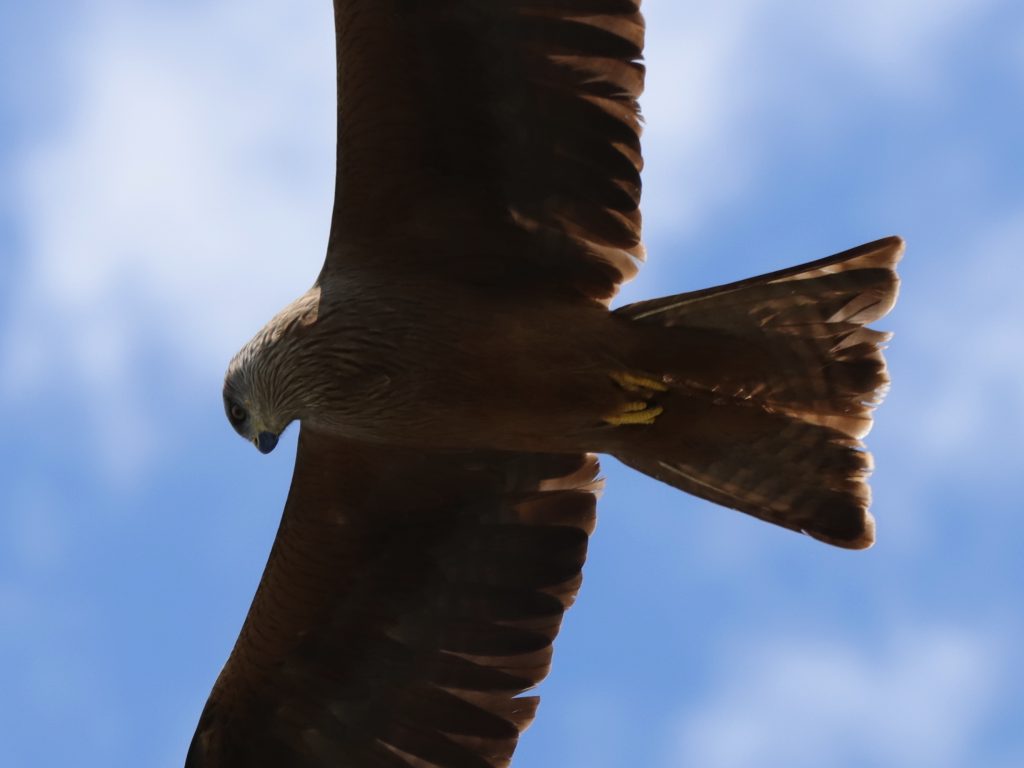 Les Milans noirs se rassemblent ces jours-ci en groupes, de 5 à plus de 60 oiseaux, et tournent dans les ascendances thermiques. Des intrus comme les Buses variables se glissent parfois dans ces spirales, sans bagarre. Un Milan noir a pris son en-cas en vol alors qu’un autre est venu me survoler d’assez près pour un portrait en gros plan.