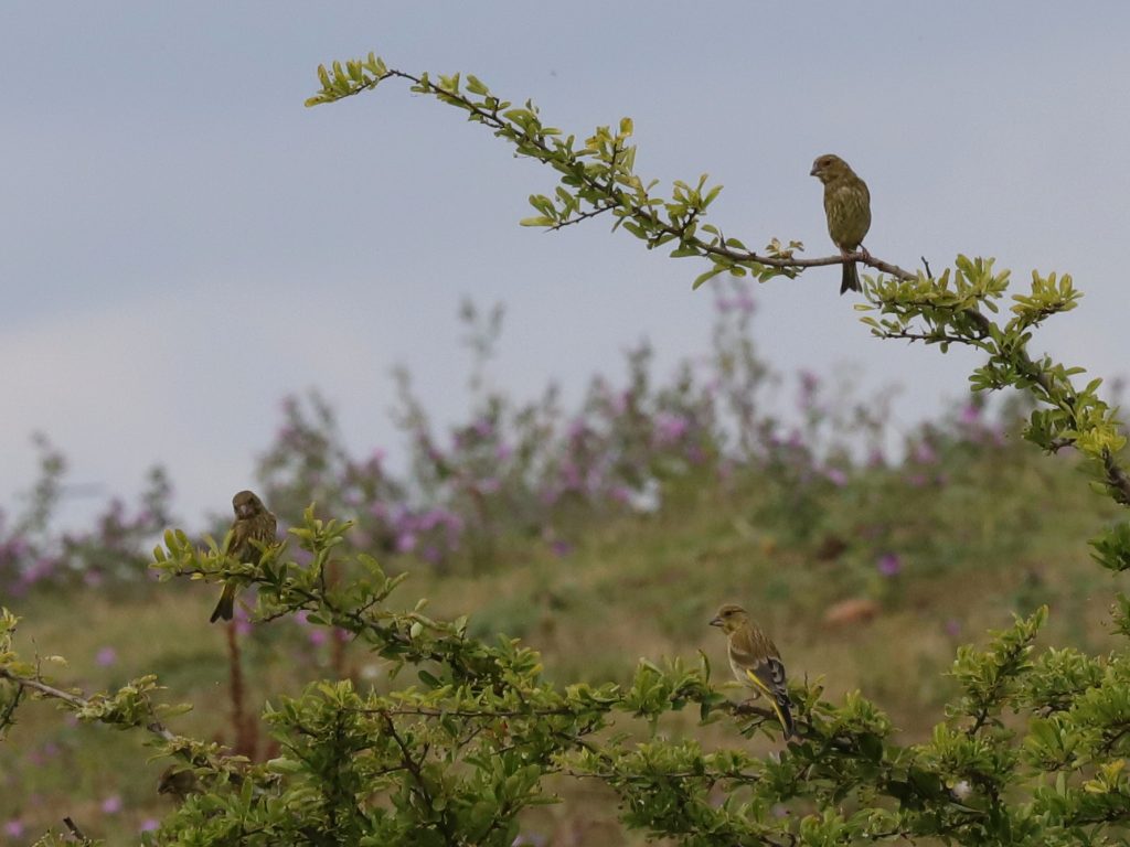 Un petit groupe de Verdiers d’Europe picorait dans des buissons voisins.