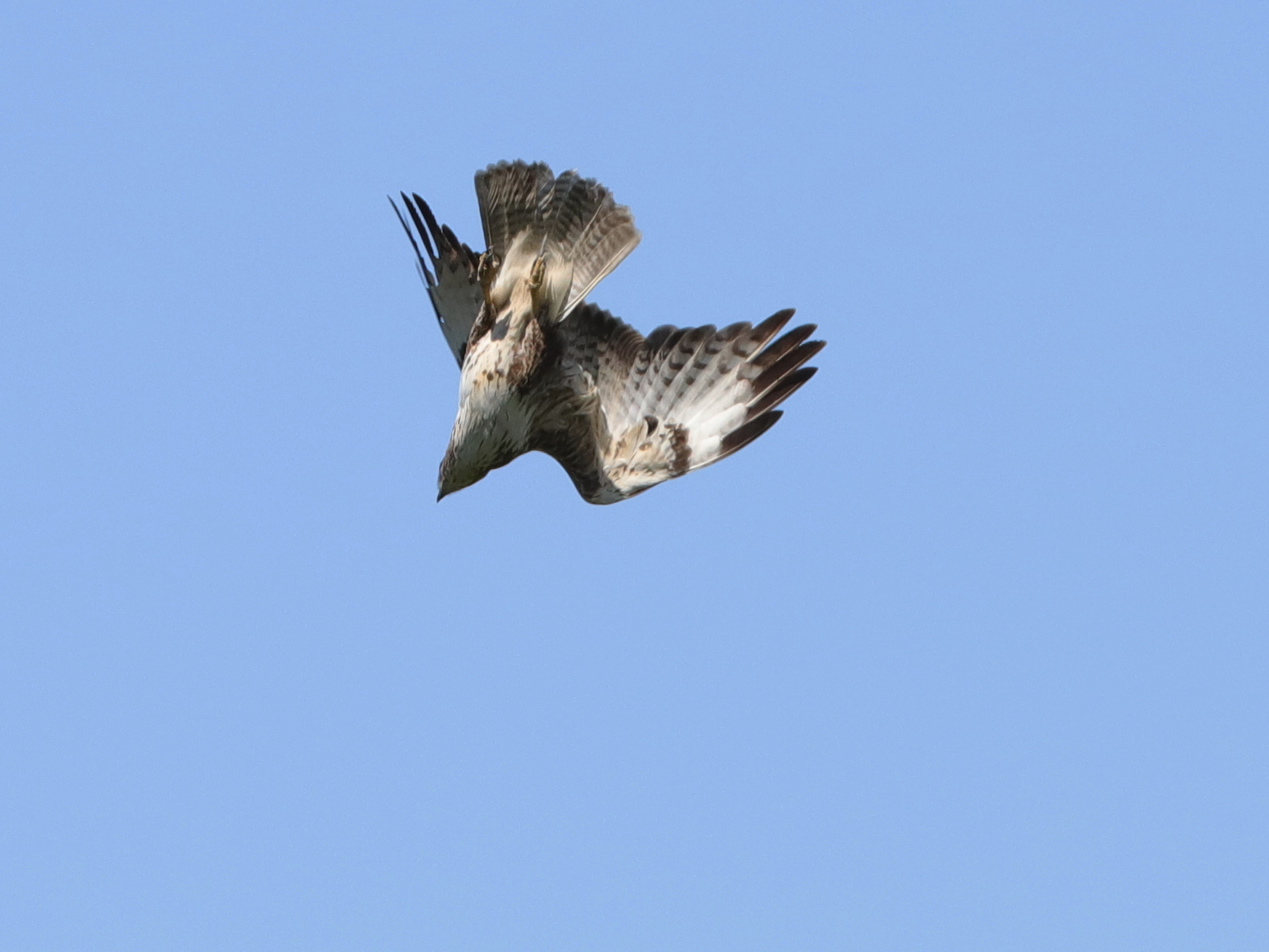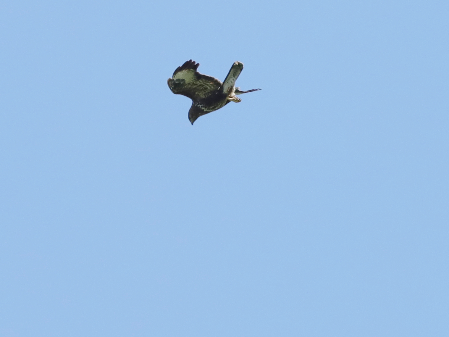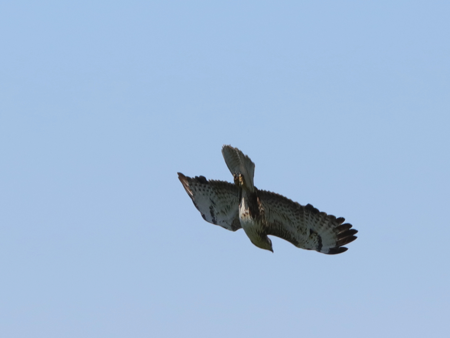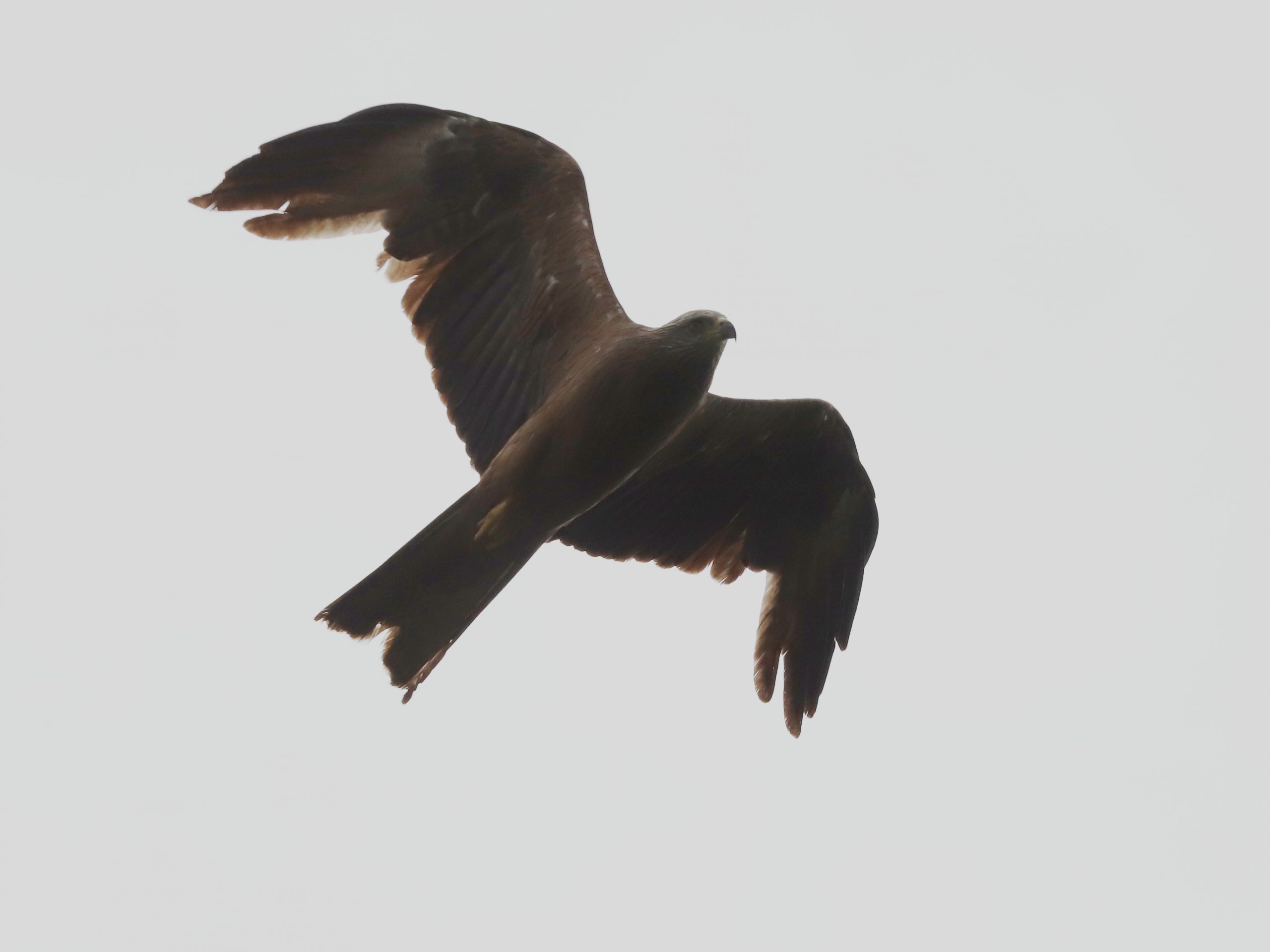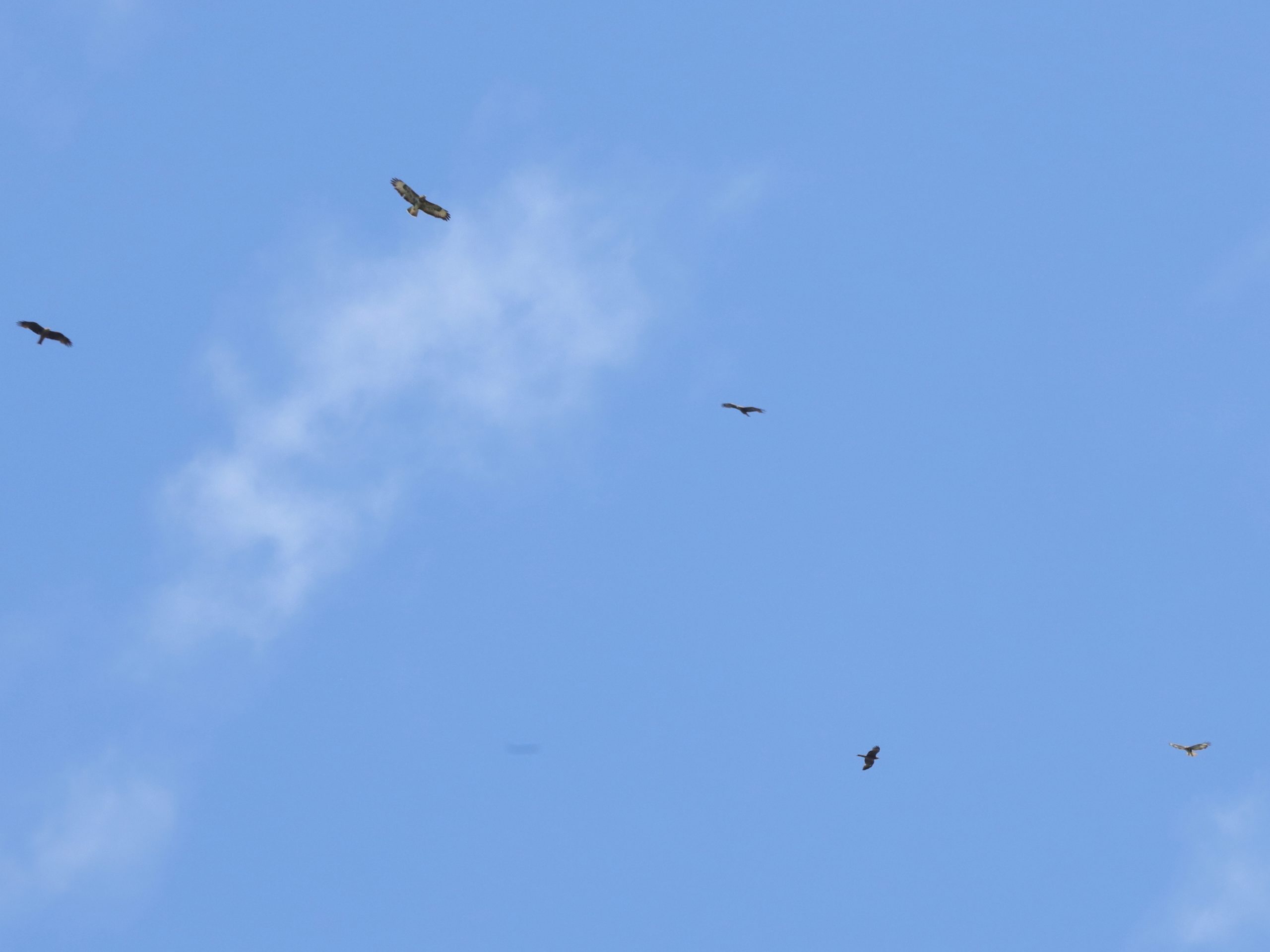 Les Milans noirs se rassemblent ces jours-ci en groupes, de 5 à plus de 60 oiseaux, et tournent dans les ascendances thermiques. Des intrus comme les Buses variables se glissent parfois dans ces spirales, sans bagarre. Un Milan noir a pris son en-cas en vol alors qu’un autre est venu me survoler d’assez près pour un portrait en gros plan.