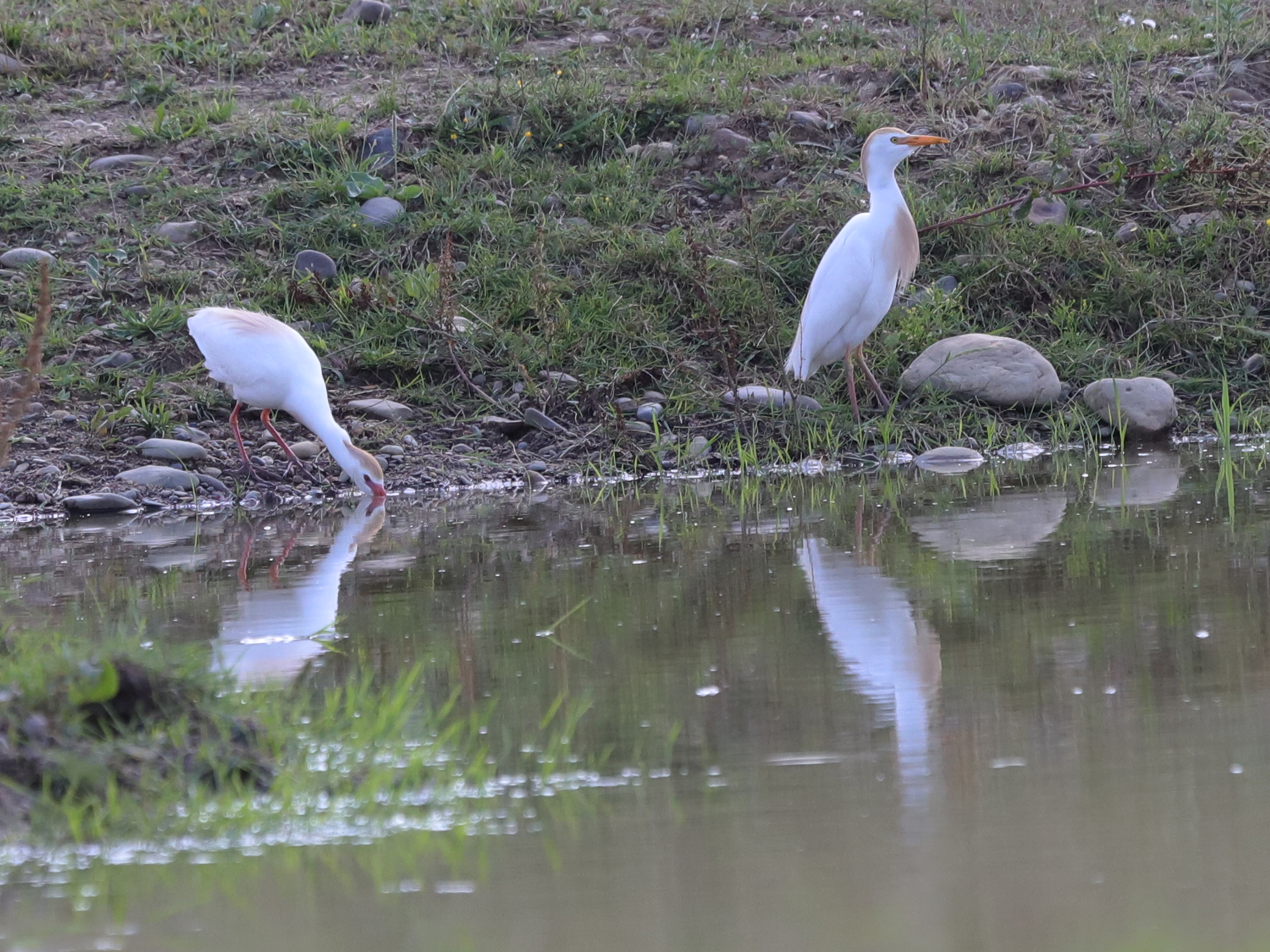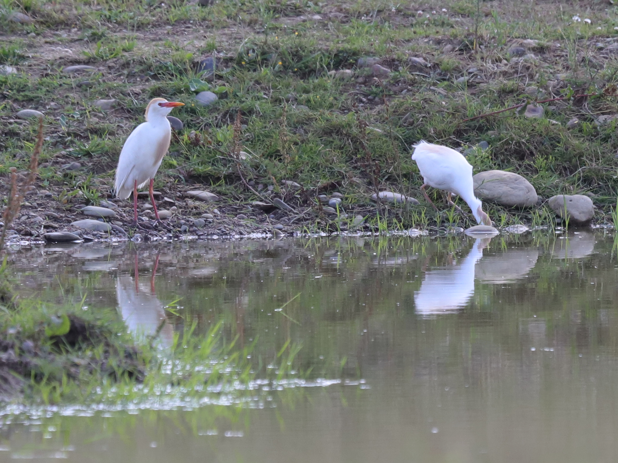 Je tenais à photographier les Hérons garde-boeufs, nombreux autour de Toulouse mais pas toujours à portée d’objectif. La chance m’a souri, un petit groupe constitué de deux adultes et un juvénile – bec et pattes gris – sont venus boire non loin de moi.