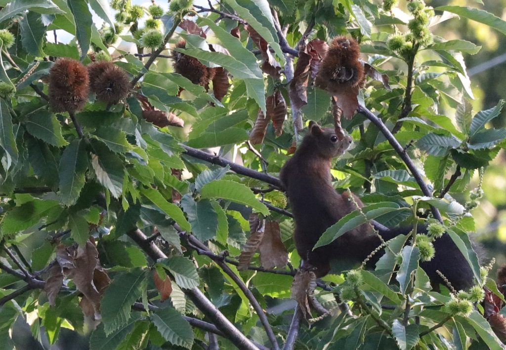 Les écureuils sont rarement visibles à cette saison à cause du feuillage, sauf quand on a la chance de se trouver au-dessus de l’arbre où ils recherchent les châtaignes de l’automne dernier.