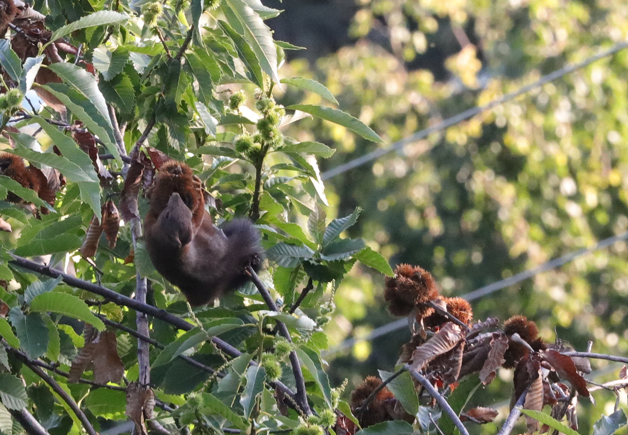 Les écureuils sont rarement visibles à cette saison à cause du feuillage, sauf quand on a la chance de se trouver au-dessus de l’arbre où ils recherchent les châtaignes de l’automne dernier.