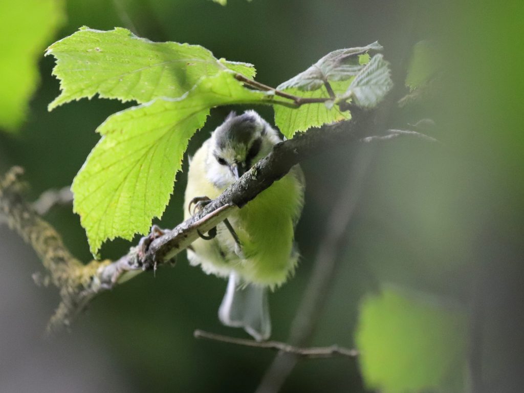 Mésange charbonnière dans le maïs, sans risque pour la récolte puisqu’elle est encore période insectivore.