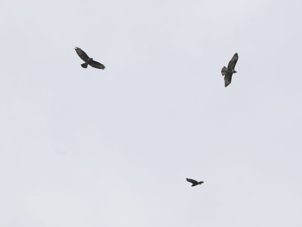 A propos des Buses variables, je suis toujours surpris par les extrêmes de la variabilité du plumage : on va du gris et blanc jusqu’au brun foncé en passant par le roux. L’oiseau quasiment blanc est lorrain, tout comme les oiseaux au ventre roux (Halstroff, nord de la Moselle). Les autres sont lugrinois.