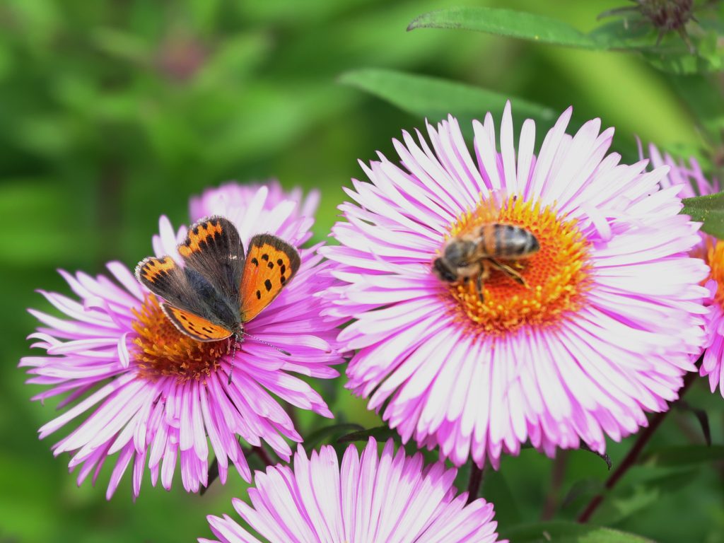 … et des papilllons et autres abeilles et mouches. Un bouquet d’asters, je crois, a attiré toute une variété de convives.
