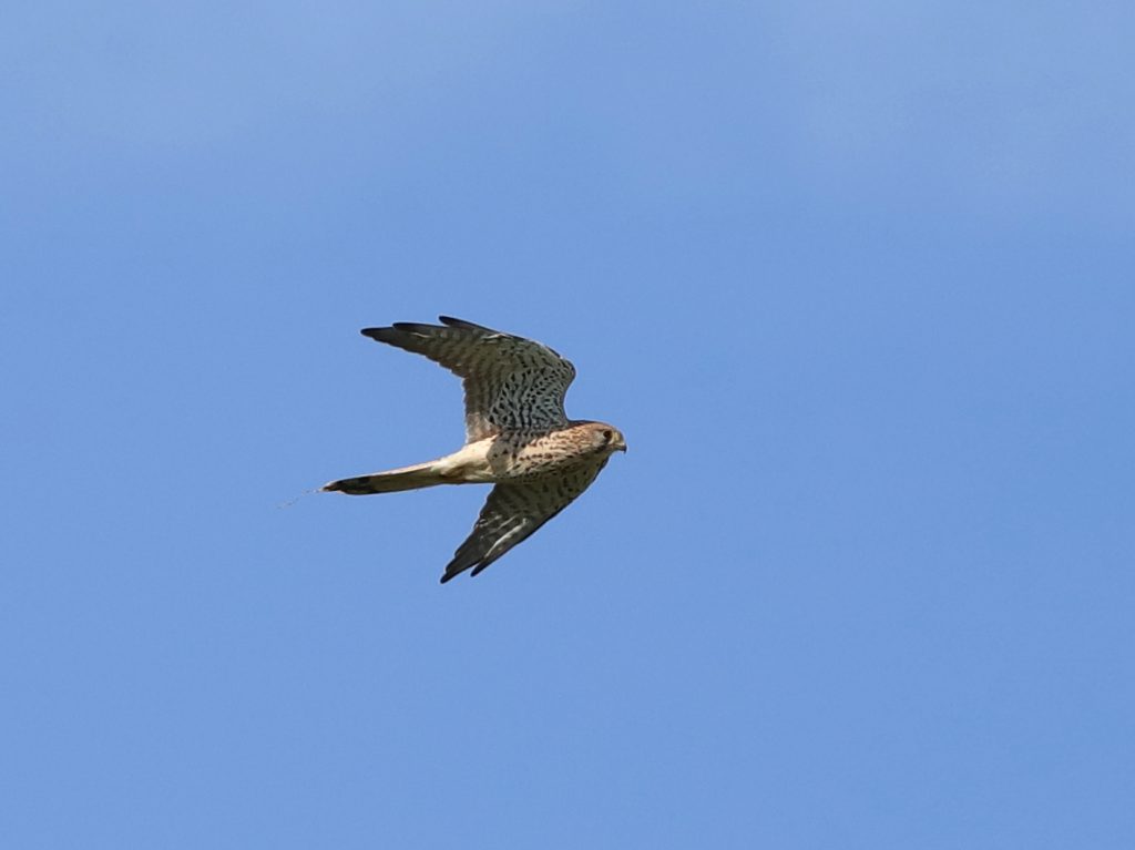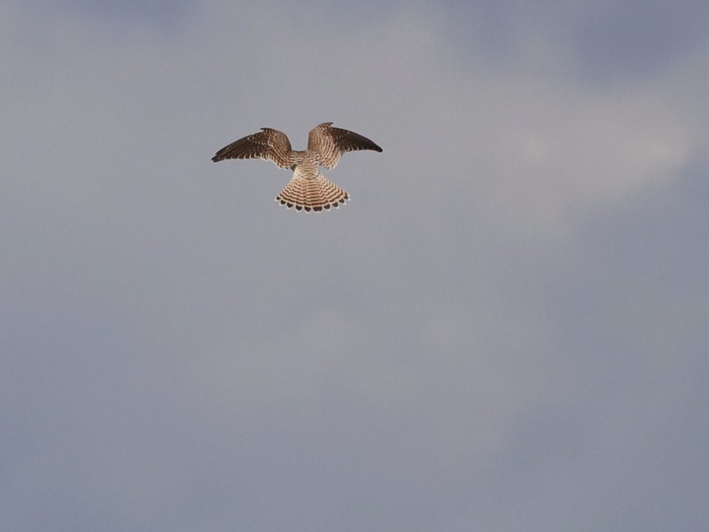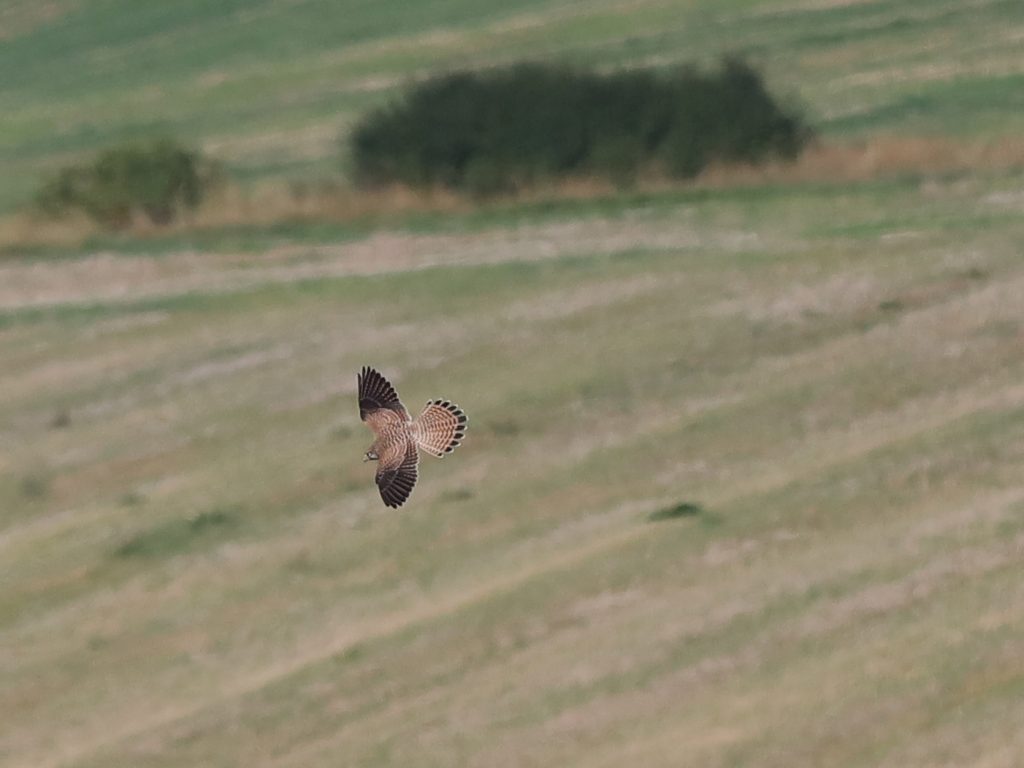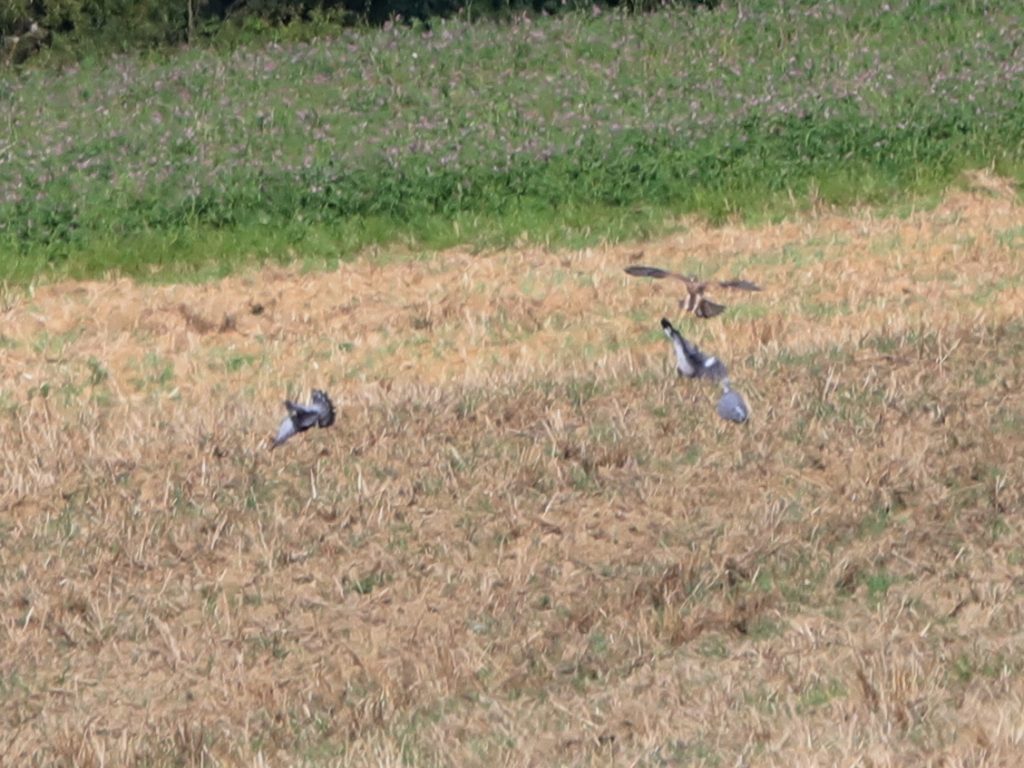 Encore au-dessus des champs de Halstroff, un Faucon crécerelle a tenté plusieurs chasses, dont une attaque ratée sur des Pigeons ramiers.