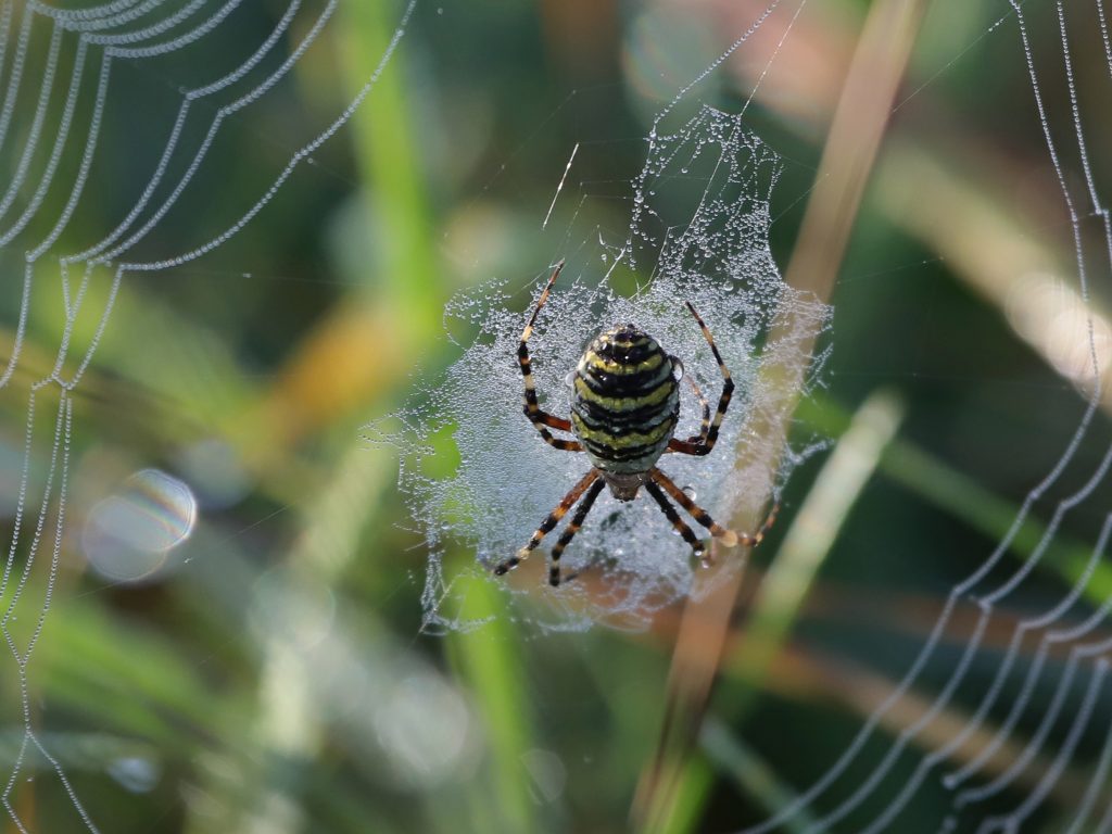 J’espère ne pas heurter des arachnophobes avec les images qui suivent mais la rosée matinale sur l’Argiope frelon – classée Epeire par le Museum d’Histoire Naturelle – est tout de même magnifique ! Quand à l’Epeire diadème au joli motif dorsal, ce n’est pas l’araignée de Tintin dans « l’Ile mystérieuse » car la bestiole dessinée par Hergé serait selon certains une Epeire fasciée. Reprenez vos classiques.