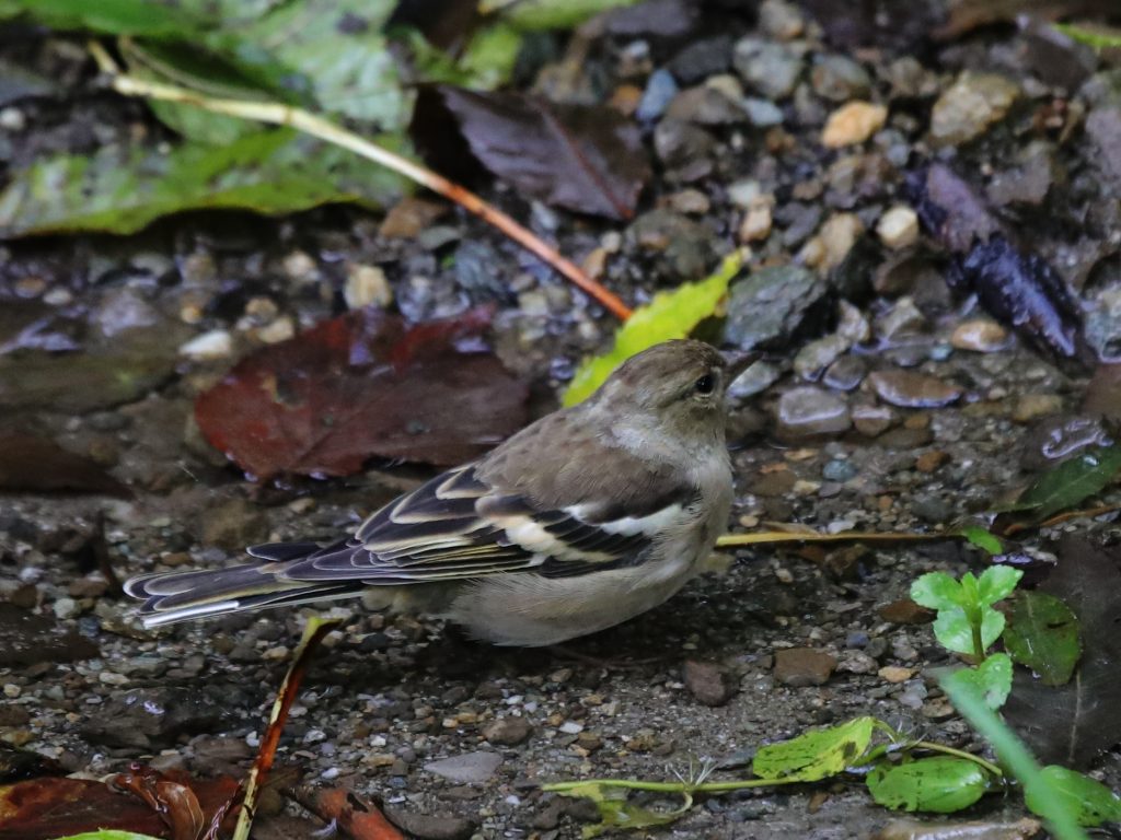 Pinson des arbres, femelle en premier puis mâle avec la gorge rose. Sur la dernière photo, le Pinson partage sa flaque avec un Gobemouche noir.