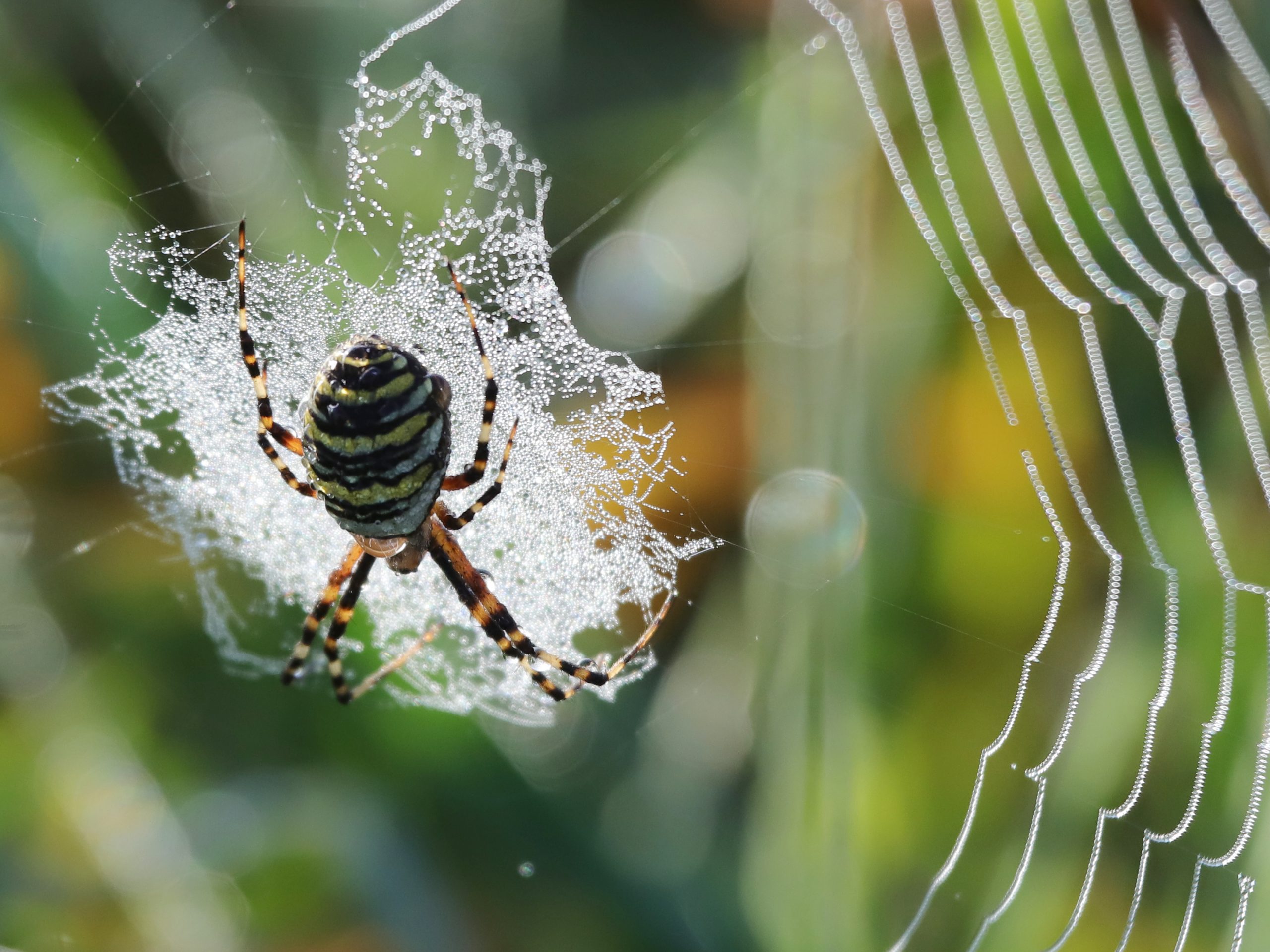 J’espère ne pas heurter des arachnophobes avec les images qui suivent mais la rosée matinale sur l’Argiope frelon – classée Epeire par le Museum d’Histoire Naturelle – est tout de même magnifique ! Quand à l’Epeire diadème au joli motif dorsal, ce n’est pas l’araignée de Tintin dans « l’Ile mystérieuse » car la bestiole dessinée par Hergé serait selon certains une Epeire fasciée. Reprenez vos classiques.