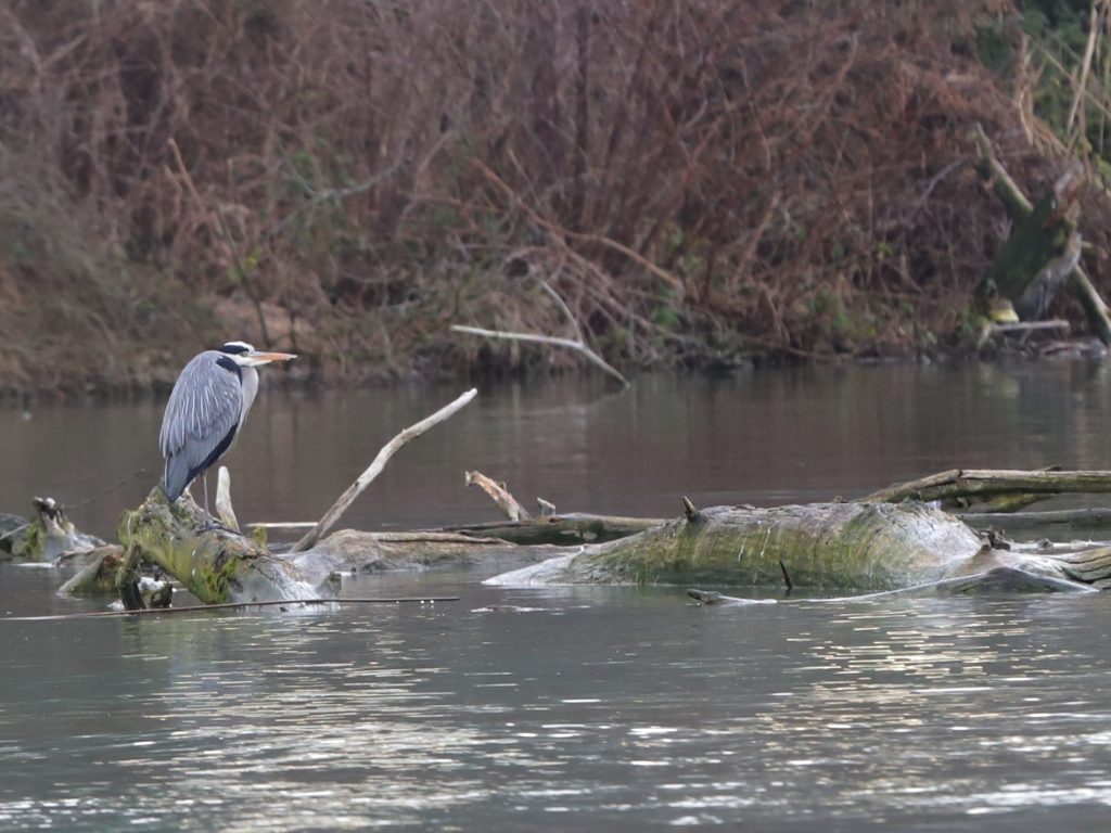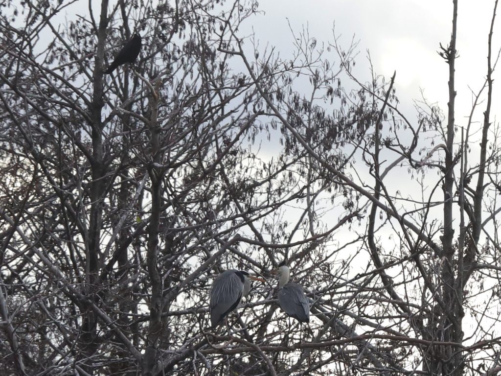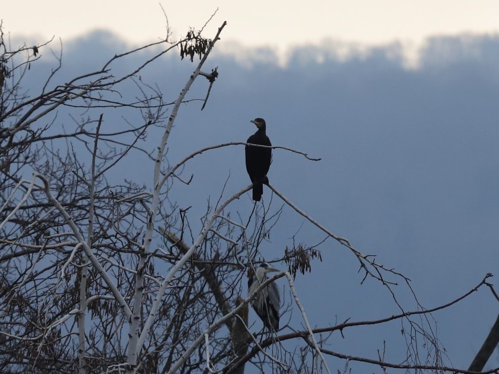 La distance ne m’a pas permis de vérifier s’il y avait échanges vocaux entre le Héron cendré et le Grand cormoran. Toujours est-il qu’on ne partage pas la même branche, tout de même.