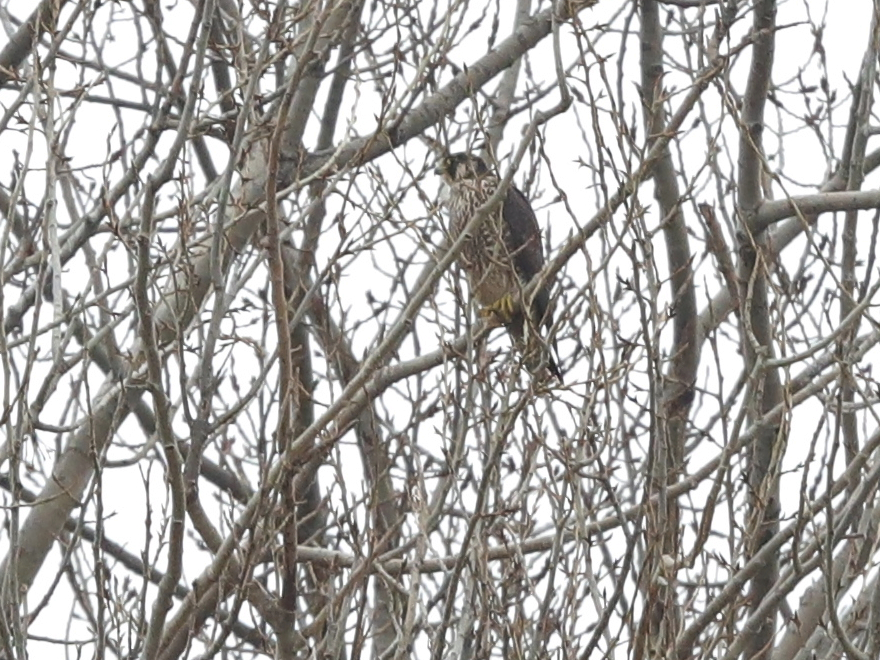 … comme ce Faucon pélerin, aux « moustaches » noires caractéristiques. Cependant, être un prédateur ne protège guère du harcèlement des corneilles. Leur méthode typique consiste à se percher autour du rapace puis de s’en rapprocher progressivement en menant de plus en plus de tapage. Résultat garanti, le rapace s’éloigne en moins de deux minutes.