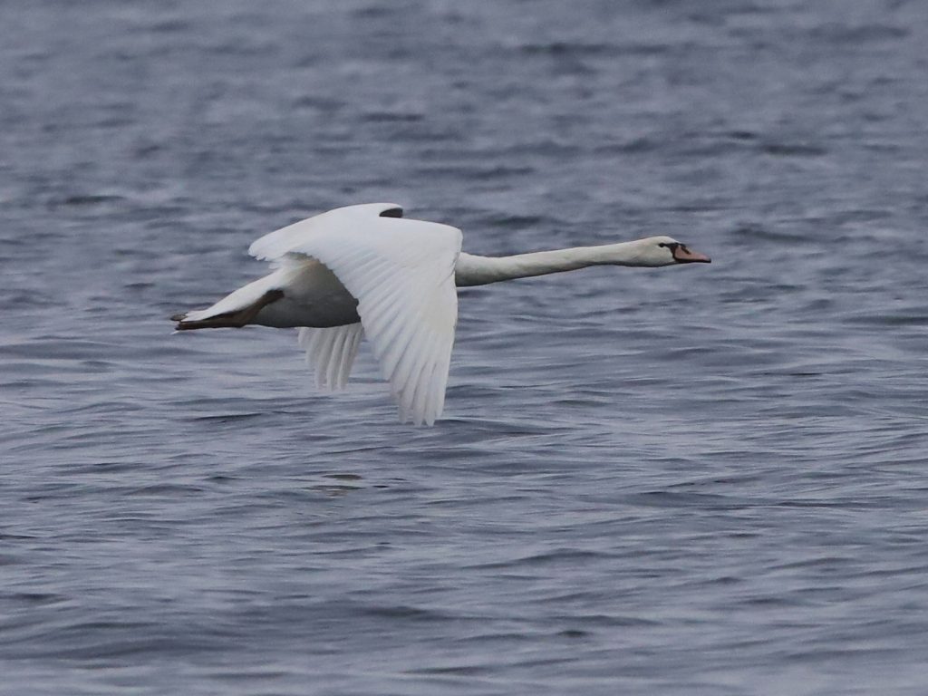 Au milieu du plan d’eau de la réserve de la Dranse, deux Cygnes tuberculés étaient à leur toilette matinale. Un autre oiseau à survolé le lac, l’air très affairé. Le cygne en vol s’entend d’assez loin, les plumes produisant un sifflement très particulier.