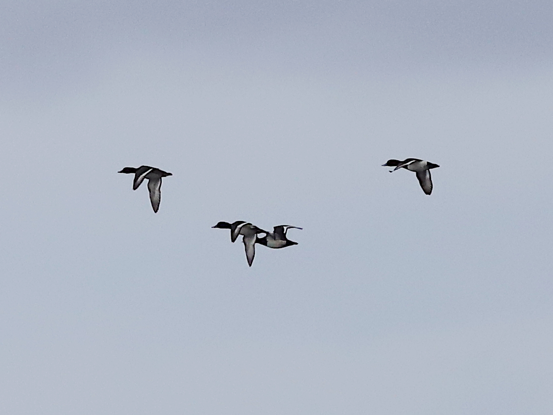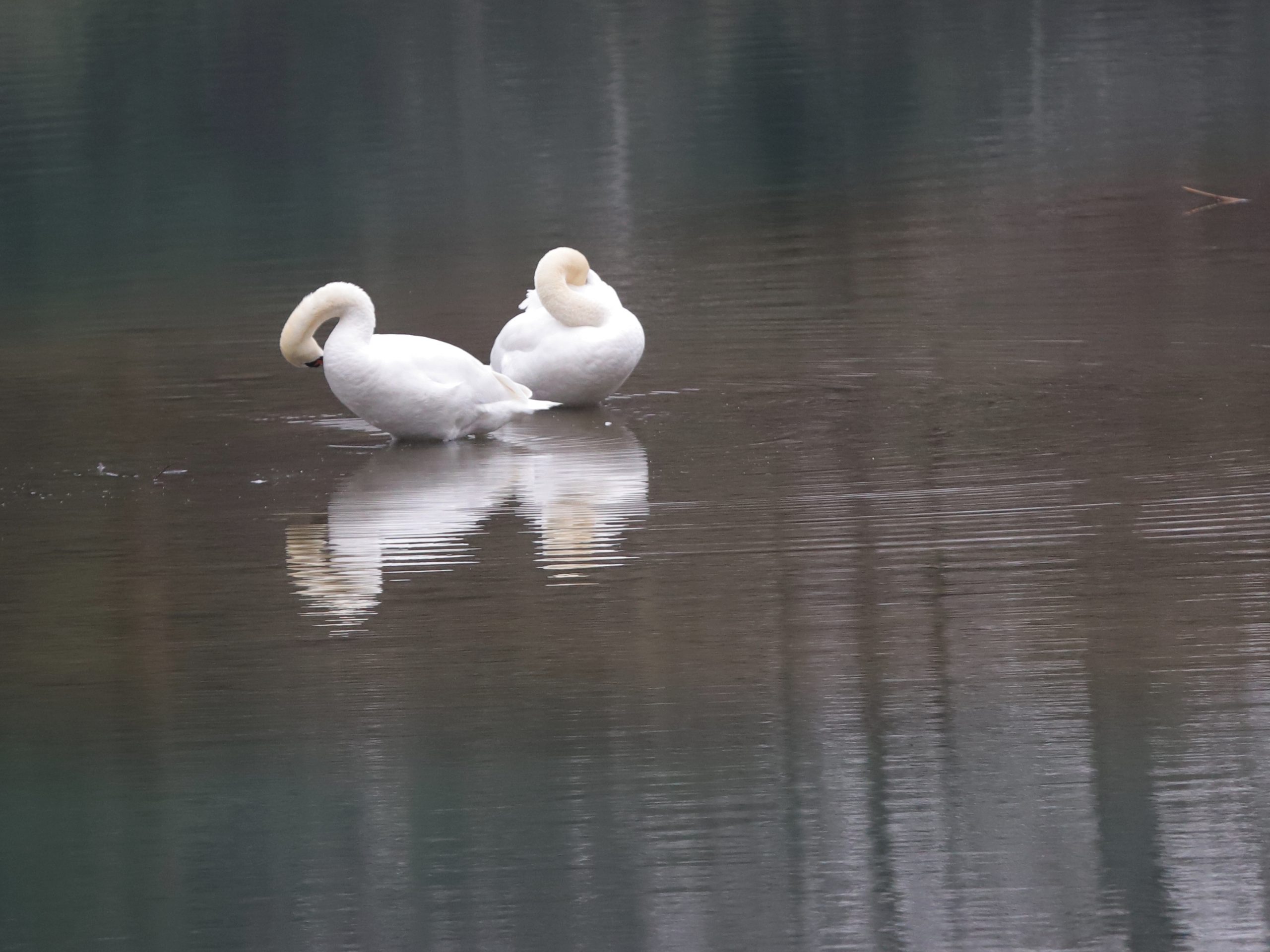 Au milieu du plan d’eau de la réserve de la Dranse, deux Cygnes tuberculés étaient à leur toilette matinale. Un autre oiseau à survolé le lac, l’air très affairé. Le cygne en vol s’entend d’assez loin, les plumes produisant un sifflement très particulier.