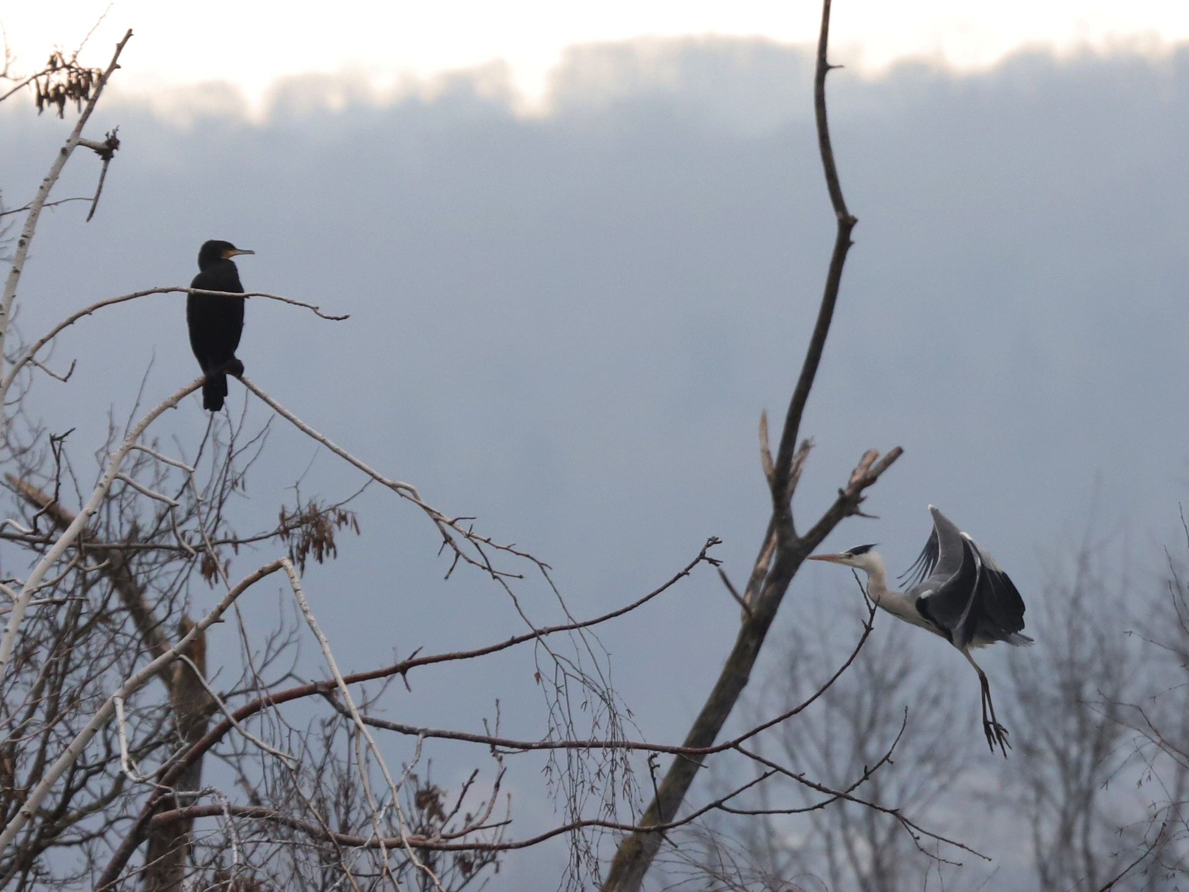 La distance ne m’a pas permis de vérifier s’il y avait échanges vocaux entre le Héron cendré et le Grand cormoran. Toujours est-il qu’on ne partage pas la même branche, tout de même.