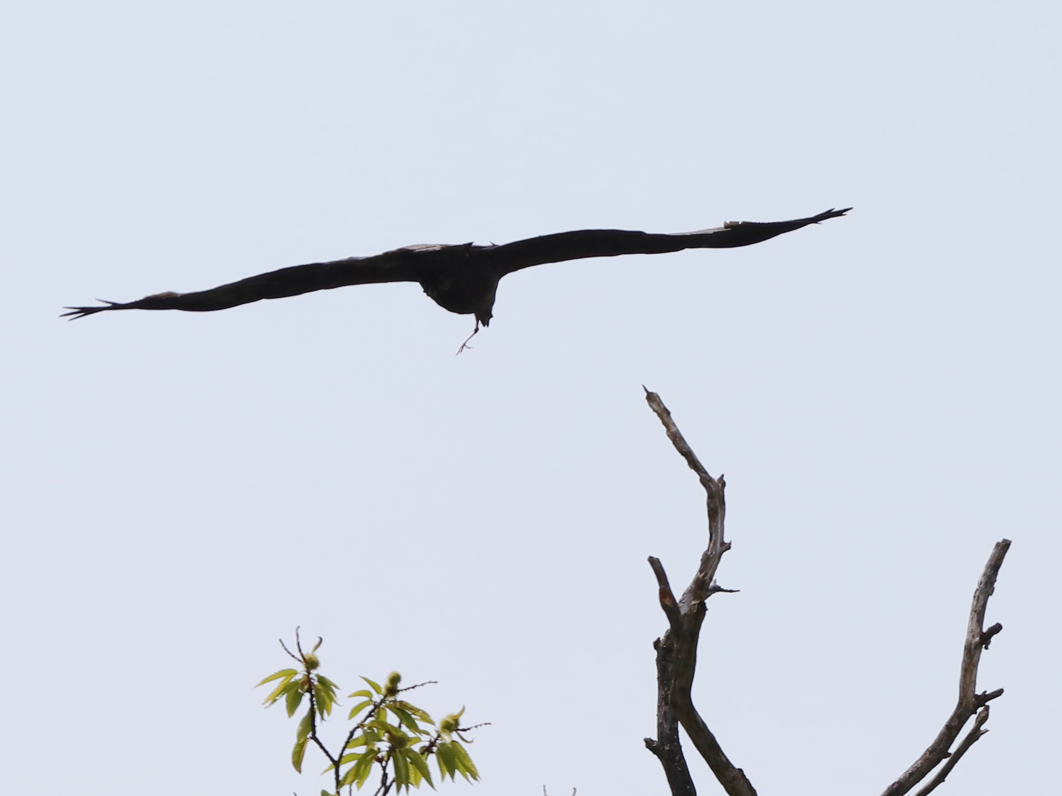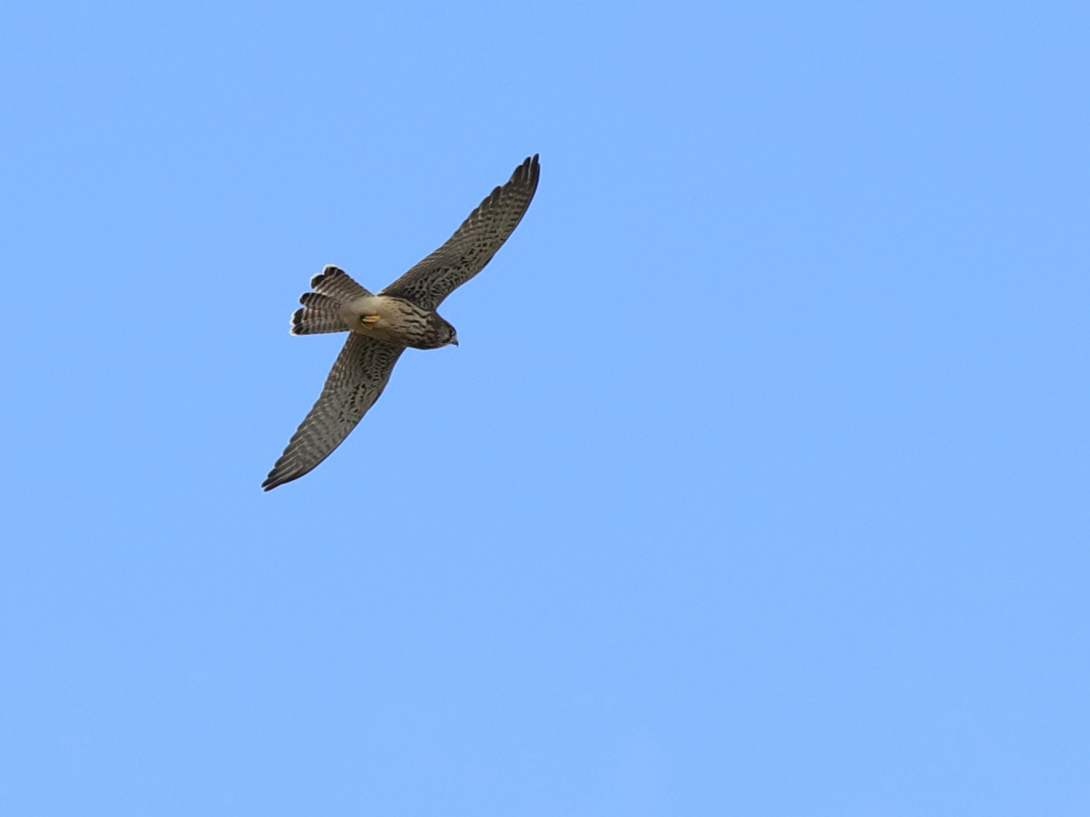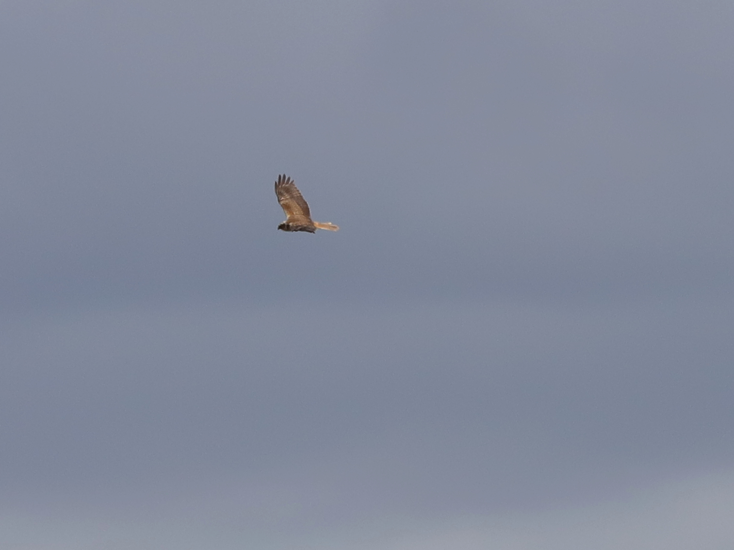 Bien entendu, les photos de l’individu en vol sont plus lointaines que souhaitées. Les motifs sur et sous les ailes sont ceux d’un individu « subadulte », soit de 3 ans, si j’ai bien compris les subtilités de comptage des âges. En dernière image, il est survolé par un faucon, difficile à identifier.