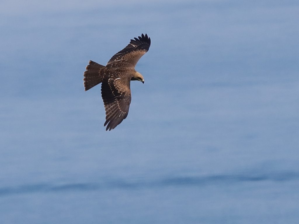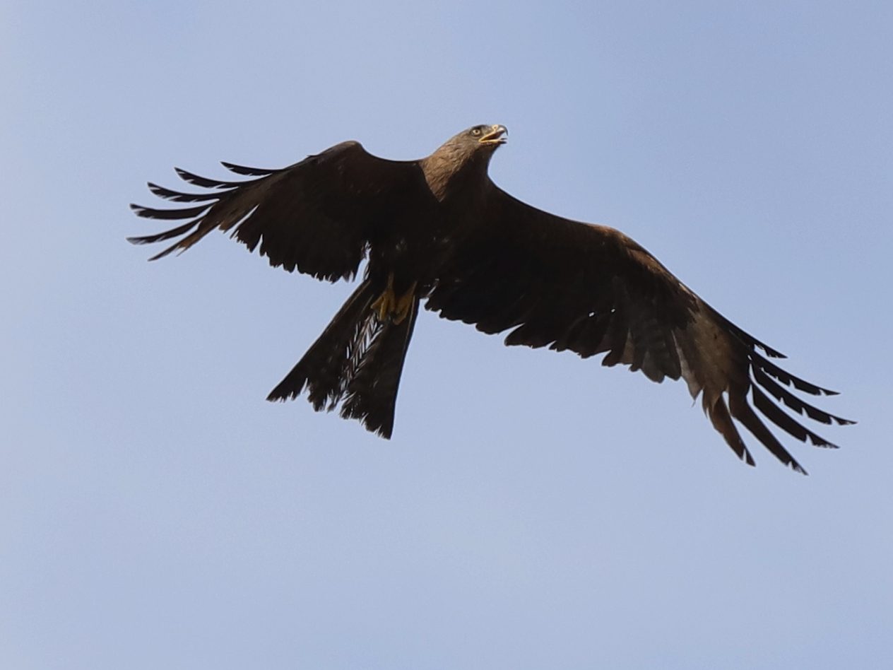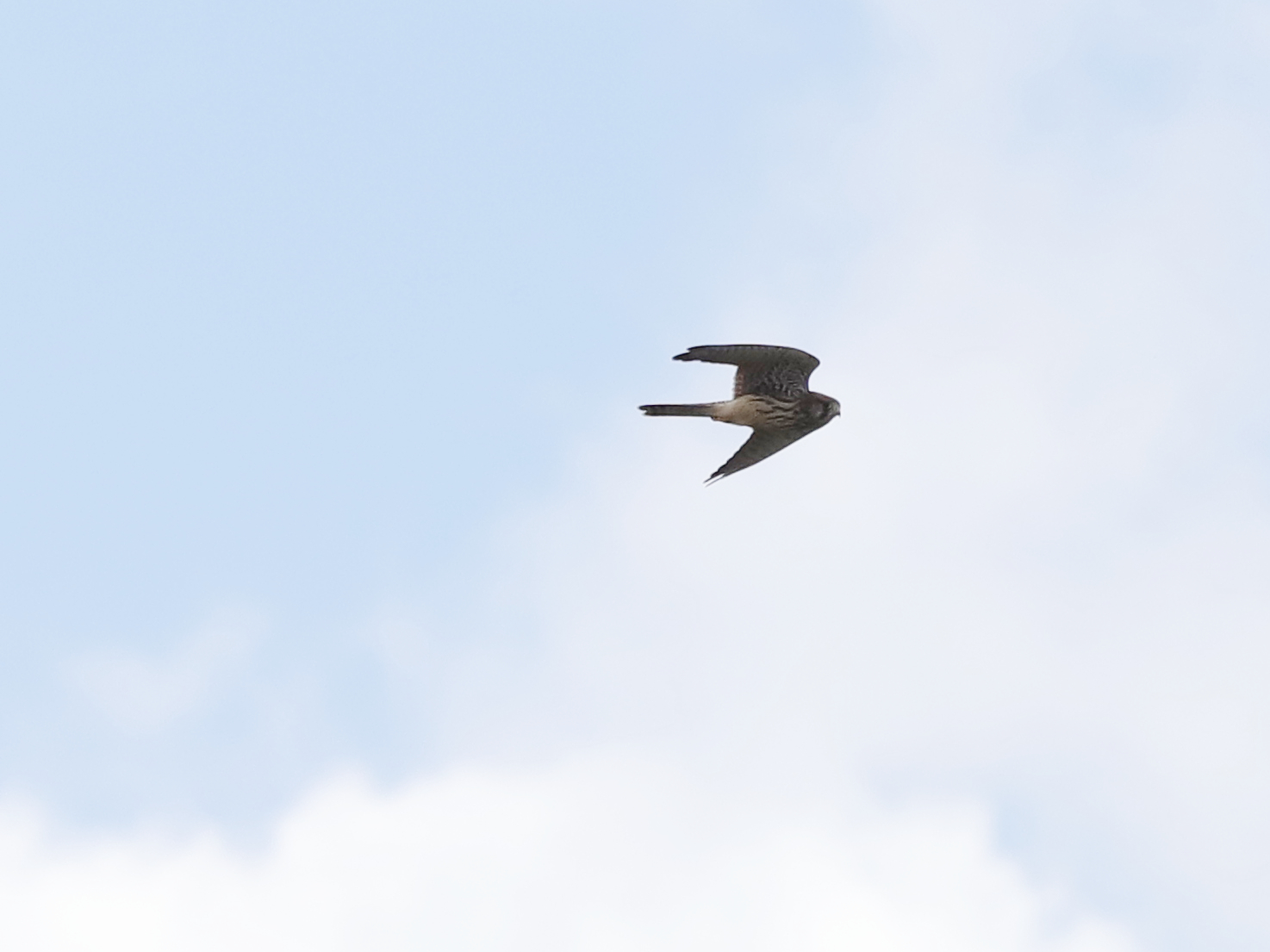 Bien entendu, les photos de l’individu en vol sont plus lointaines que souhaitées. Les motifs sur et sous les ailes sont ceux d’un individu « subadulte », soit de 3 ans, si j’ai bien compris les subtilités de comptage des âges. En dernière image, il est survolé par un faucon, difficile à identifier.