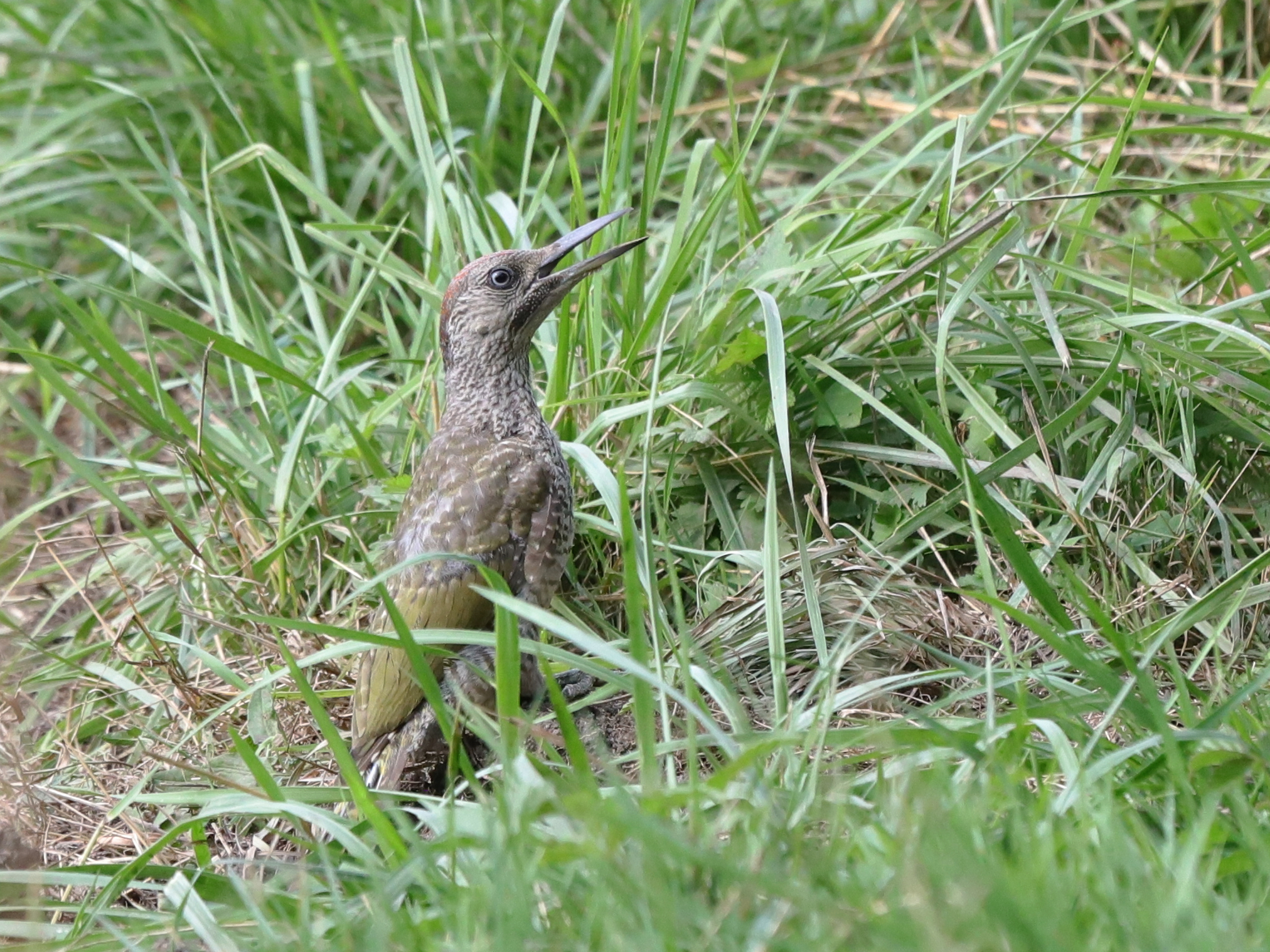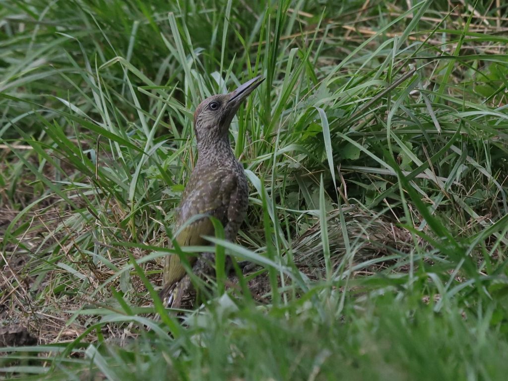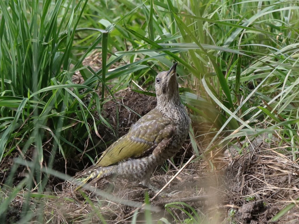 Un jeune Pic vert est resté au loin, préférant boire dans une flaque au milieu des prés.