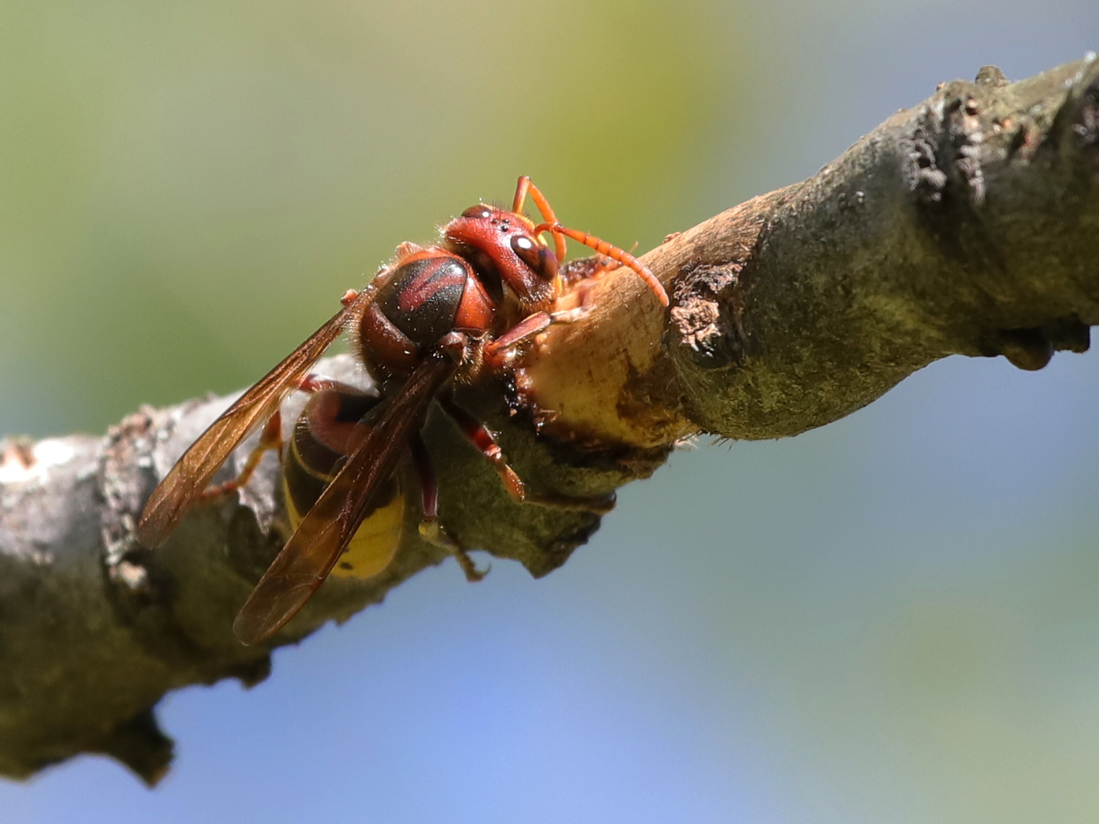 La chaleur des journées est aussi favorable aux insectes et le va-et-vient incessant de frelons m’a incité à y regarder de plus près. Une équipe de plusieurs frelons se relaye pour grignoter l’écorce d’un rameau de frêne. C’est probablement ainsi qu’ils produisent la cellulose pour fabriquer leur nid.