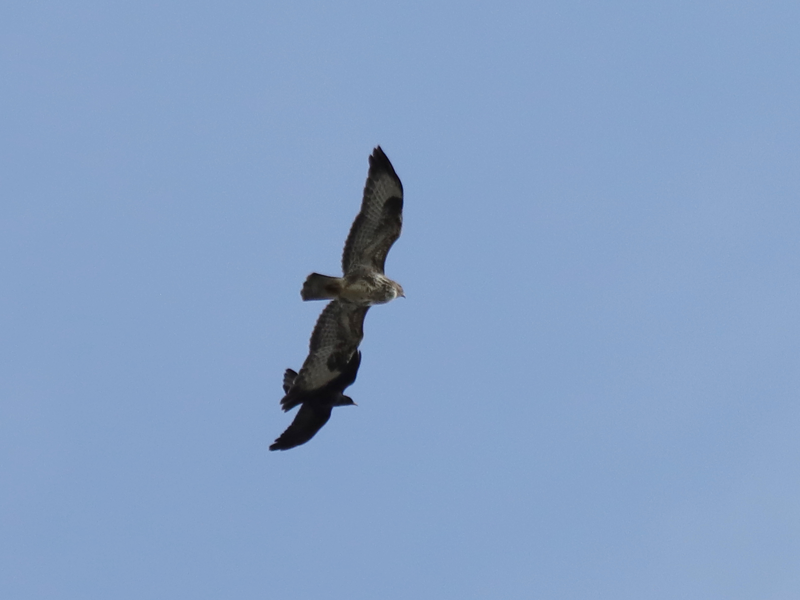 … mais quand survient un intrus comme une Buse variable, toute la troupe se rassemble pour le faire déguerpir.