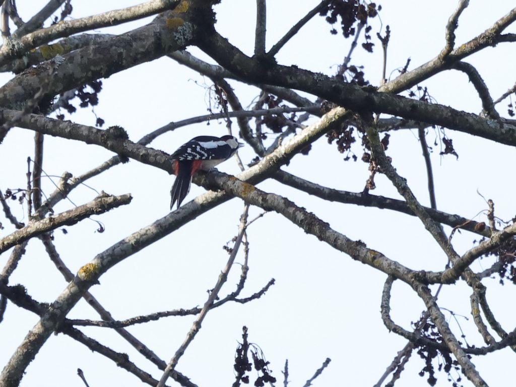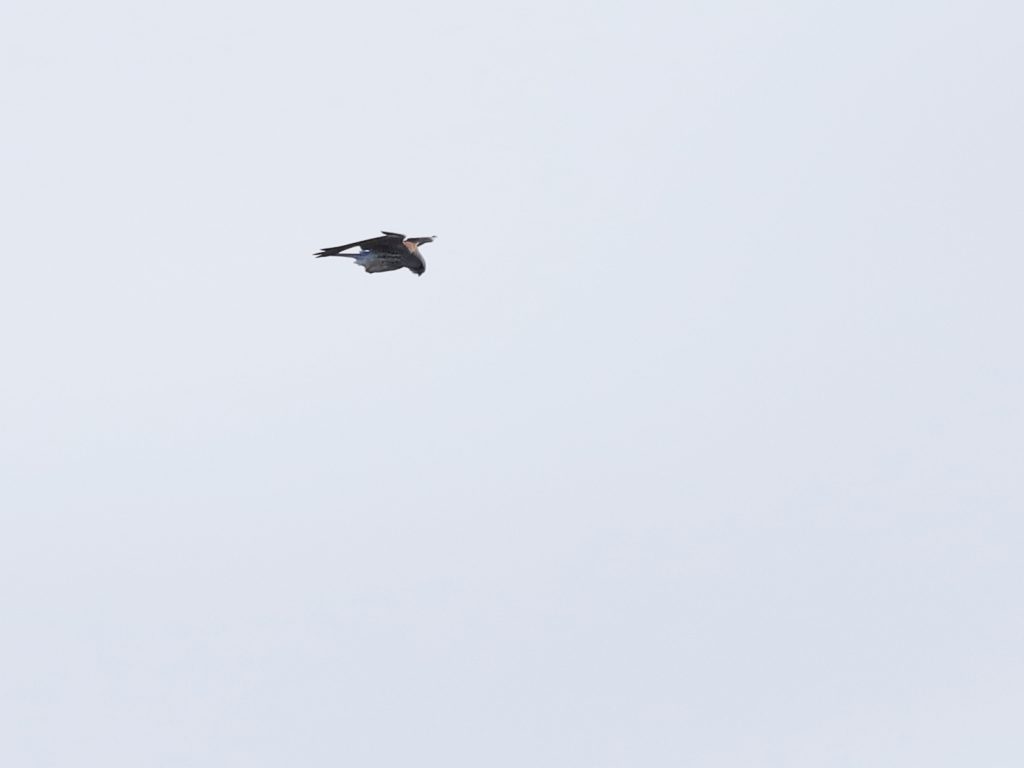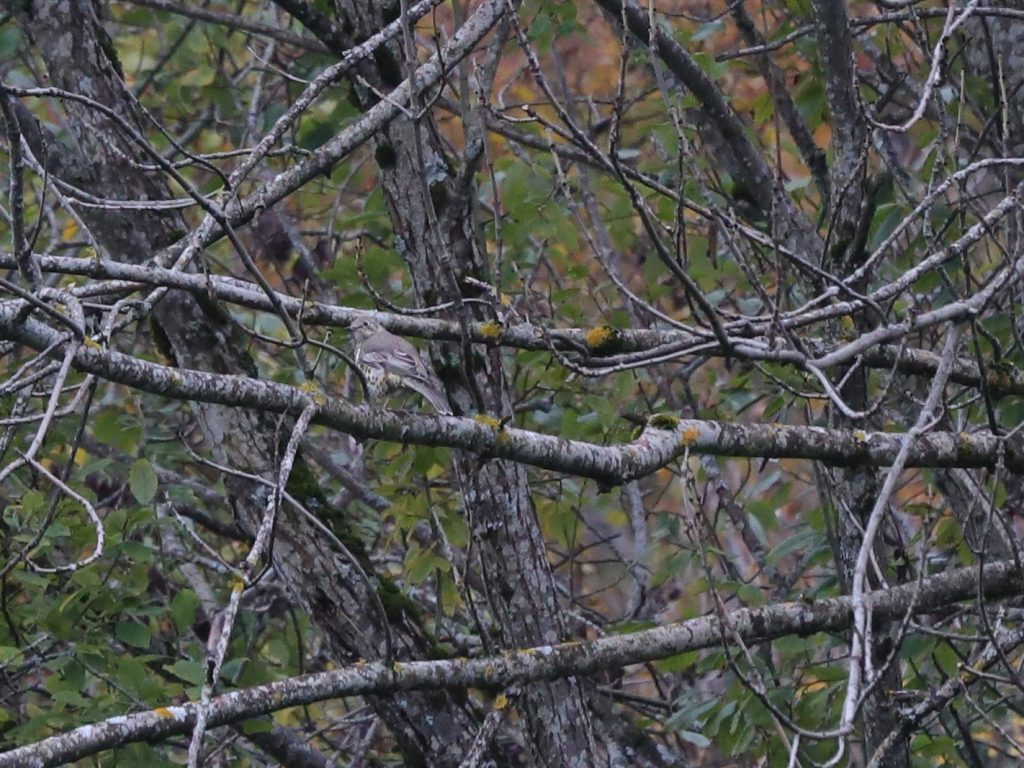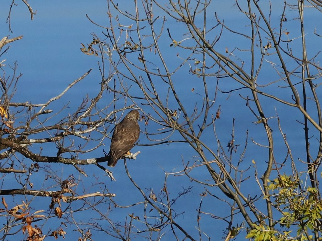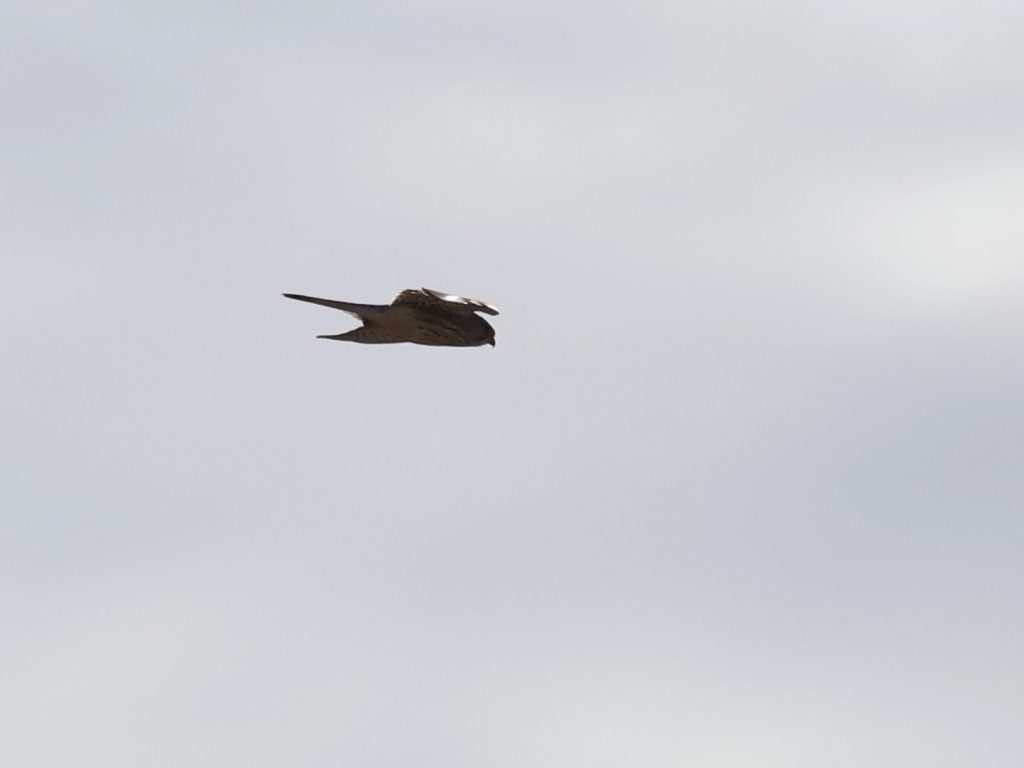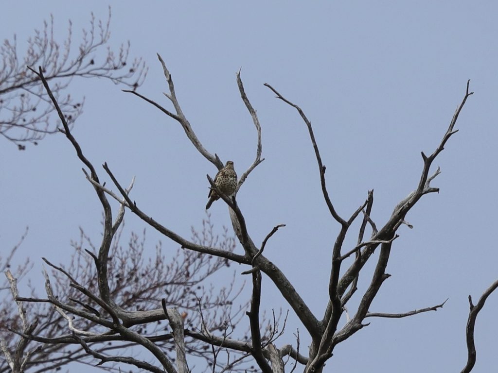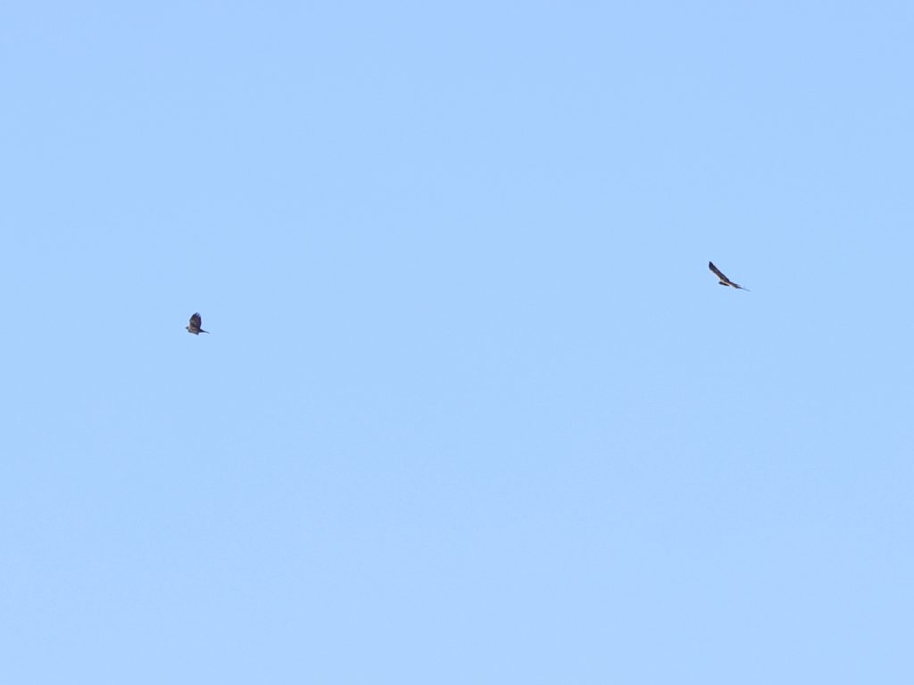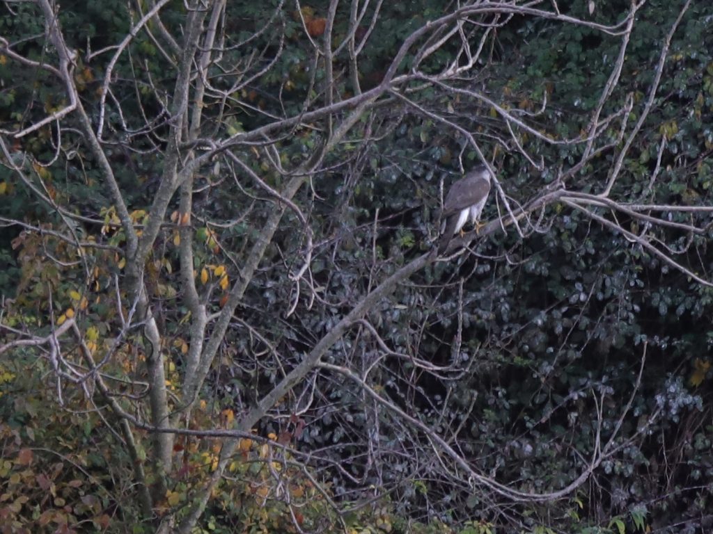 La voici, la menace. Je penche pour un Autour des palombes, femelle. Comme la tête est masquée par une branche et que l’oiseau était très loin, ce pourrait aussi être un Epervier d’Europe. Je reste dans le doute.