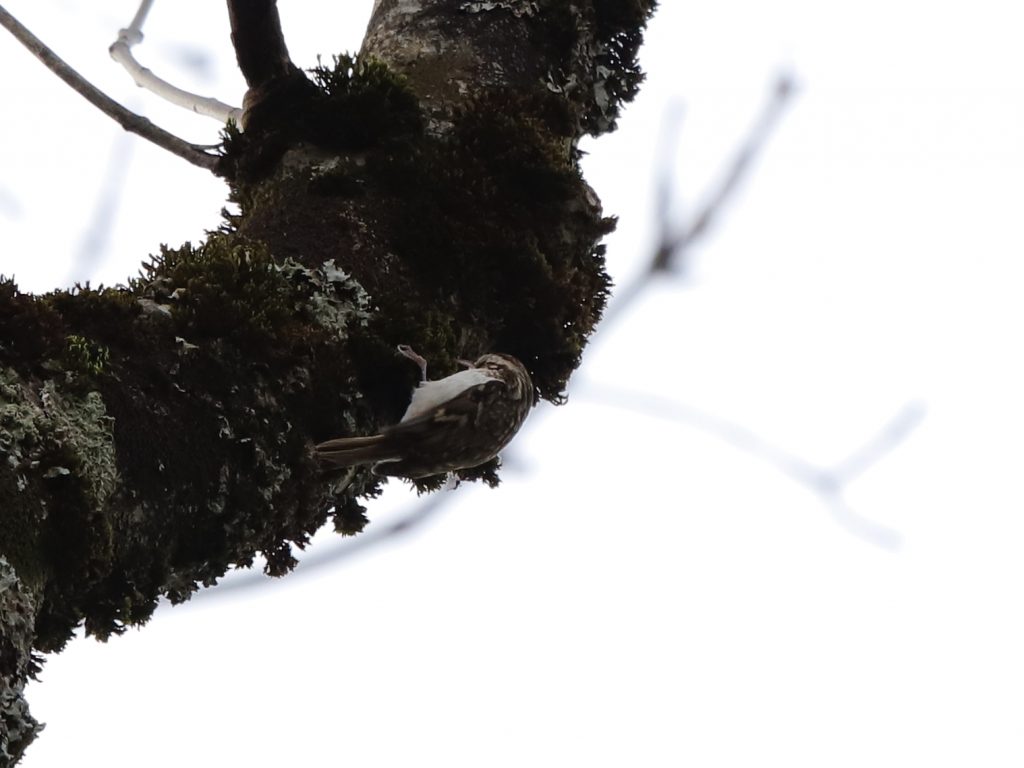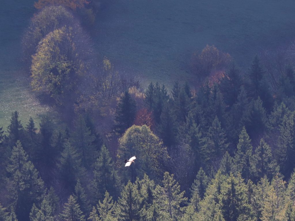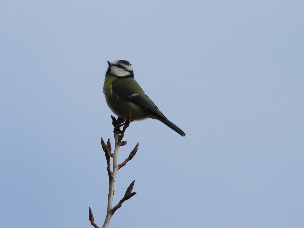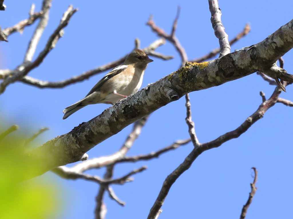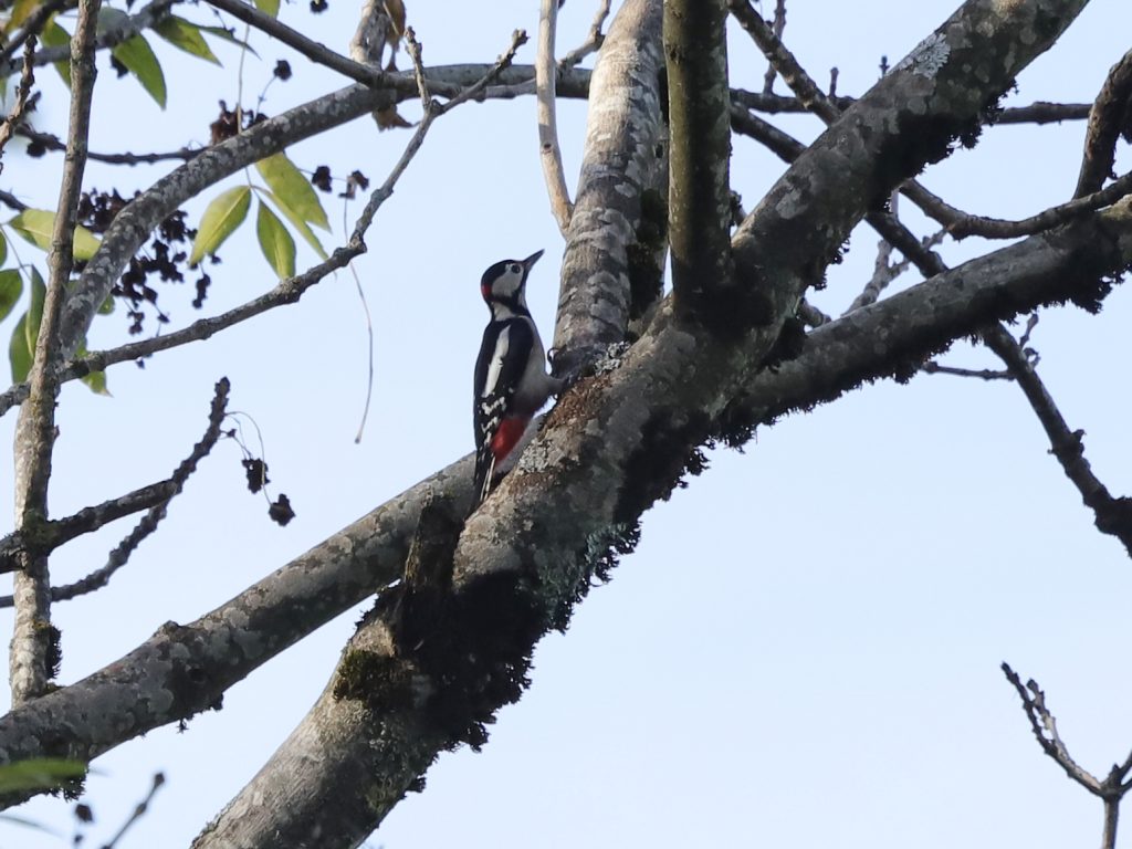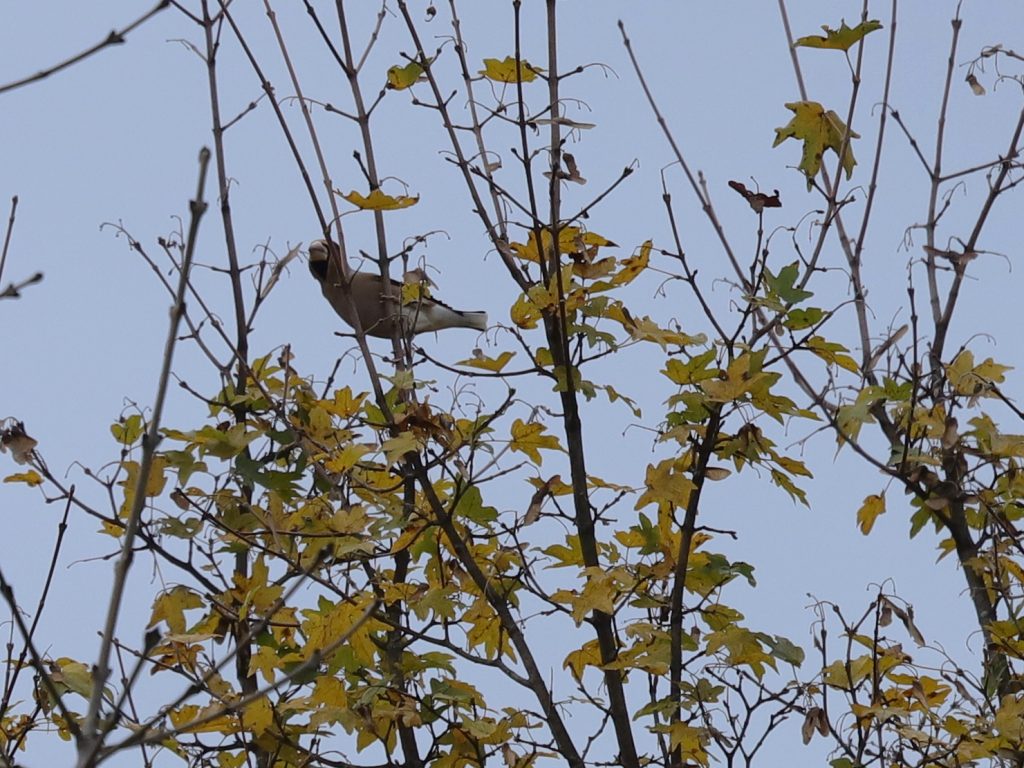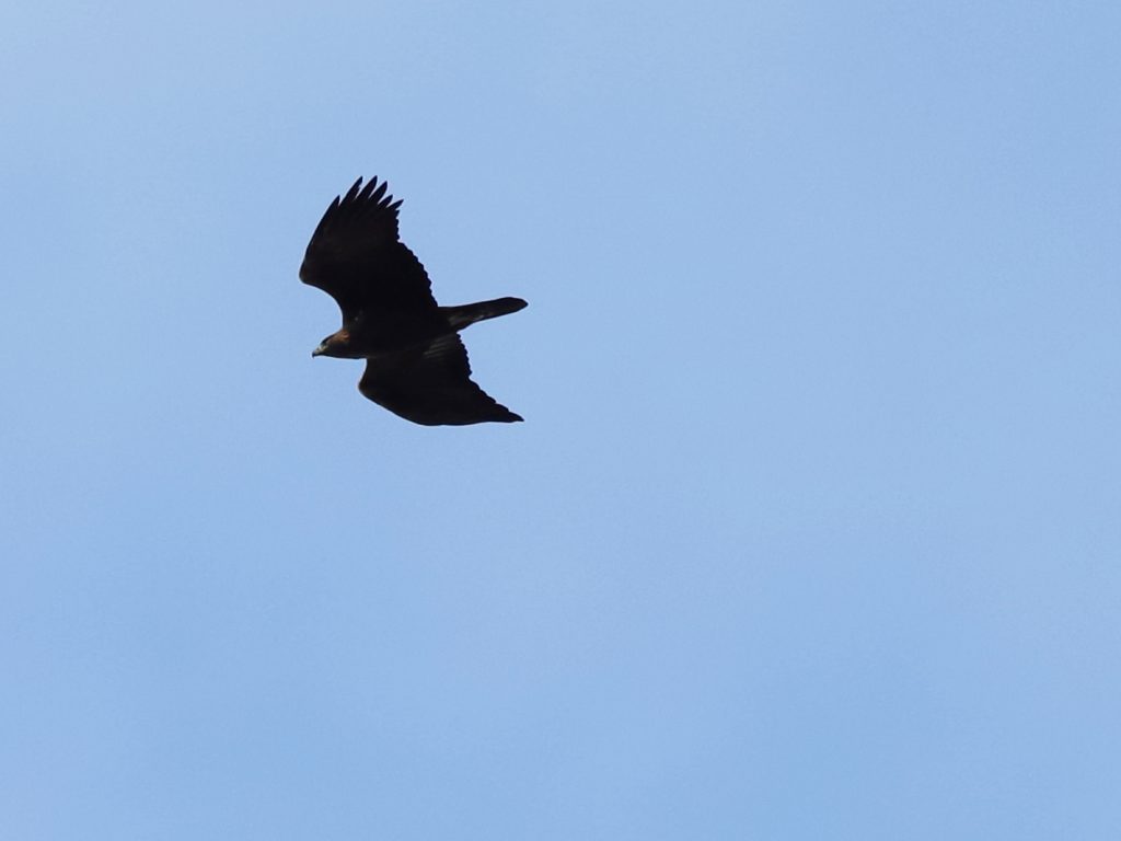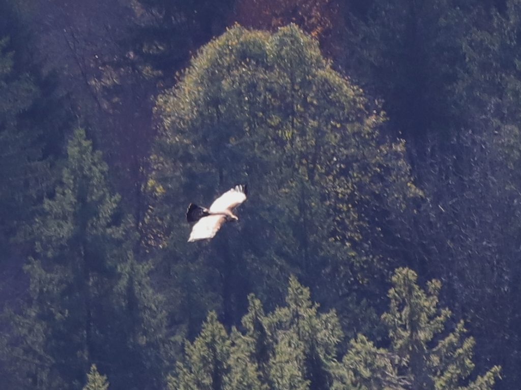 La voici, la menace. Je penche pour un Autour des palombes, femelle. Comme la tête est masquée par une branche et que l’oiseau était très loin, ce pourrait aussi être un Epervier d’Europe. Je reste dans le doute.