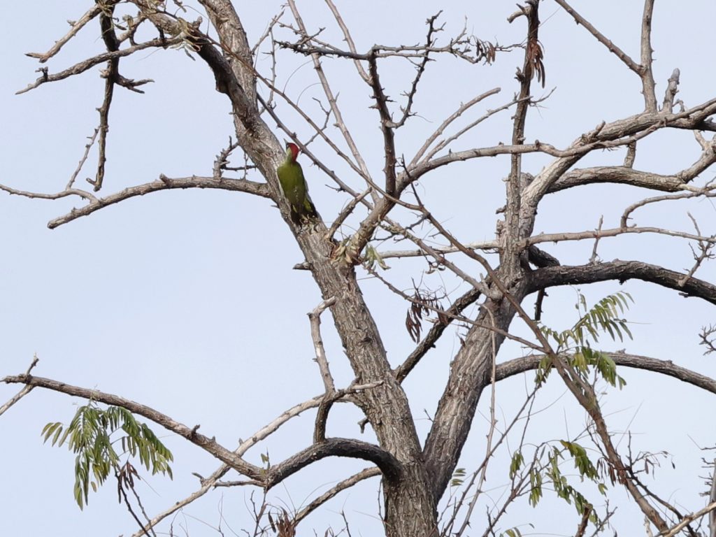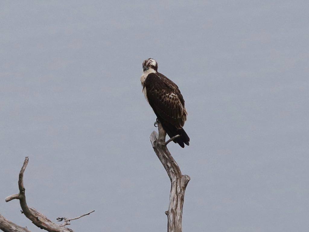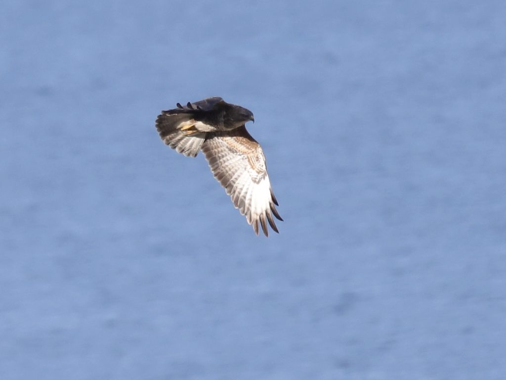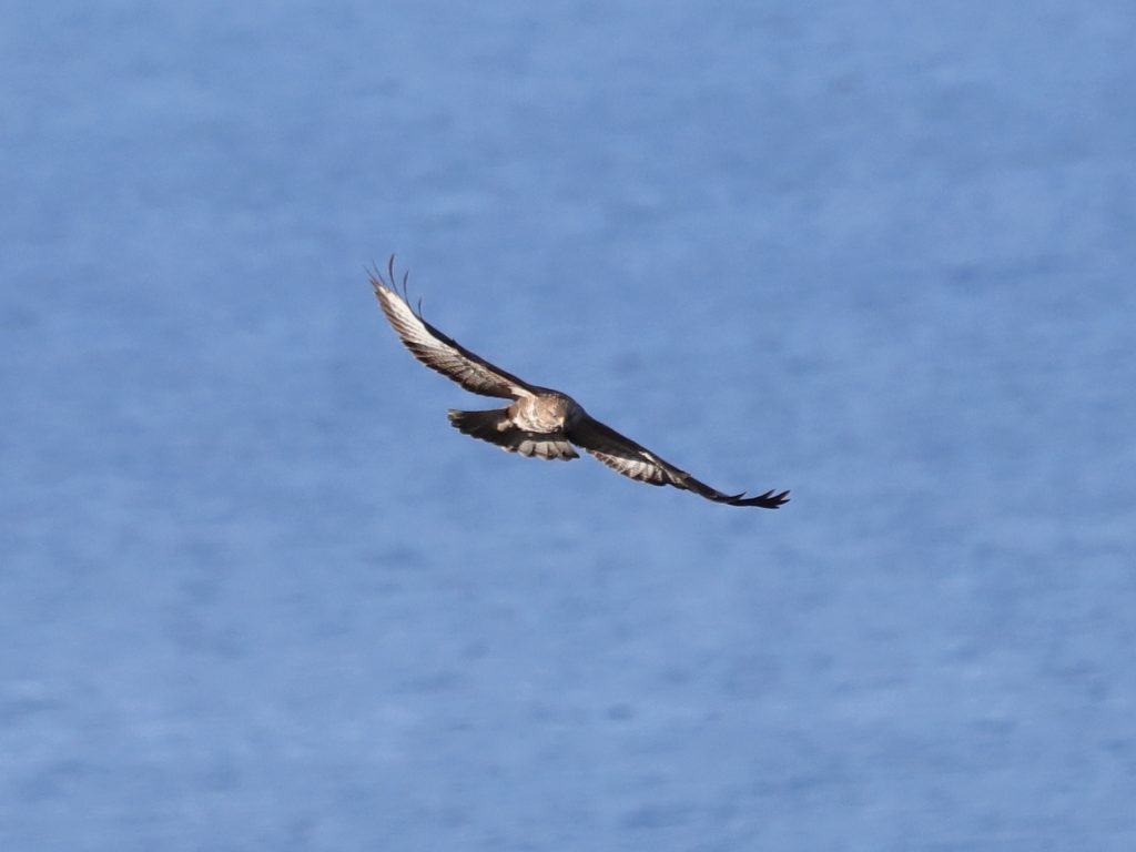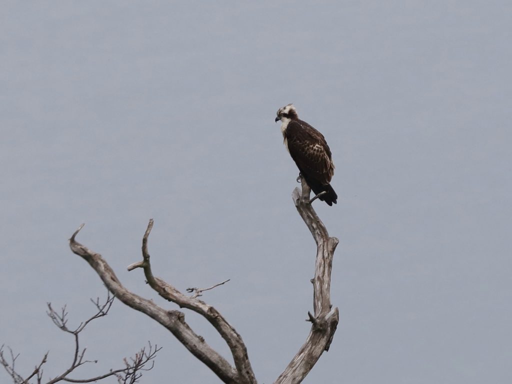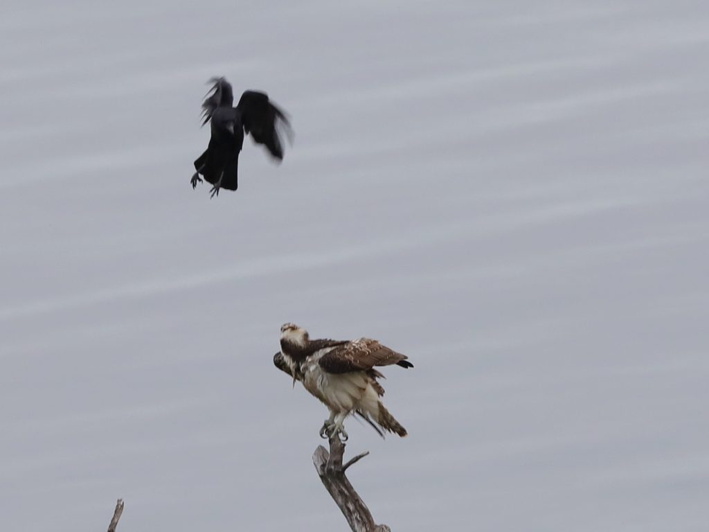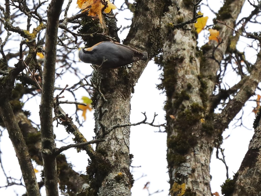 La voici, la menace. Je penche pour un Autour des palombes, femelle. Comme la tête est masquée par une branche et que l’oiseau était très loin, ce pourrait aussi être un Epervier d’Europe. Je reste dans le doute.