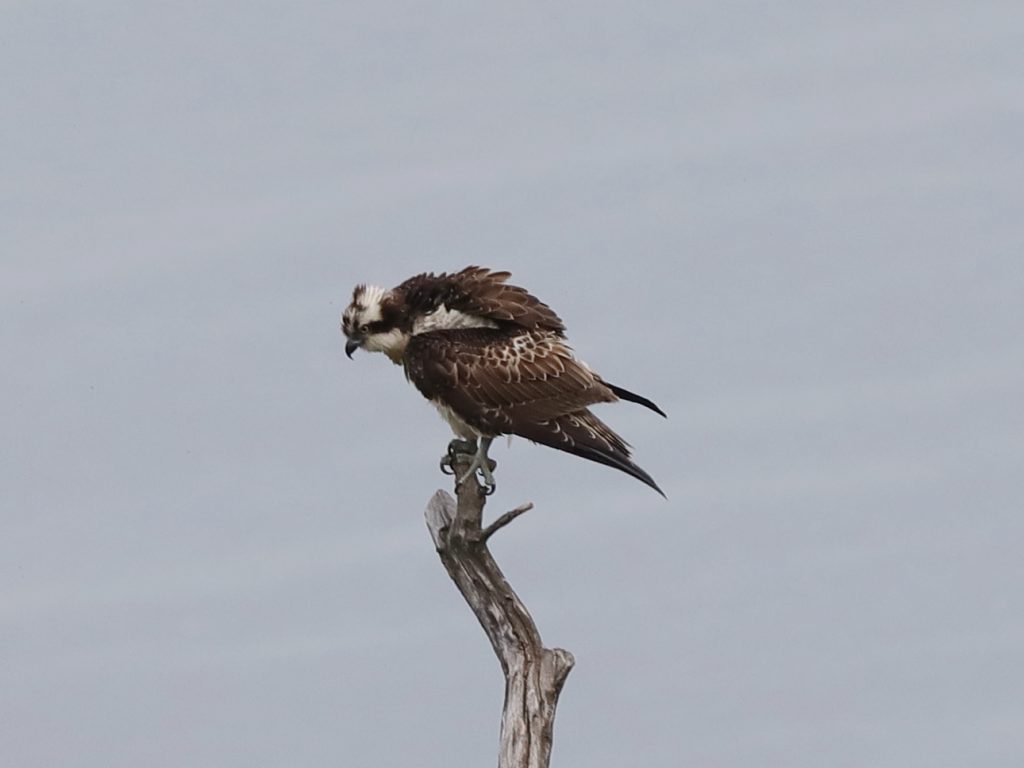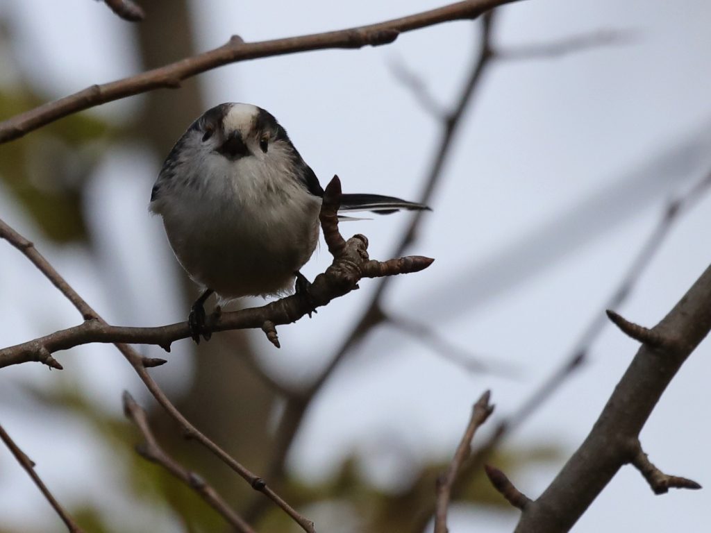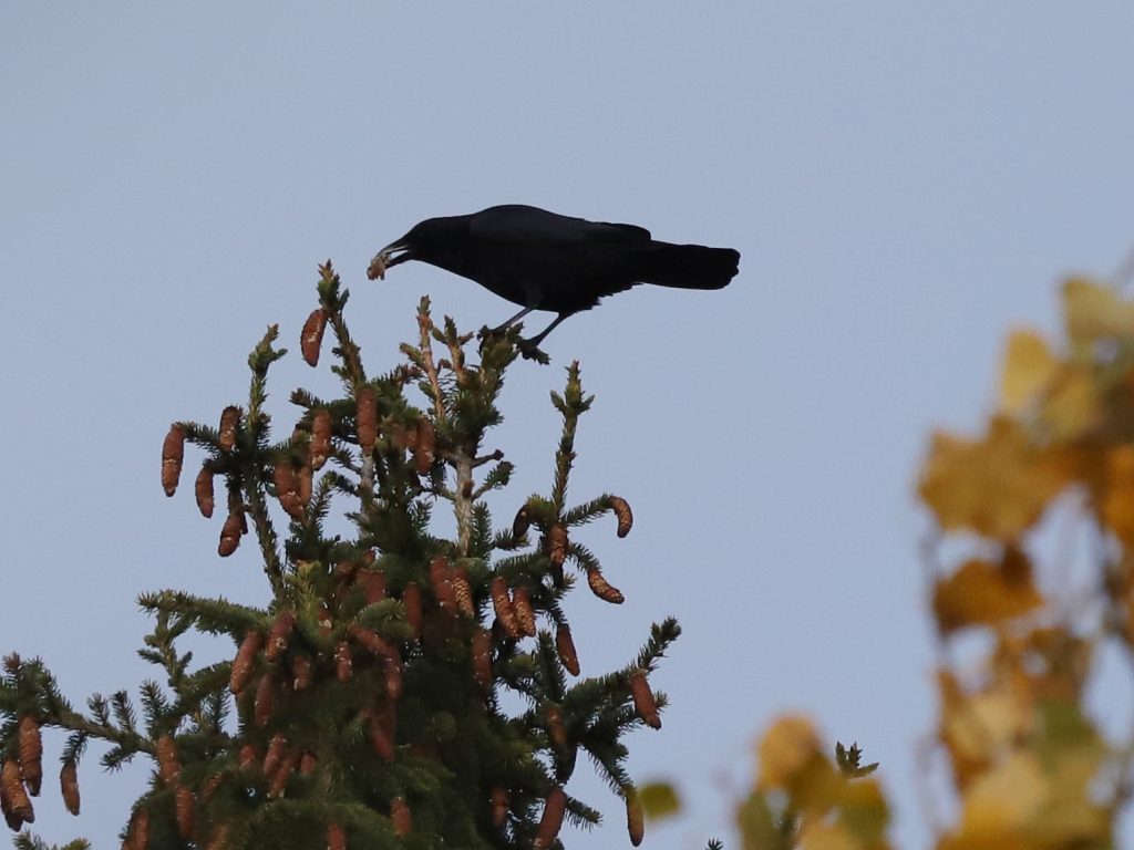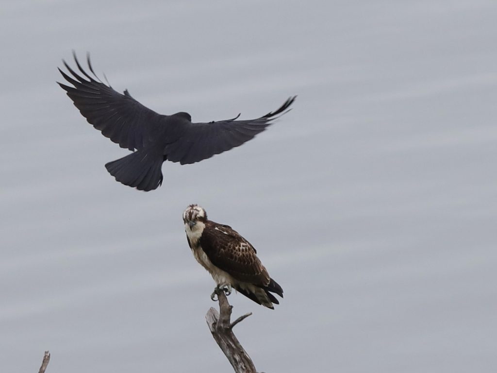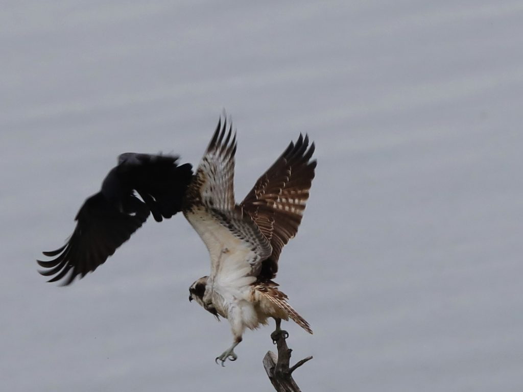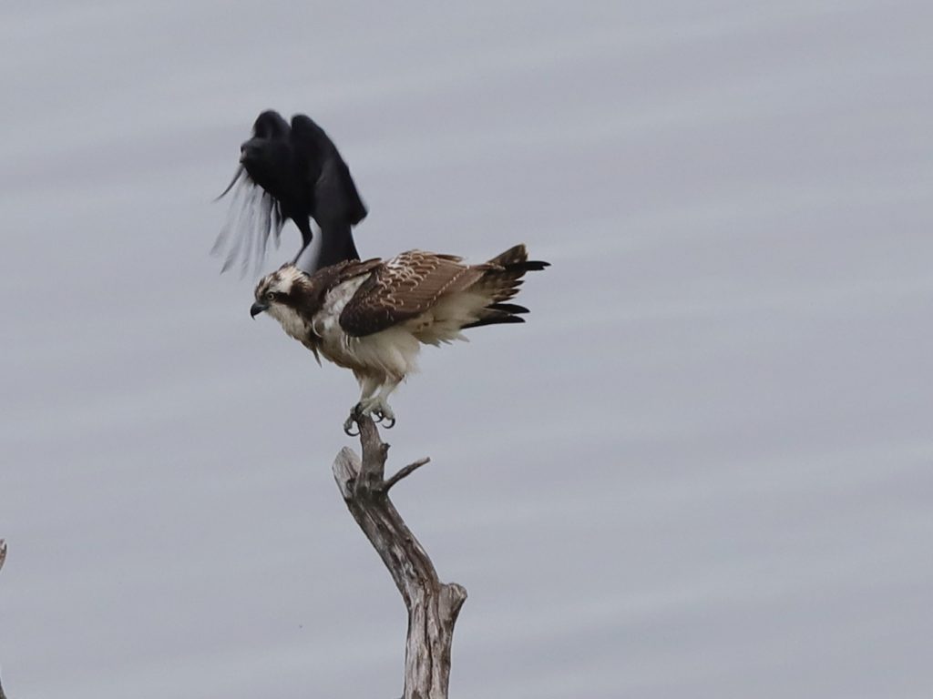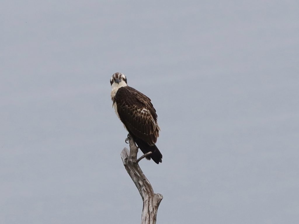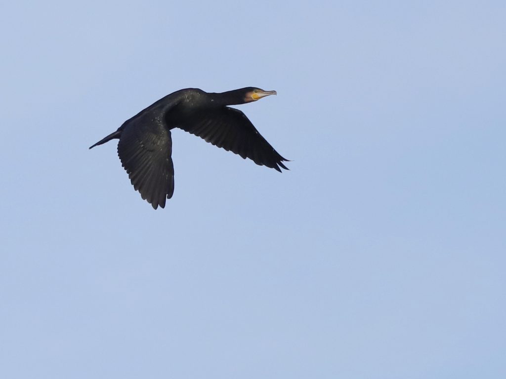 La voici, la menace. Je penche pour un Autour des palombes, femelle. Comme la tête est masquée par une branche et que l’oiseau était très loin, ce pourrait aussi être un Epervier d’Europe. Je reste dans le doute.