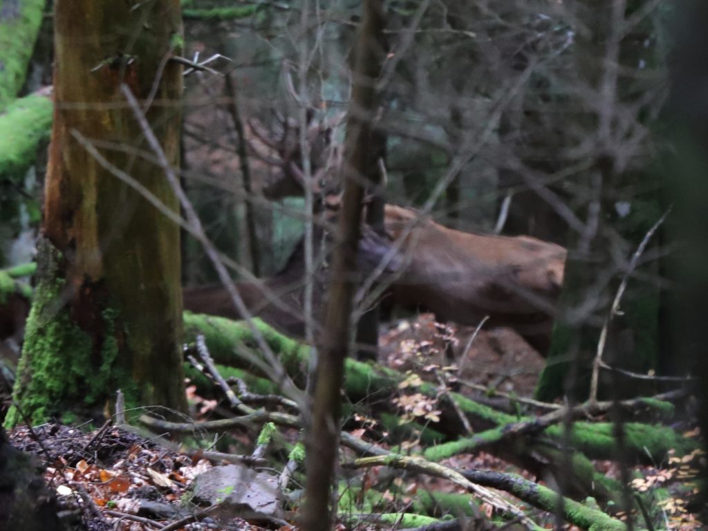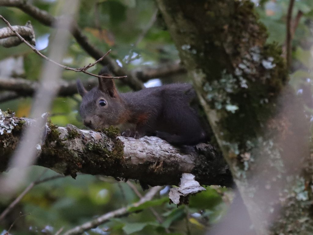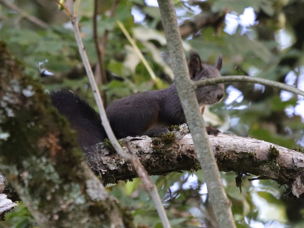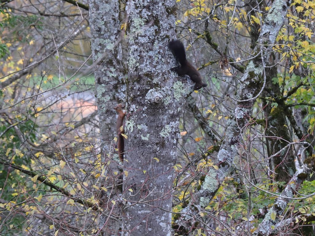 Ceux là aussi étaient trop mobiles pour la photo : deux Ecureuils roux se pourchassaient, probablement pour la noix qu’a trouvé celui de gauche. En passant, la photo montre la variation importante de couleur du pelage selon les individus de la même espèce.
