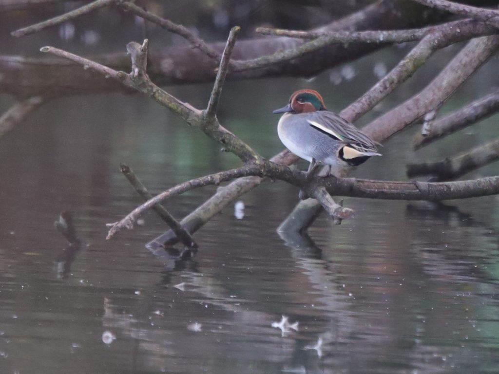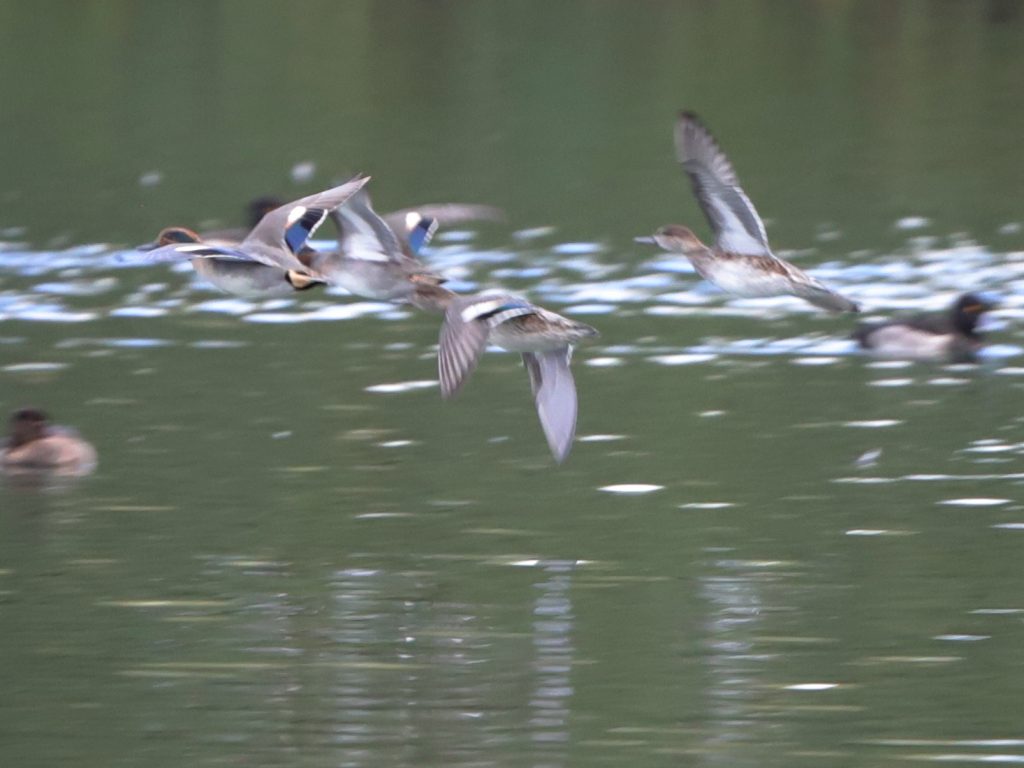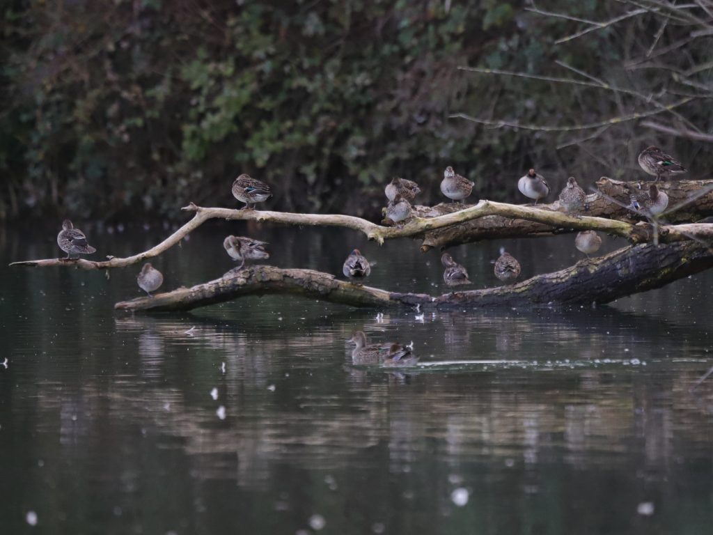 … et un groupe de Sarcelles d’hiver. Le mâle est aisément reconnaissable à sa tête brun et vert mais les femelles sont plus difficiles à distinguer, par exemple, du Canard colvert.