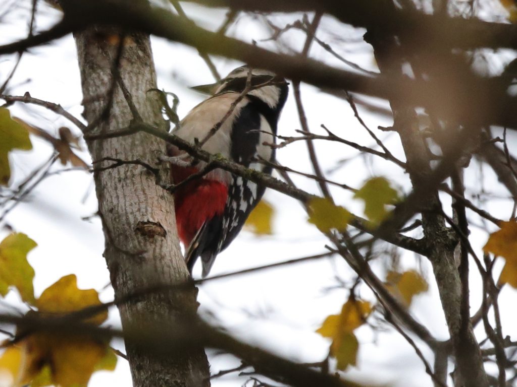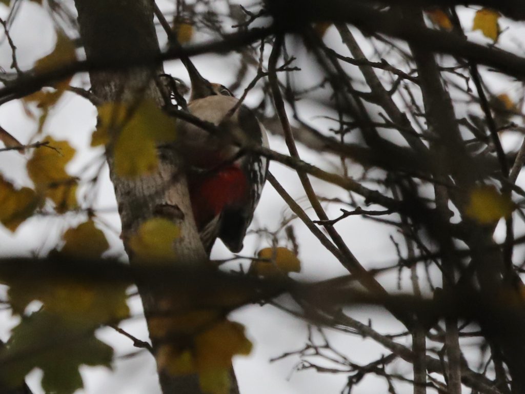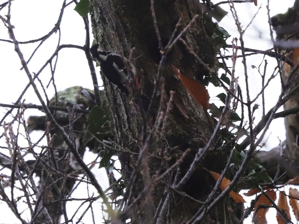 Un Pic épeiche, femelle (pas de bandeau rouge sur la nuque) …