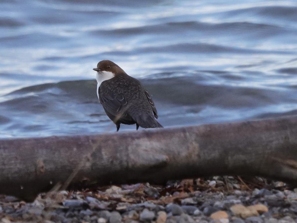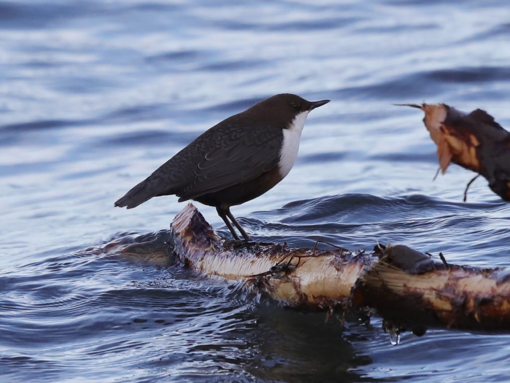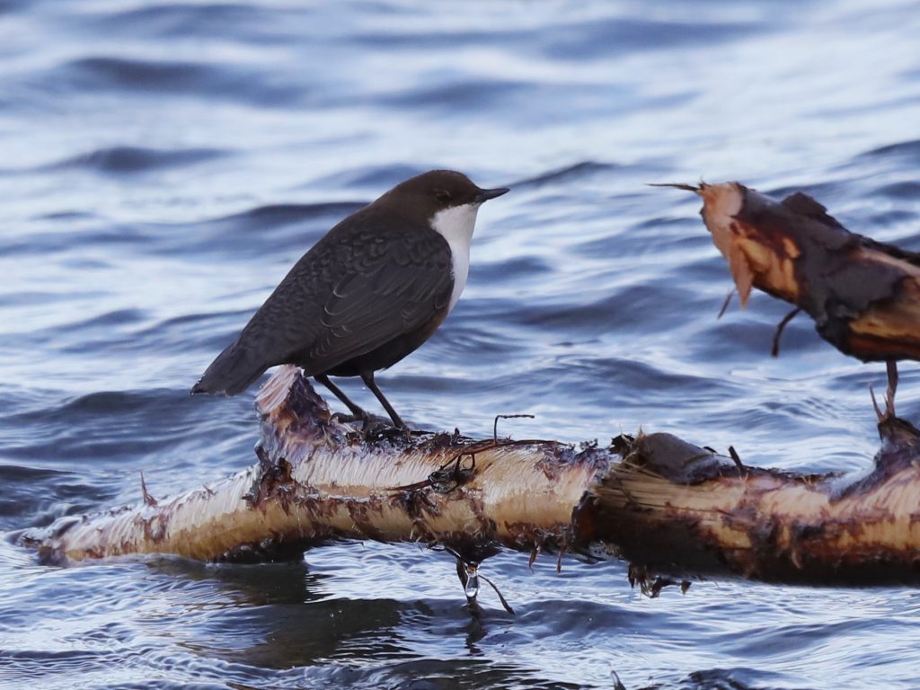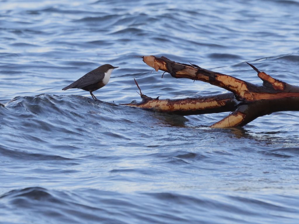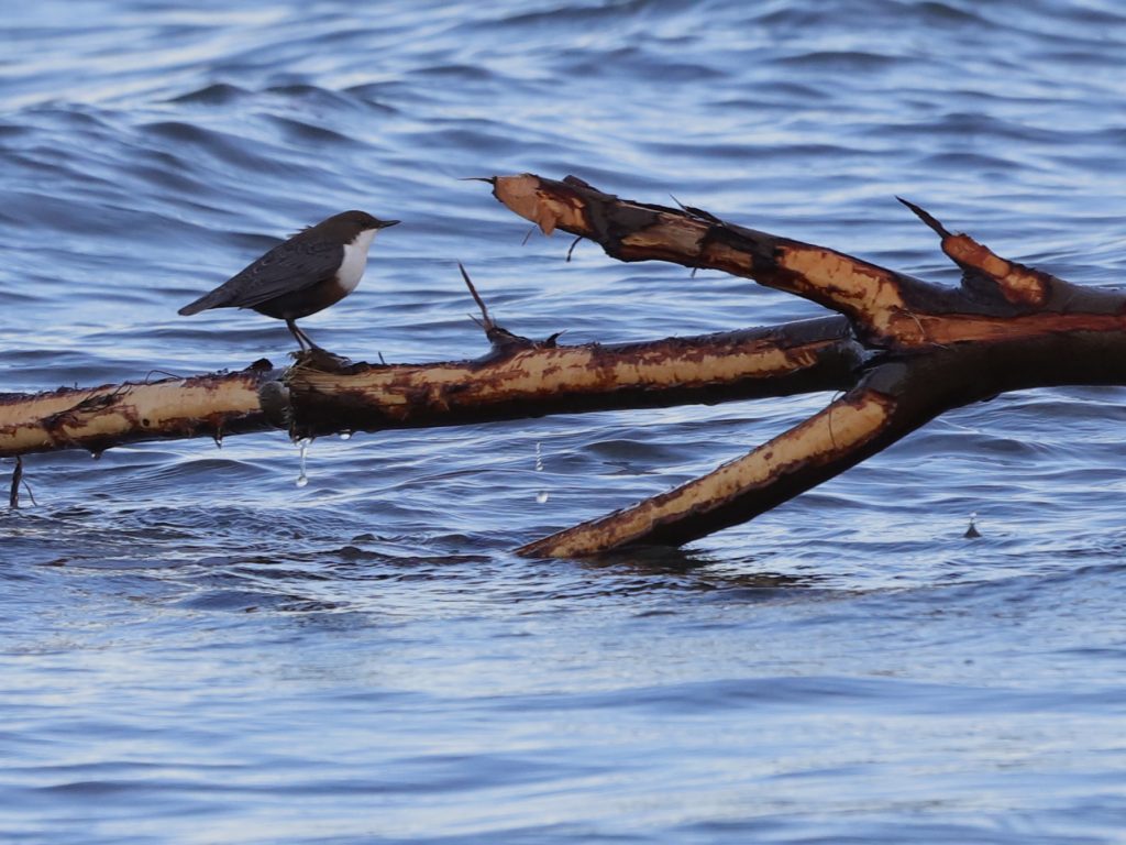 Le Cincle plongeur, sur les rives du lac, s’est laissé approcher, pas trop tout de même. Il est totalement indifférent aux vagues qui couvrent son perchoir voire qui lui passent par dessus la tête. Ledit perchoir a été grignoté par les castors, c’est bien visible sur la pointe de la branche à droite de la tête de l’oiseau.
