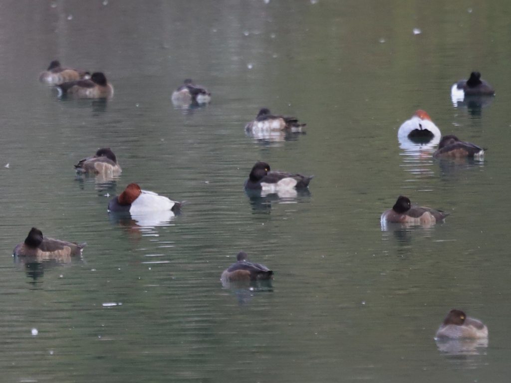 Sur le même plan d’eau – étang de la réserve de la Dranse – deux mâles Fuligules milouins ressortent parmi les Fuligules morillons qui les entourent, même si tout ce petit monde est à la sieste.