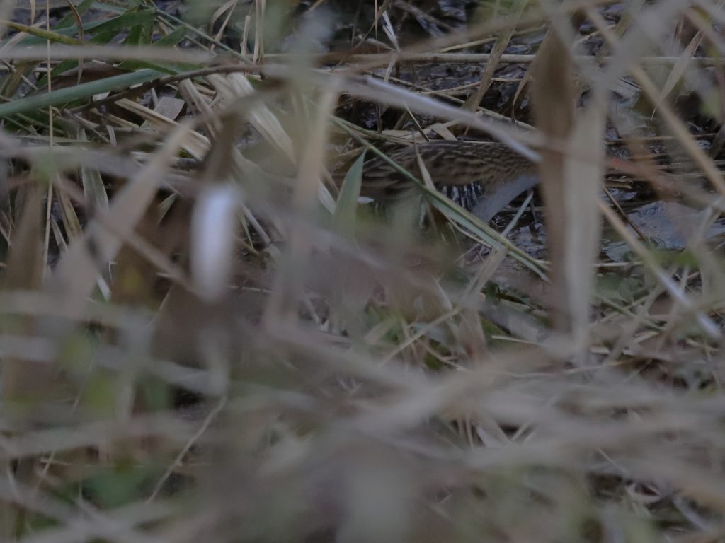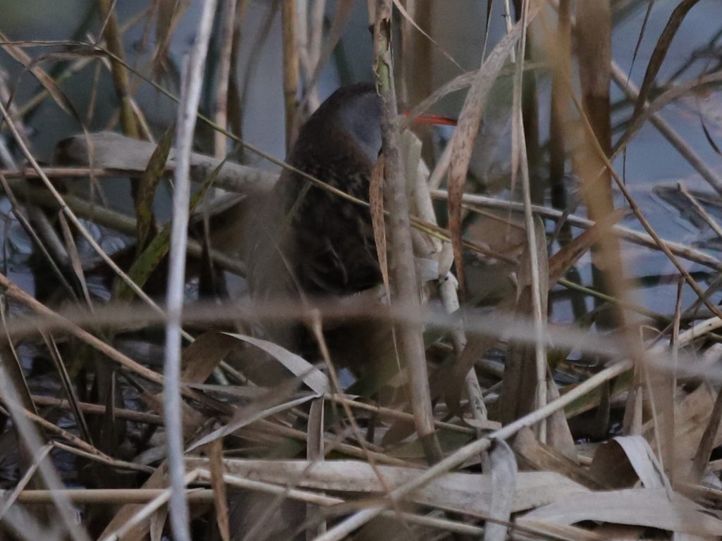 Une longue attente m’a donné le temps de voir deux Râles d’eau, en vol caractéristique avec les pattes pendantes, sans pouvoir les photographier. Une deuxième longue attente a enfin vu un Râle d’eau se faufiler dans la végétation. A peine de la taille d’un pigeon, il a le bec rouge, la joue gris-bleu et le corps brun, un excellent camouflage.