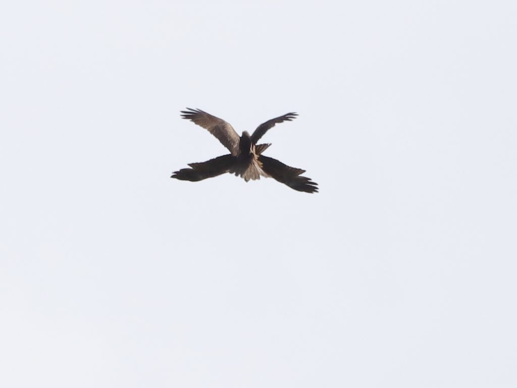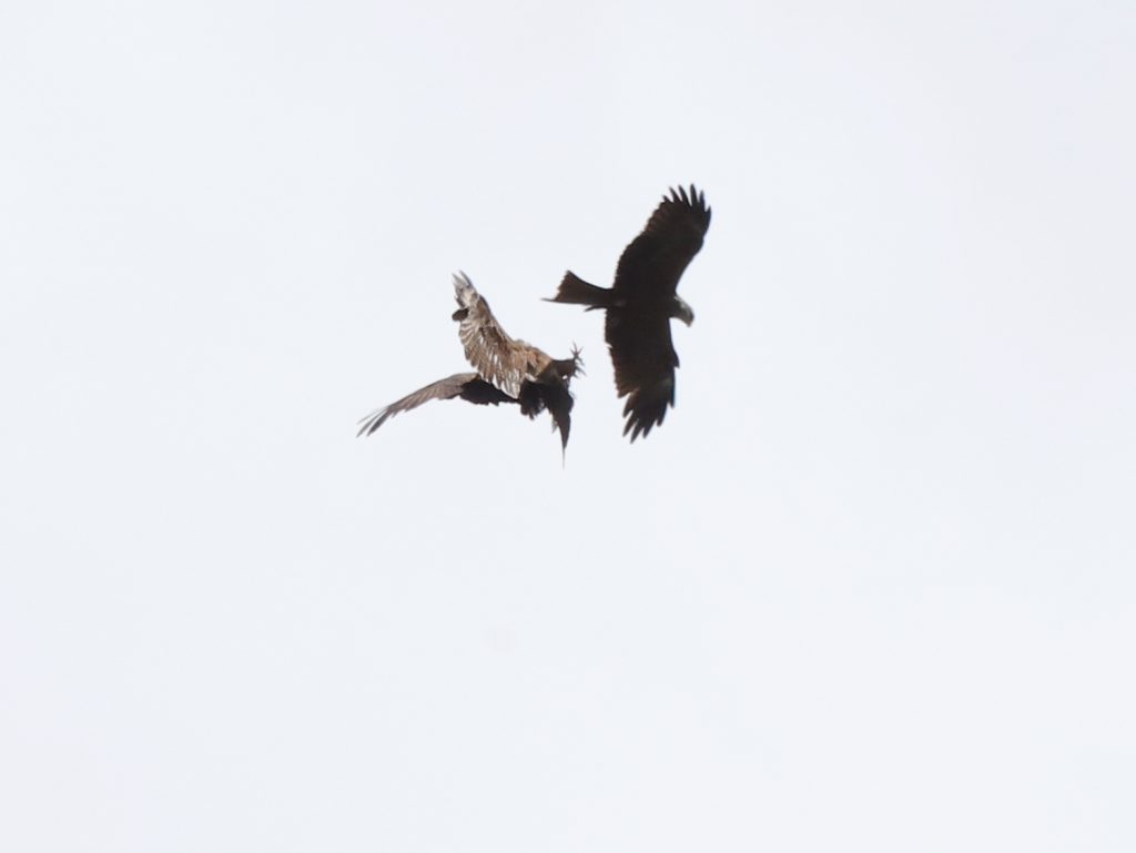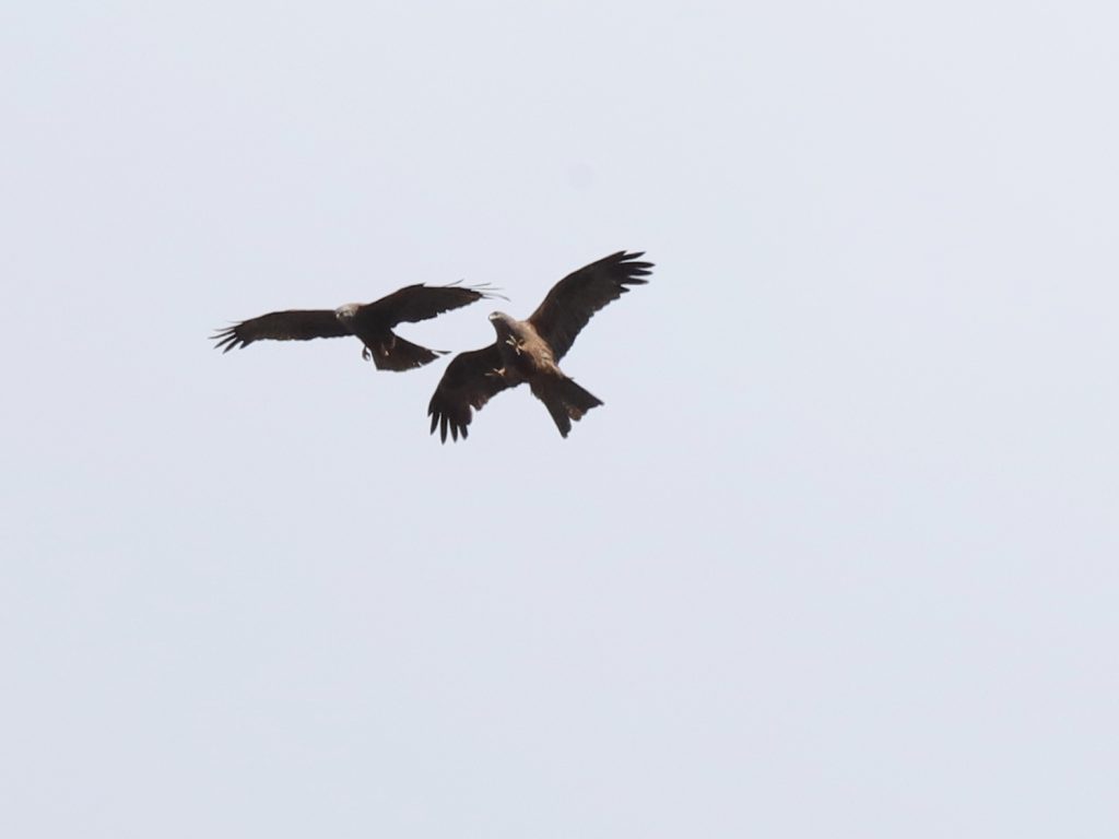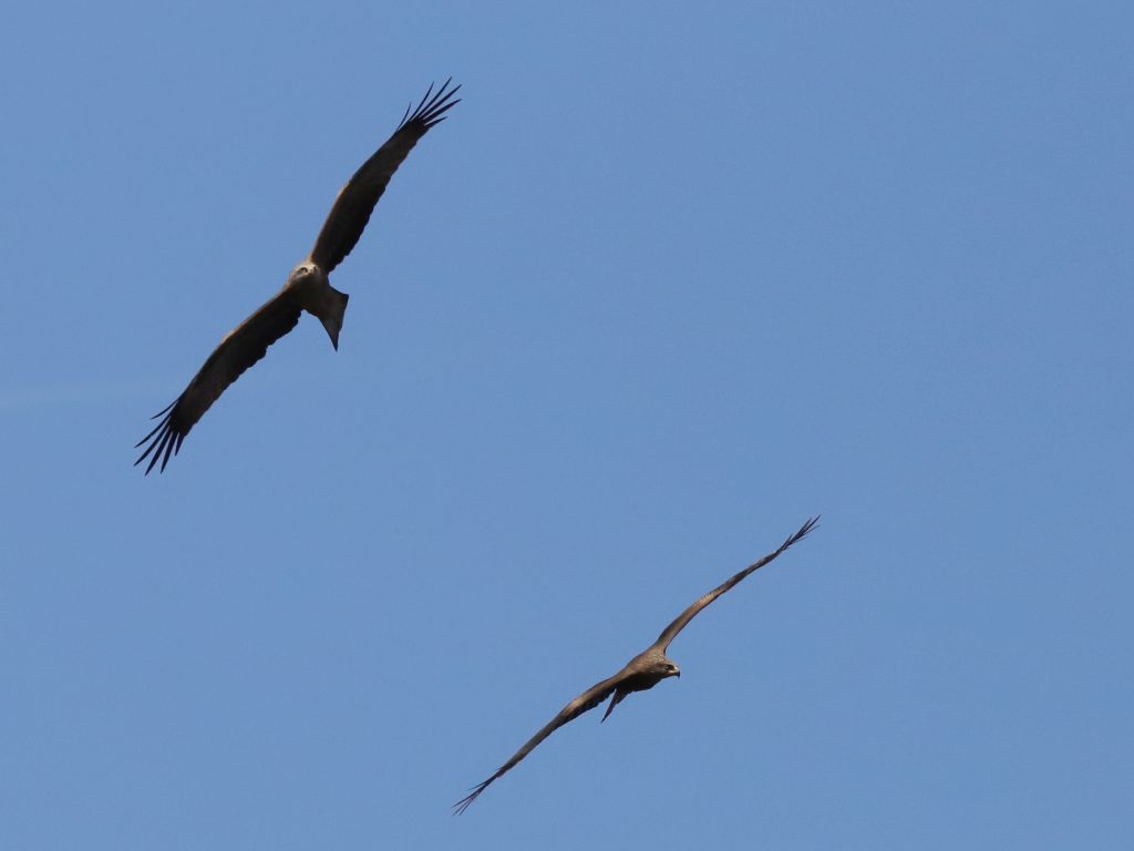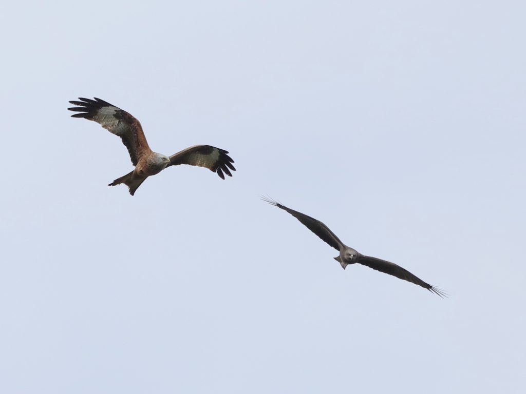Il y a, naturellement, encore des rapaces qui migrent, comme ce Faucon crécerelle, qui partage quelques instants le ciel avec un Milan noir.