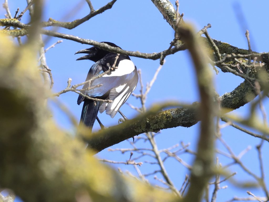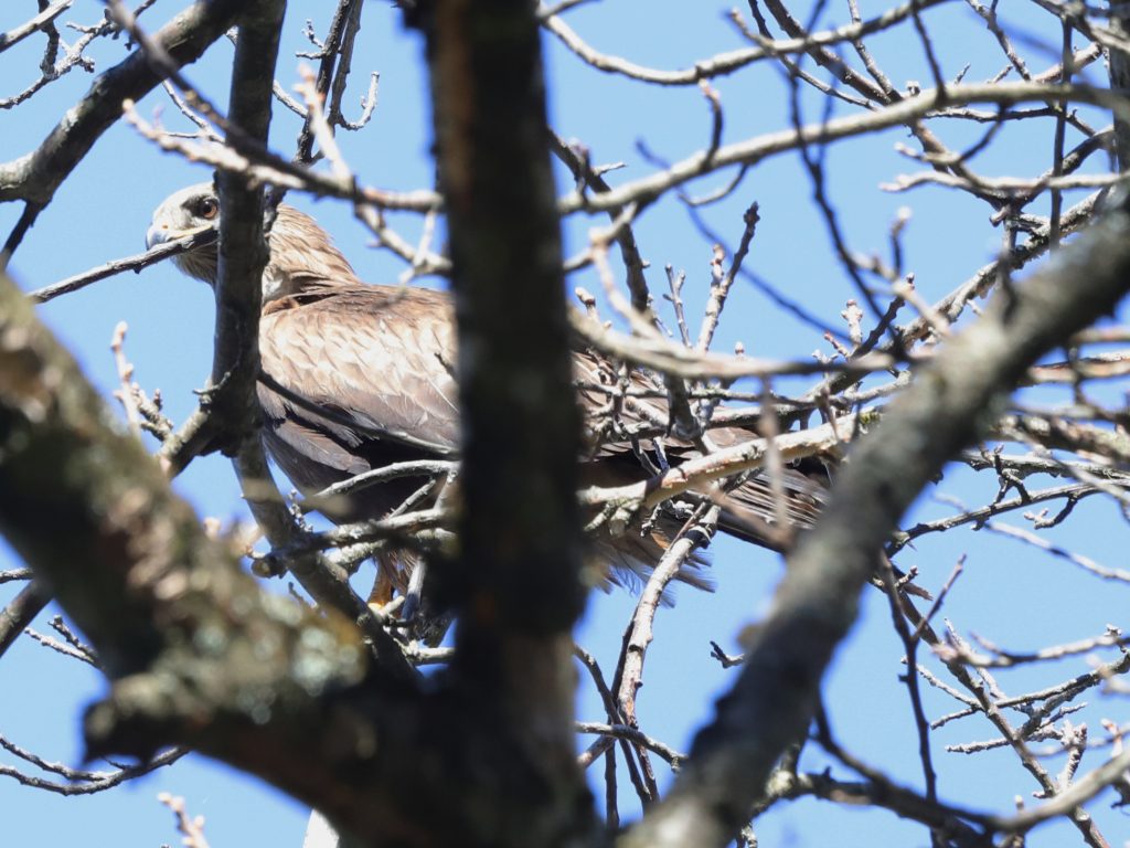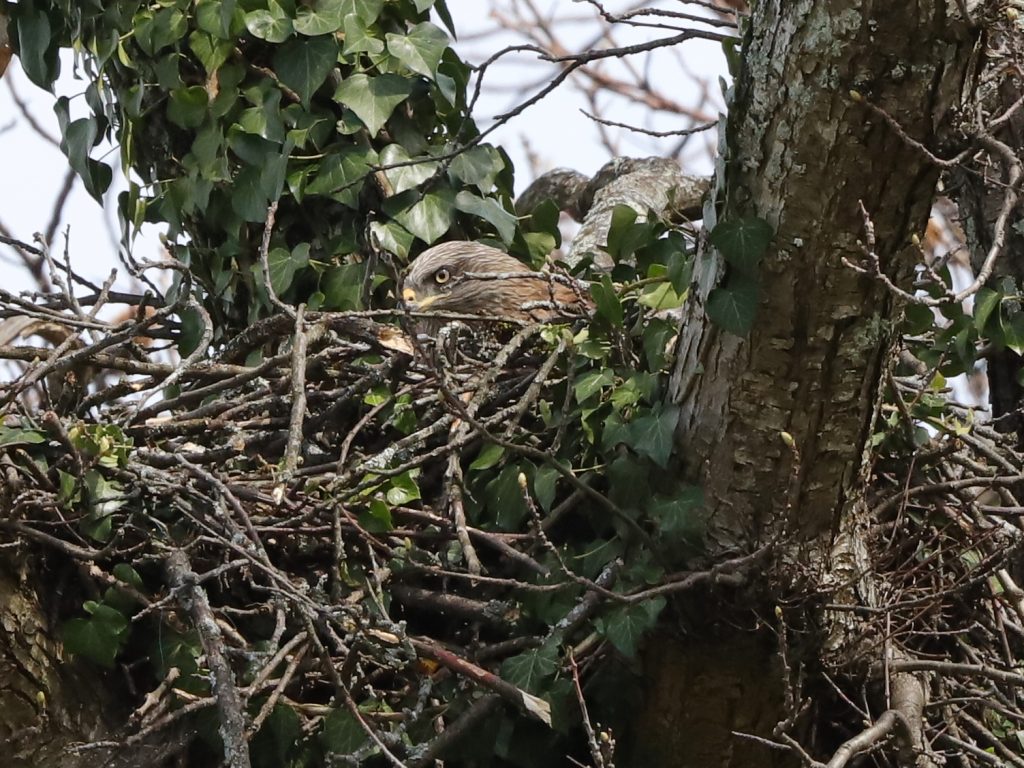 Les Milans noirs estivants de Lugrin sont visibles dans leurs nids pendant quelques jours encore, tant que les arbres sont dépourvus de feuilles. Il y a deux nids, tous deux dans des châtaigniers. Le premier est visible d’en dessous, on ne voit donc que la tête de l’oiseau qui couve. Le deuxième nid est visible par en dessus car il se situe en contrebas d’une route. Les objets clairs que l’on voit sur le côté de l’oiseau sont des morceaux de plastique, censés embellir le nid …