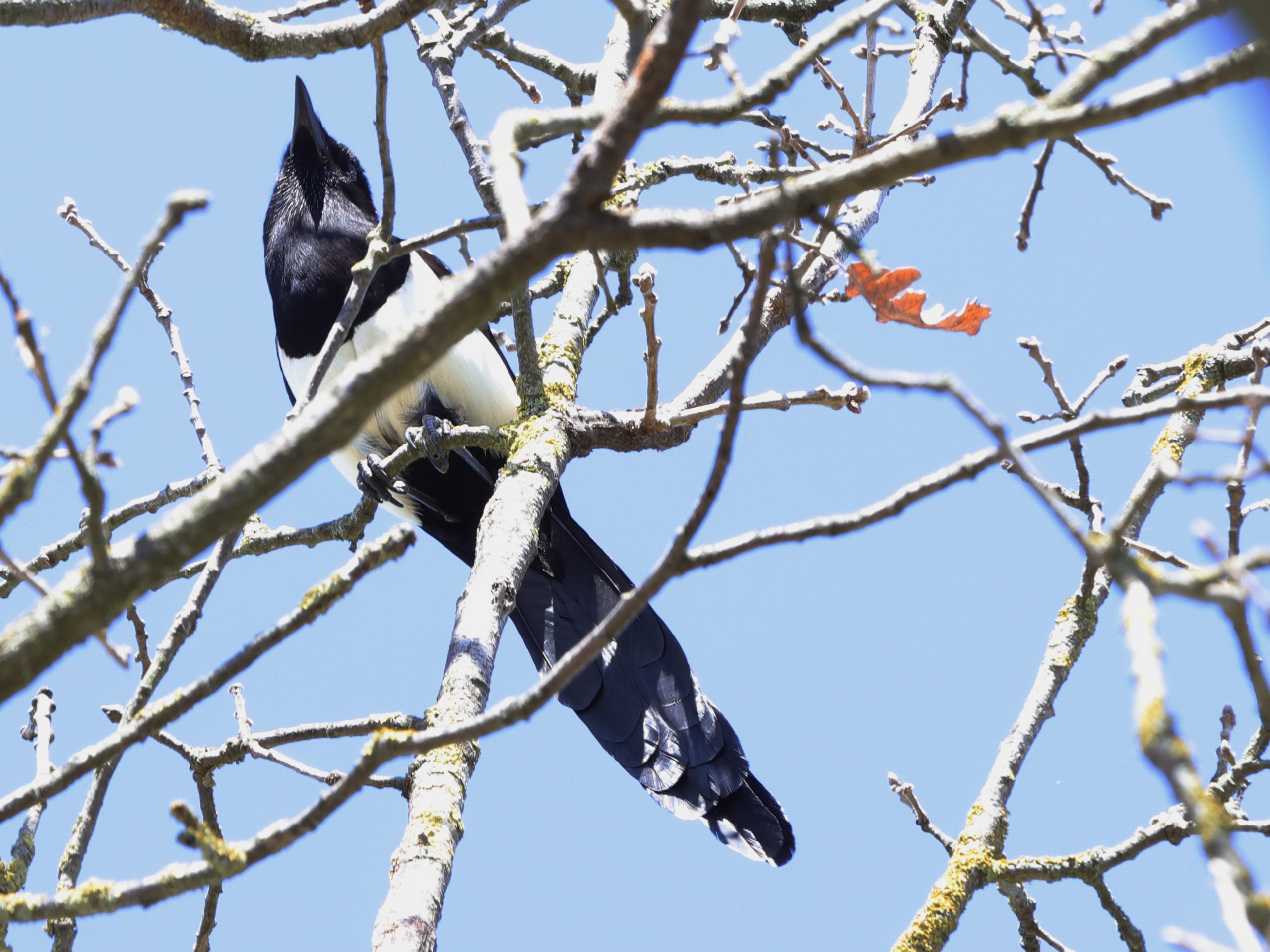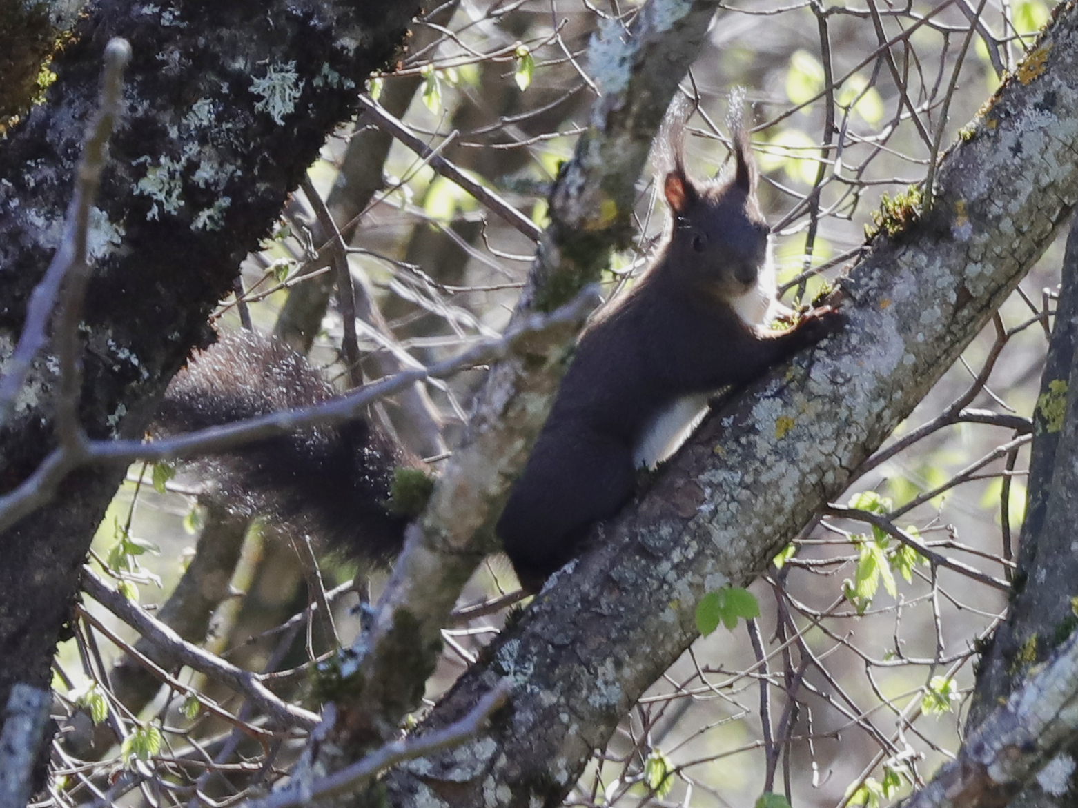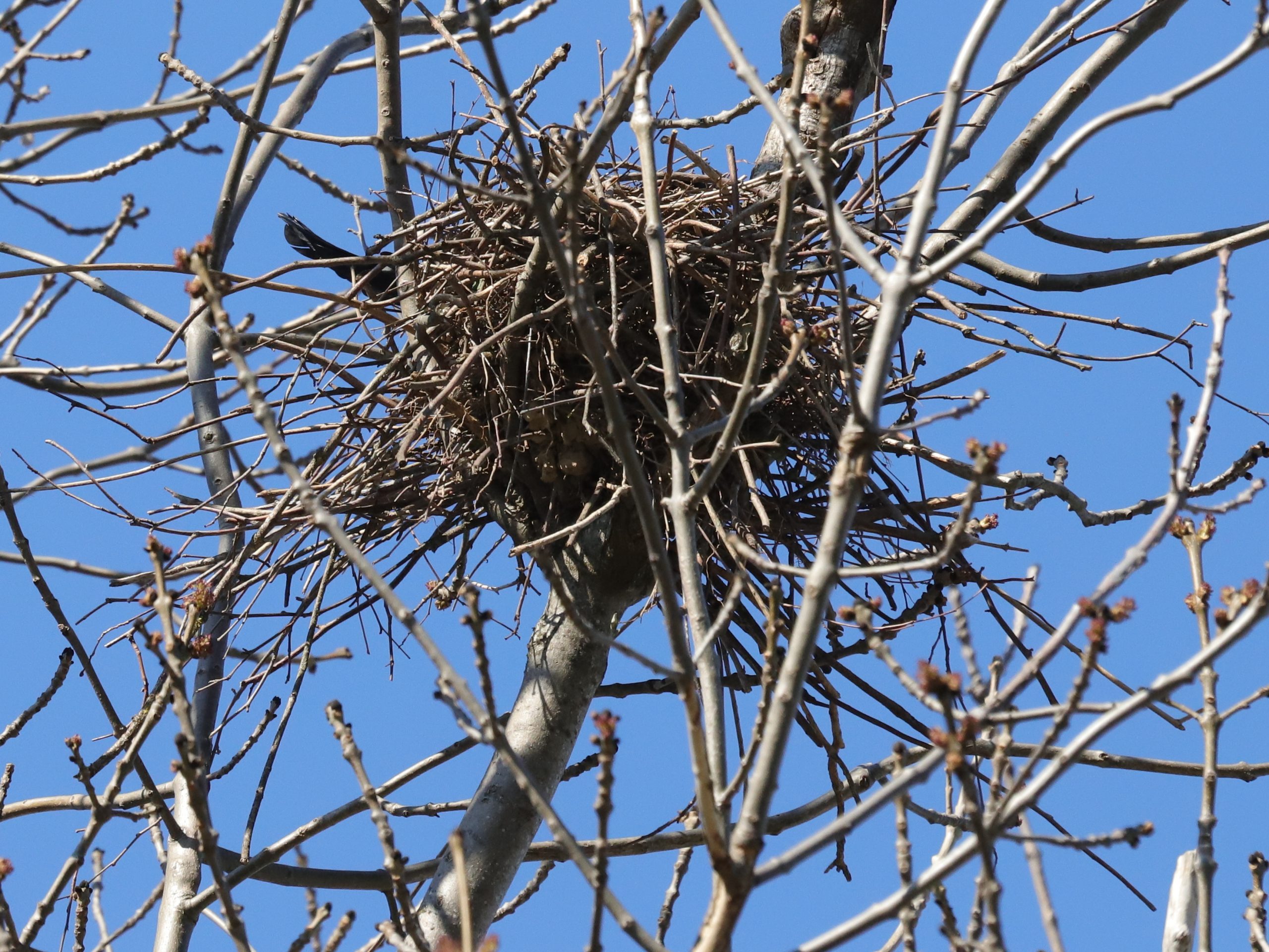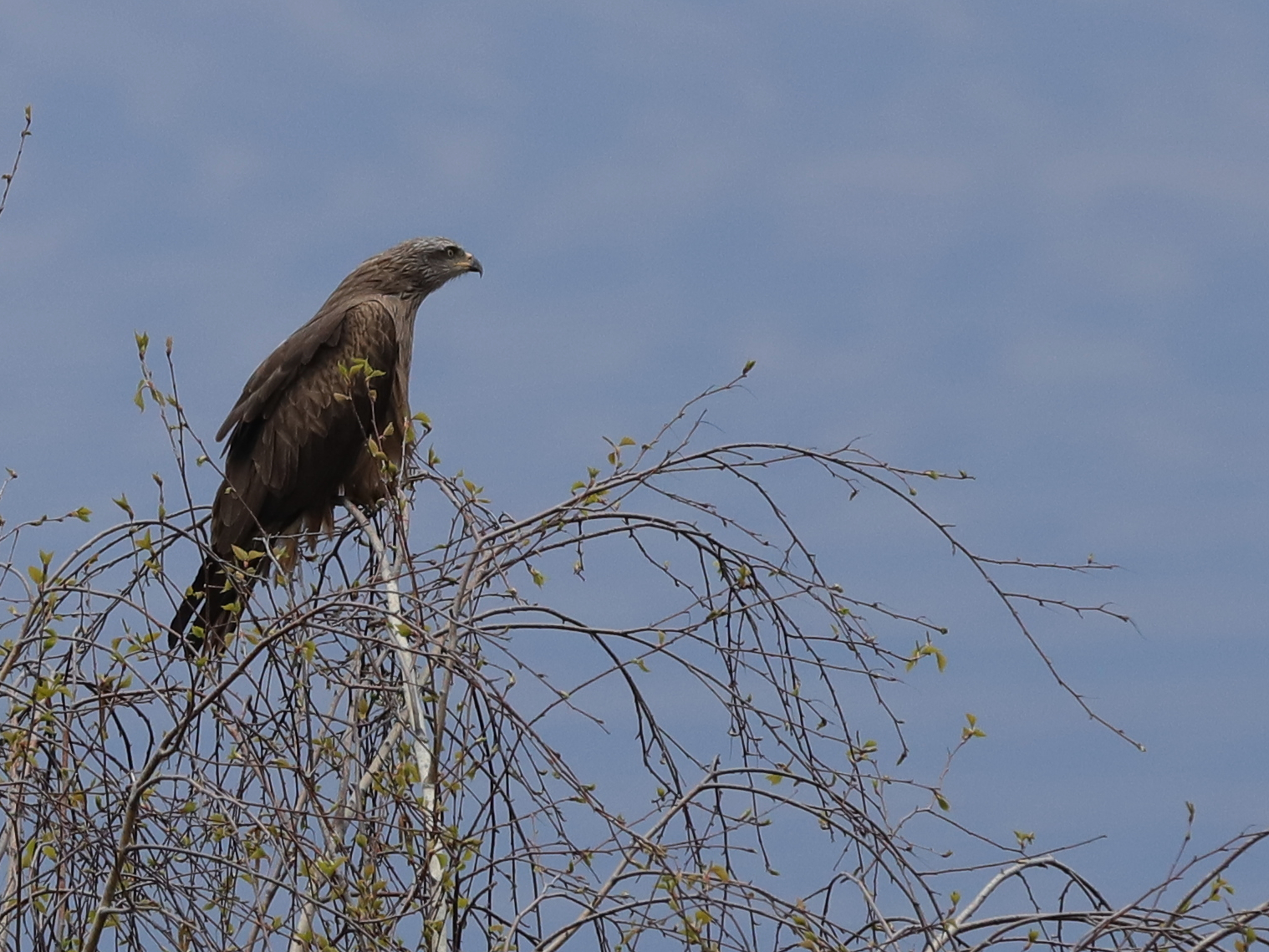 Les Milans noirs estivants de Lugrin sont visibles dans leurs nids pendant quelques jours encore, tant que les arbres sont dépourvus de feuilles. Il y a deux nids, tous deux dans des châtaigniers. Le premier est visible d’en dessous, on ne voit donc que la tête de l’oiseau qui couve. Le deuxième nid est visible par en dessus car il se situe en contrebas d’une route. Les objets clairs que l’on voit sur le côté de l’oiseau sont des morceaux de plastique, censés embellir le nid …