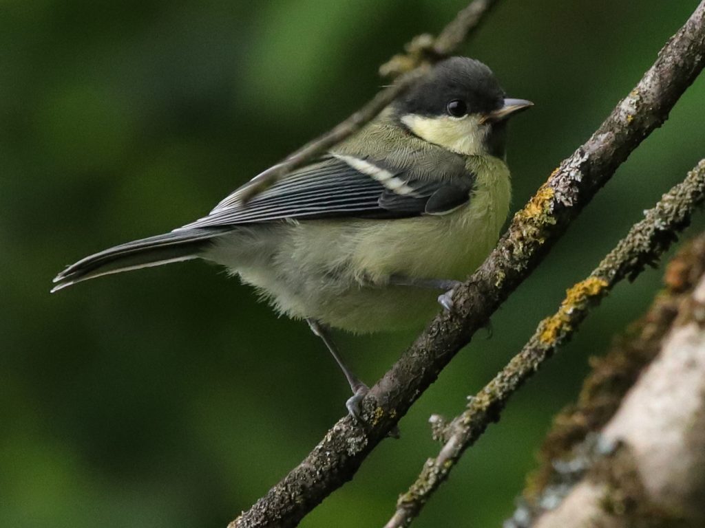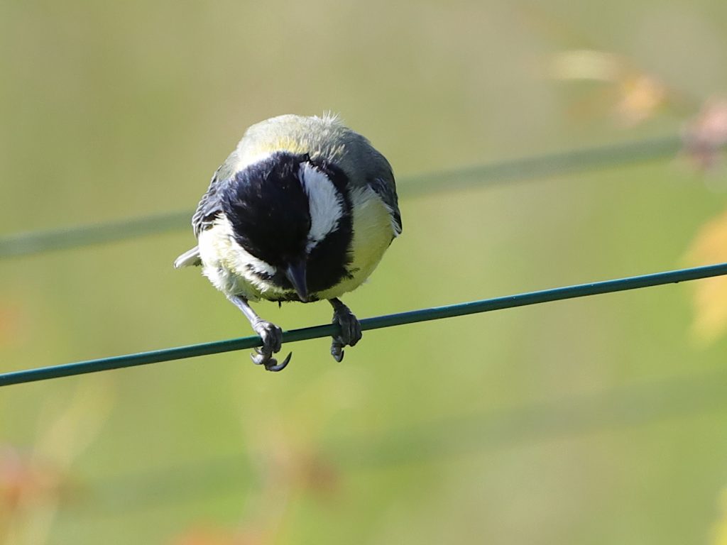 La Mésange charbonnière, posée sur un fil métallique dans une vigne, exhibe des ongles postérieurs impressionnants mais pas utiles sur un perchoir de faible diamètre.