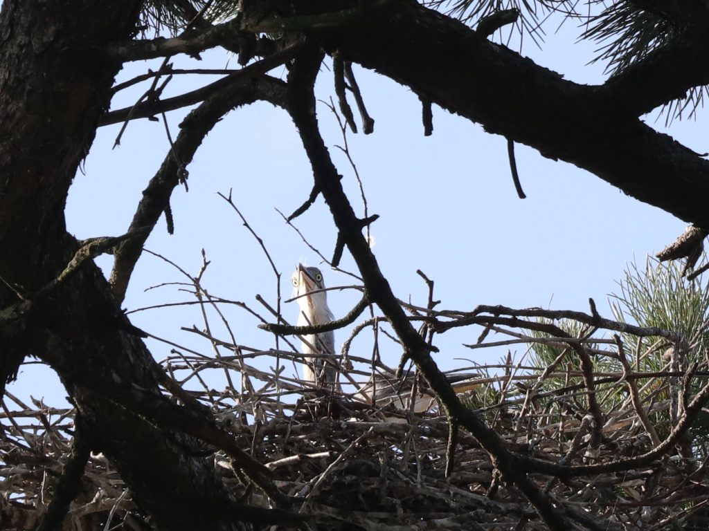 Les nids de Héron cendré s’animent chaque jour davantage avec des jeunes qui grossissent et commencent à battre des ailes. Une longue attente m’a permis de saisir une image de nourrissage. Sur la dernière photo, l’oisillon exhibe ses ailes encore incomplètes, avec les plumes encore dans leur tubes.