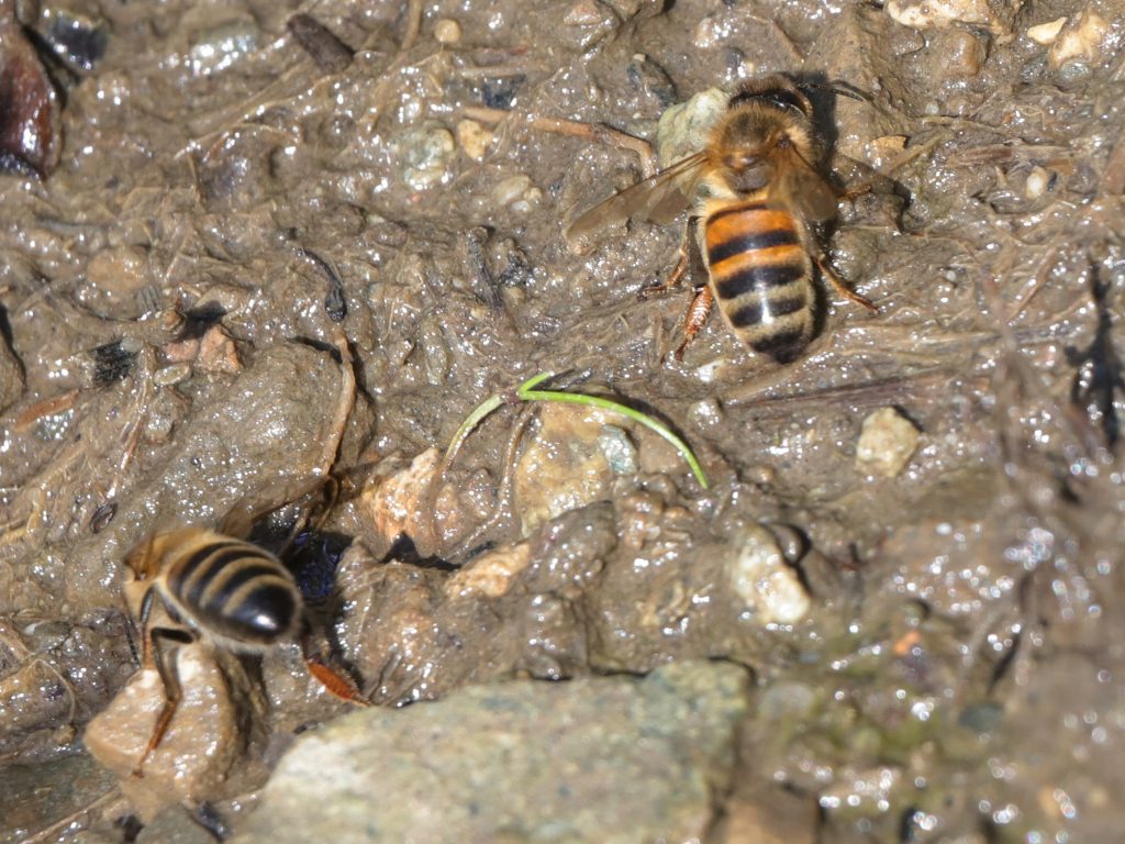 Quelques insectes. Les abeilles vont boire – ou prélever de l’eau pour la ruche – en gardant les pattes sur la terre ferme …