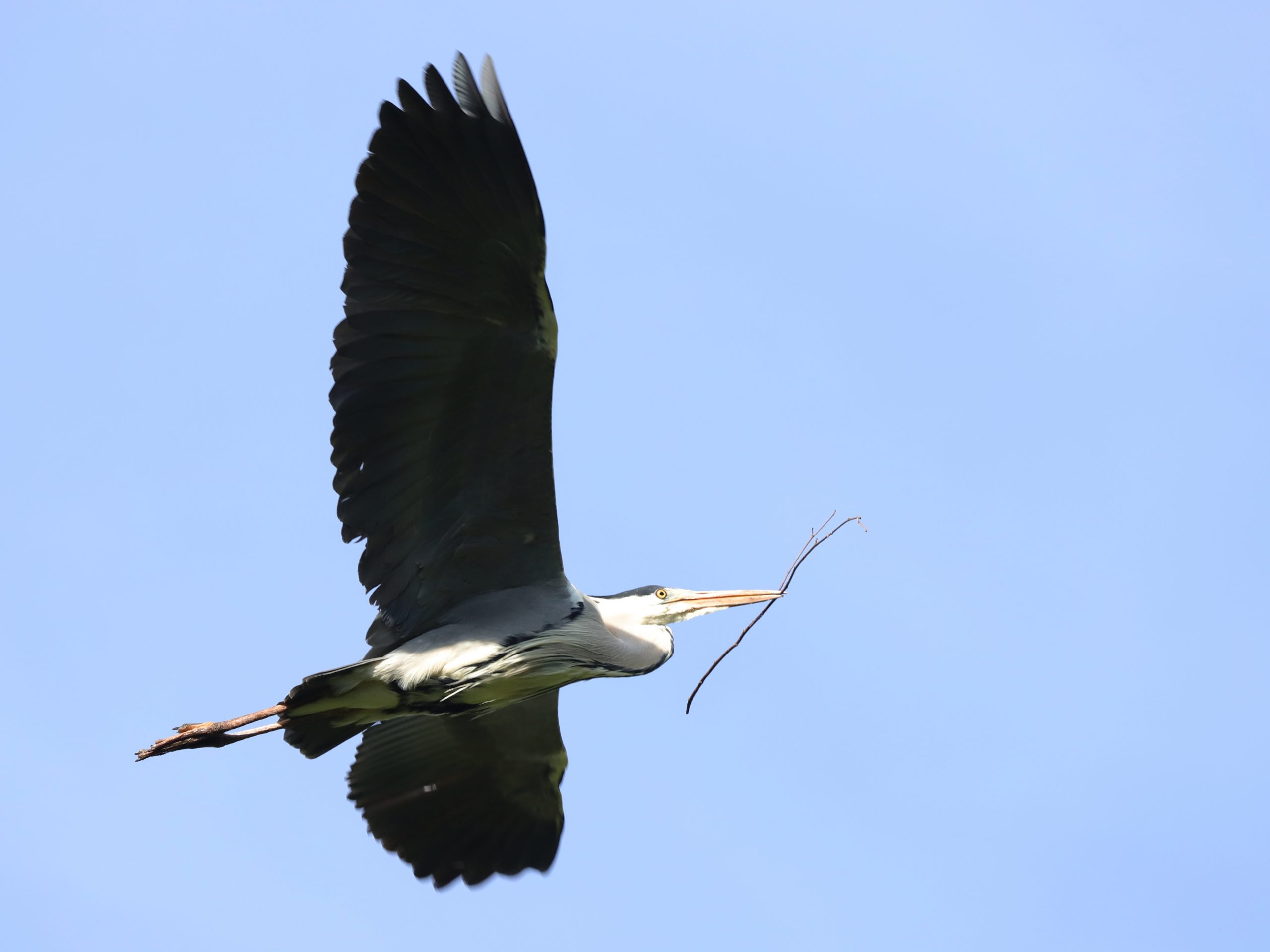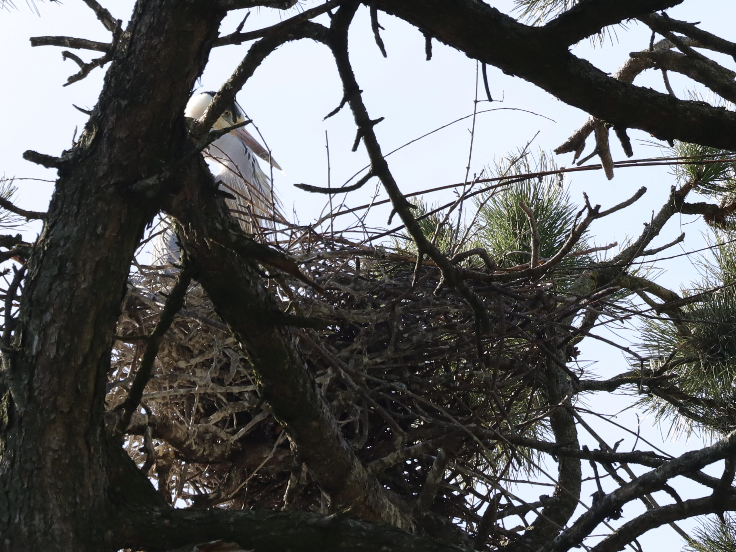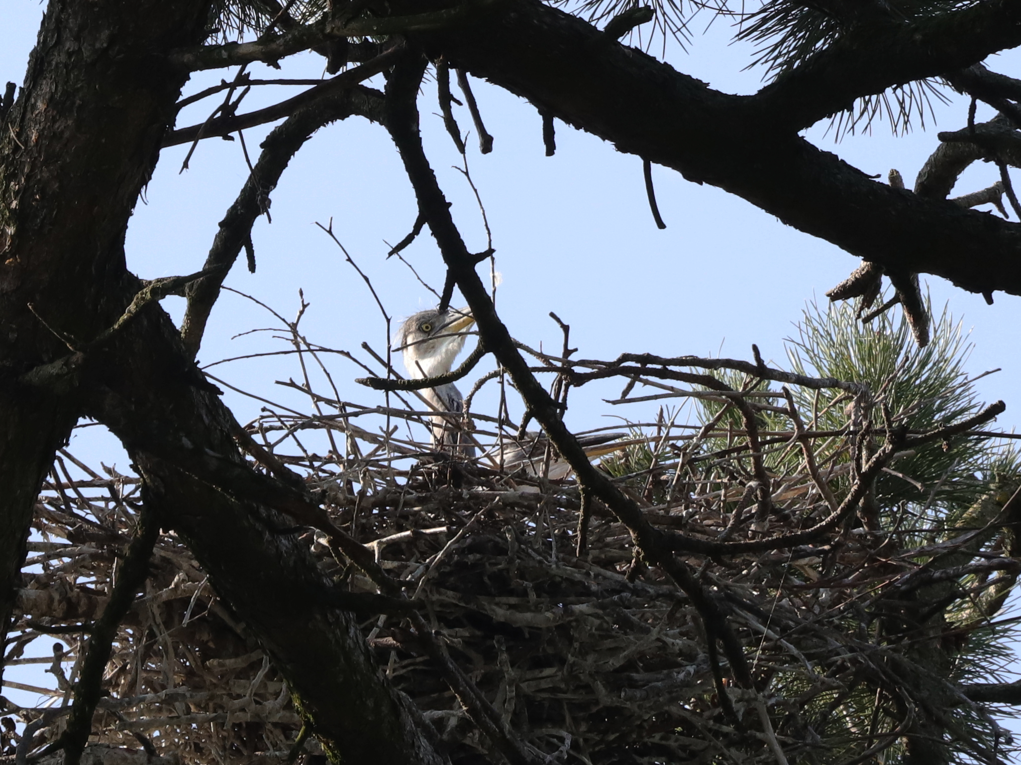 Les nids de Héron cendré s’animent chaque jour davantage avec des jeunes qui grossissent et commencent à battre des ailes. Une longue attente m’a permis de saisir une image de nourrissage. Sur la dernière photo, l’oisillon exhibe ses ailes encore incomplètes, avec les plumes encore dans leur tubes.
