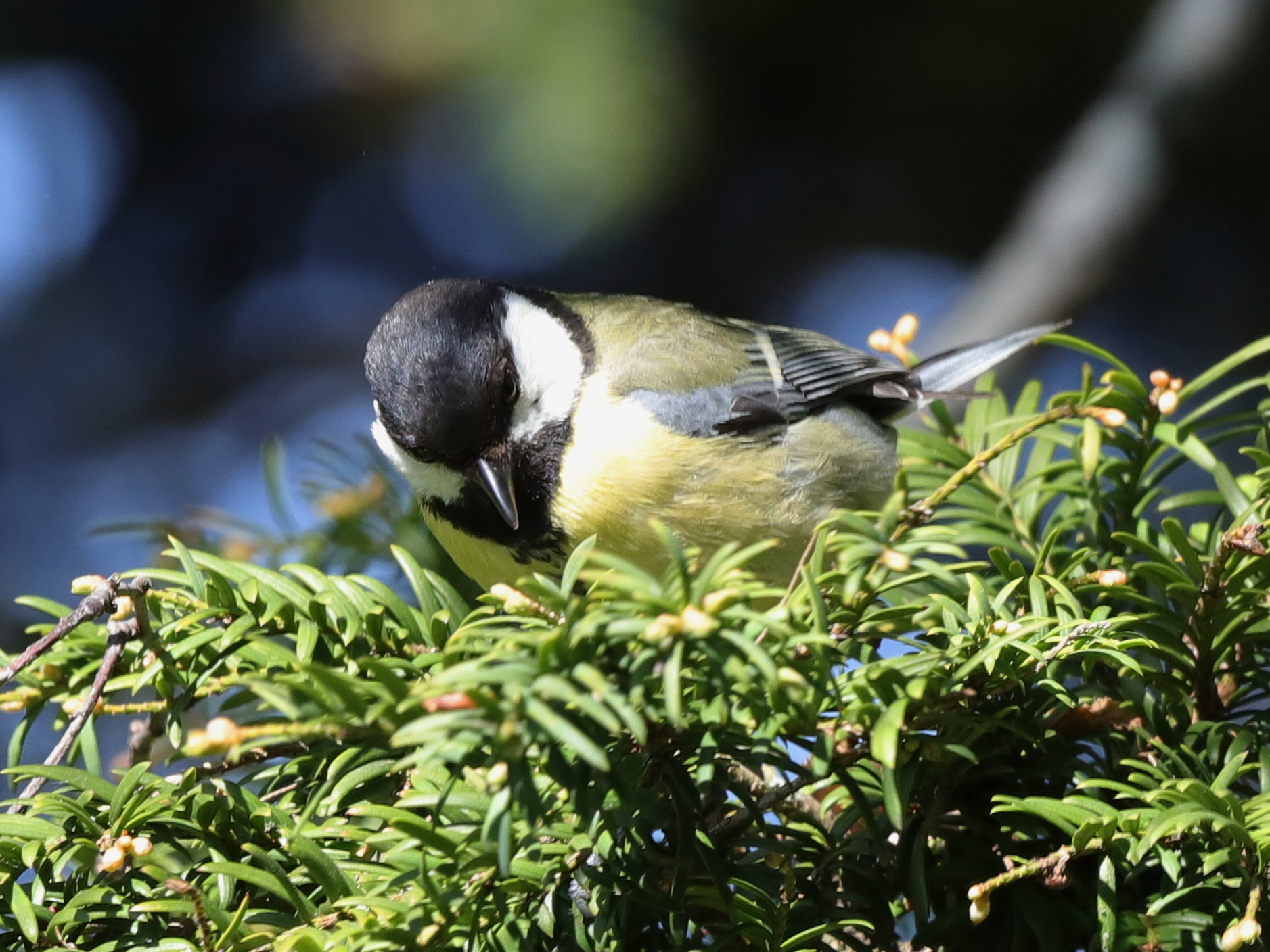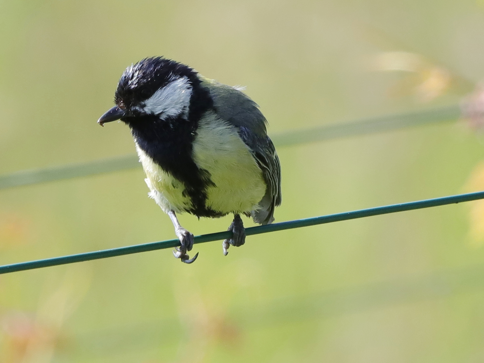 La Mésange charbonnière, posée sur un fil métallique dans une vigne, exhibe des ongles postérieurs impressionnants mais pas utiles sur un perchoir de faible diamètre.