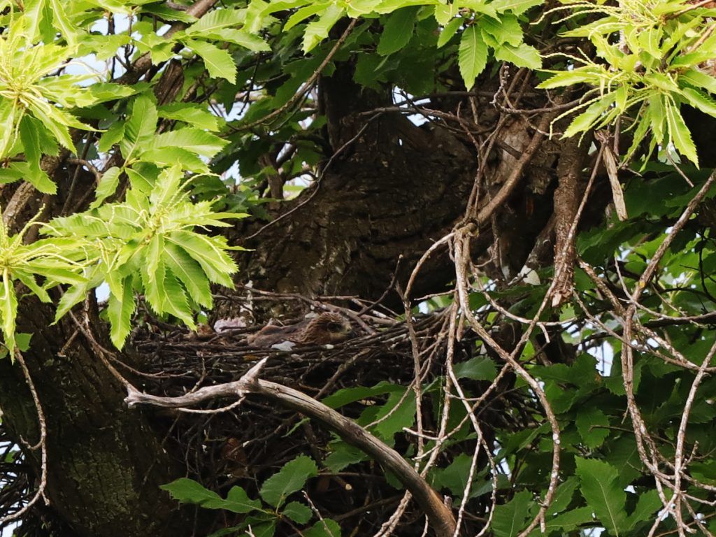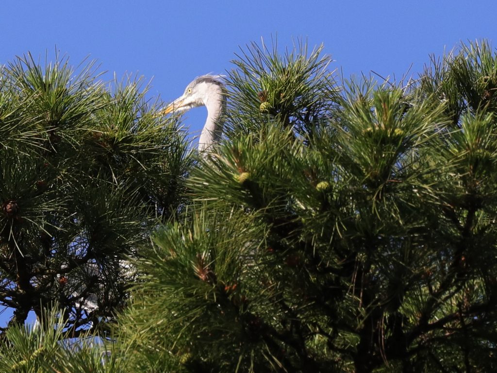 Les jeunes Hérons cendrés sont beaucoup moins pressés de quitter les nids. Ils passent leur temps à caqueter, à se lisser les plumes , à se chamailler parfois, en attendant qu’un adulte vienne les nourrir. Il leur faut de la patience : en plus d’une heure d’observation, pas un adulte n’est venu au ravitaillement.
