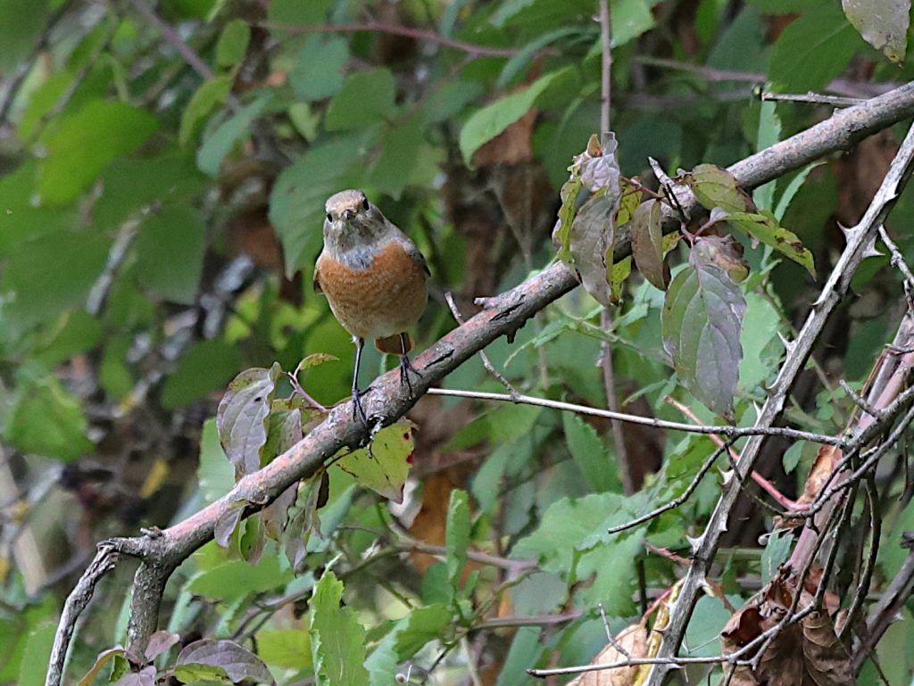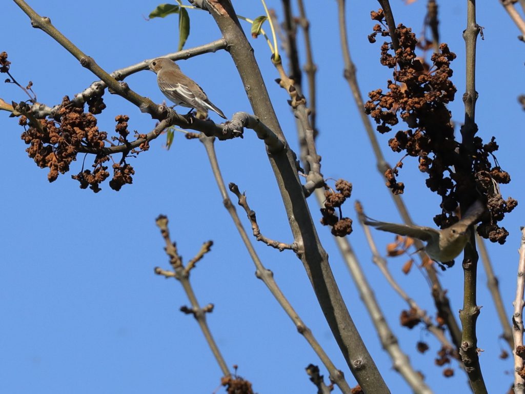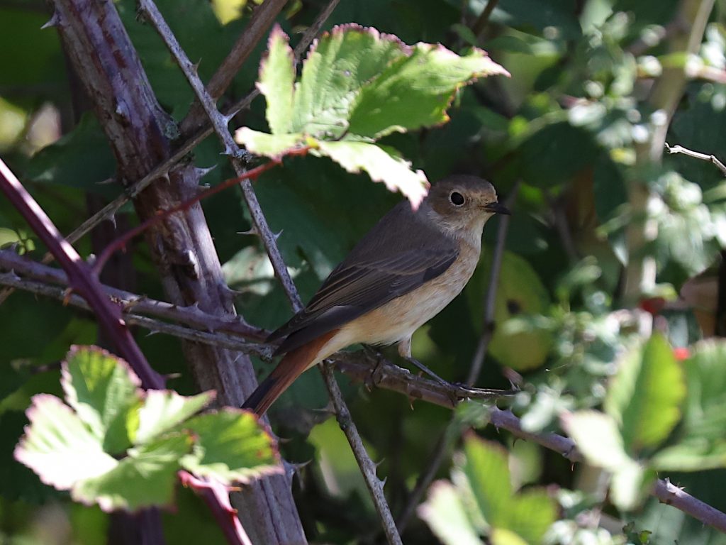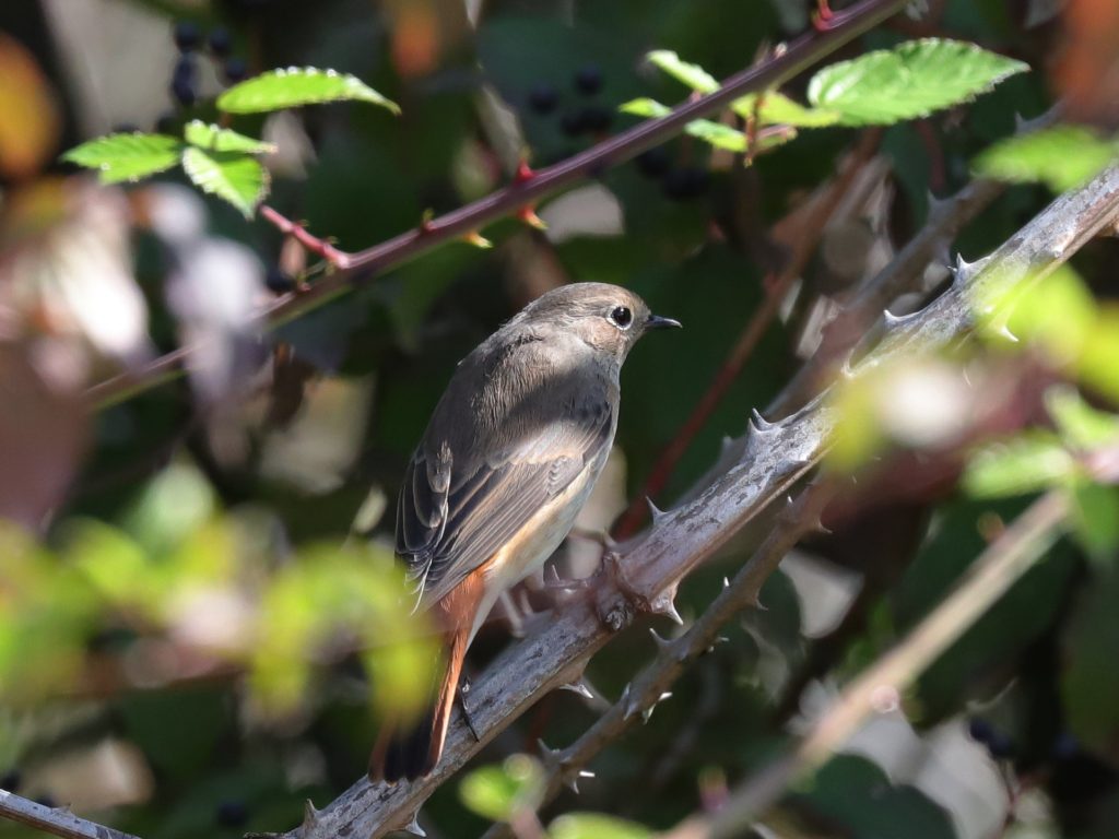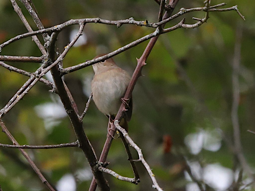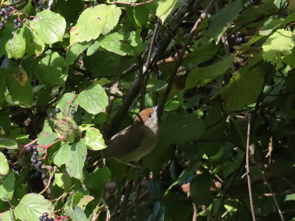 Il y a quelques Fauvettes à tête noire, ici une femelle, qui prospectent les buissons. C’est un oiseau insectivore mais qui passe à un régime plus varié comprenant mûres, et autres petits fruits à l’automne. Il s’agit de prendre de l’énergie avant la migration.