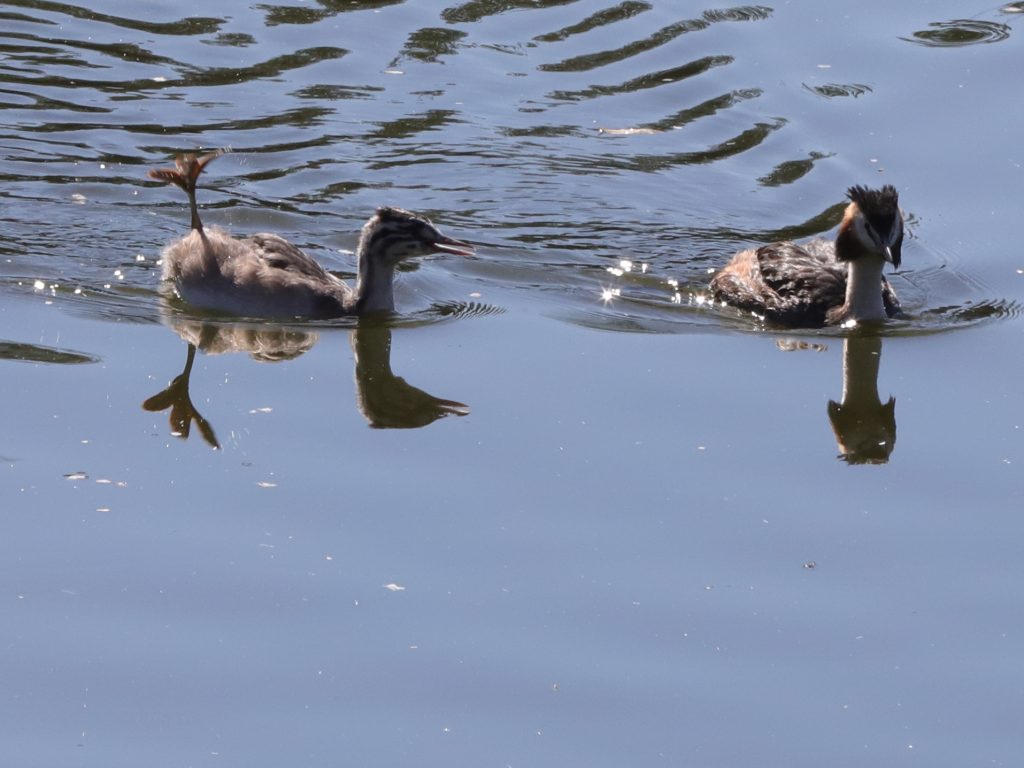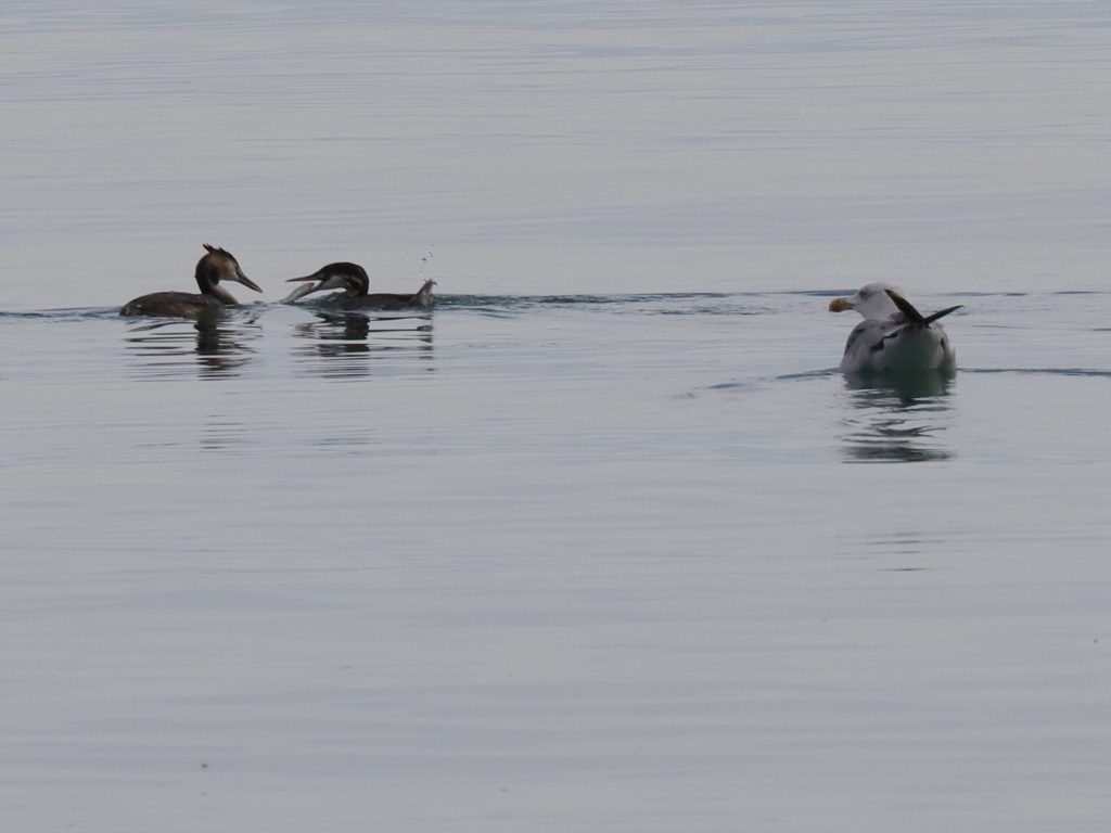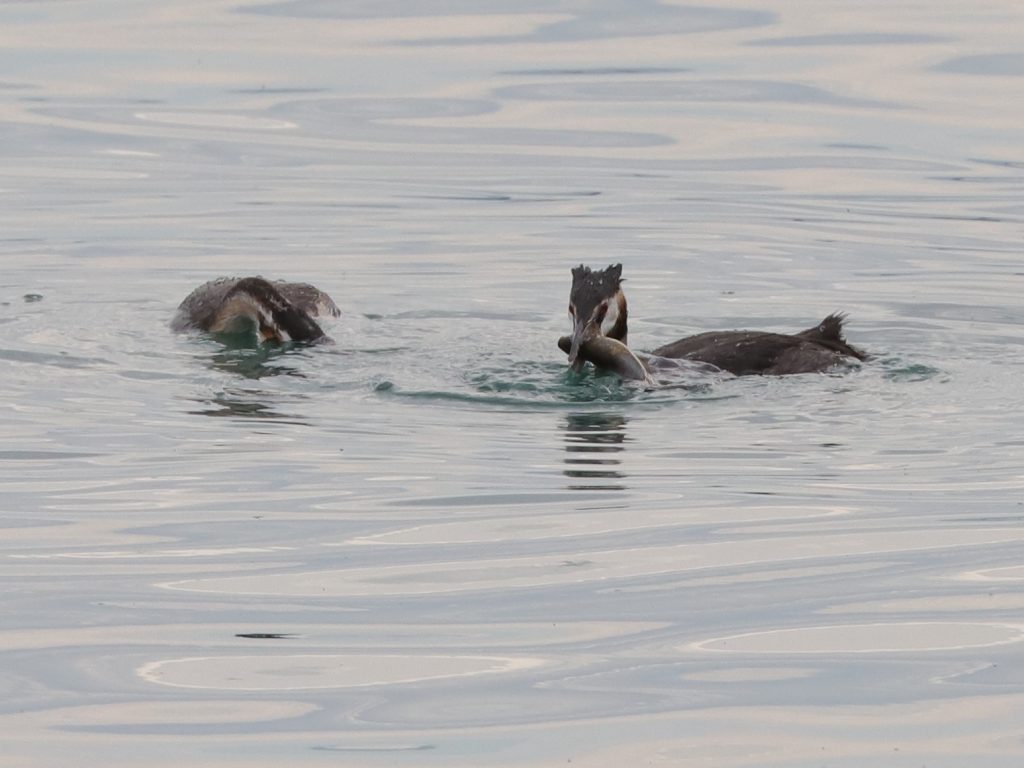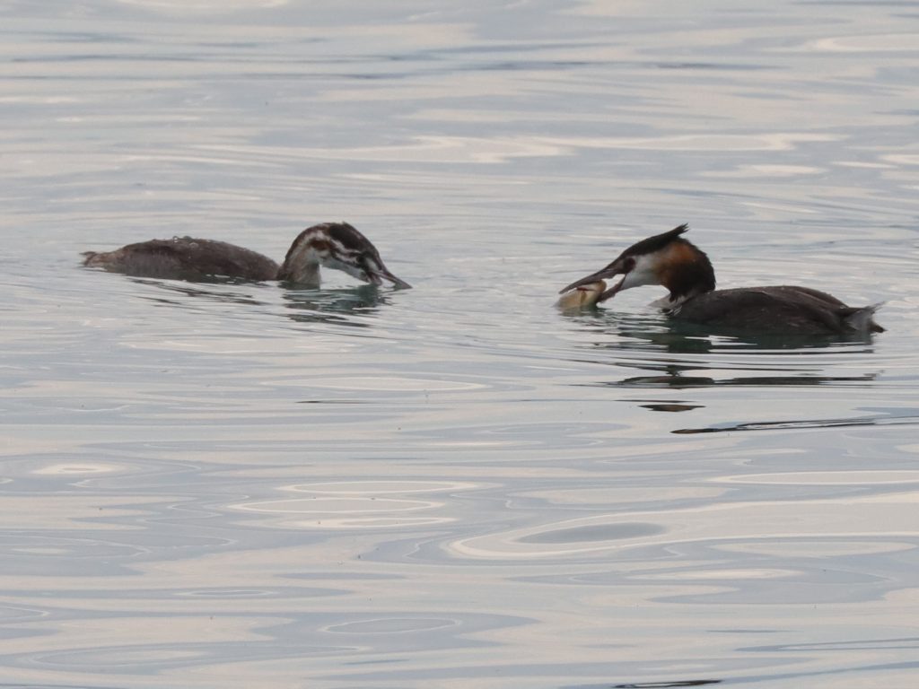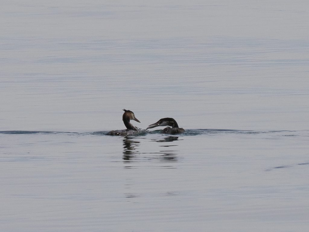 Les Grèbes huppés sommeillent le bec enfoncé dans les plumes, ce qui les fait ressembler à des bateaux militaires des années 1900. En passant, la langue doit bien aider lorsqu’ils ont un poisson dans le bec.