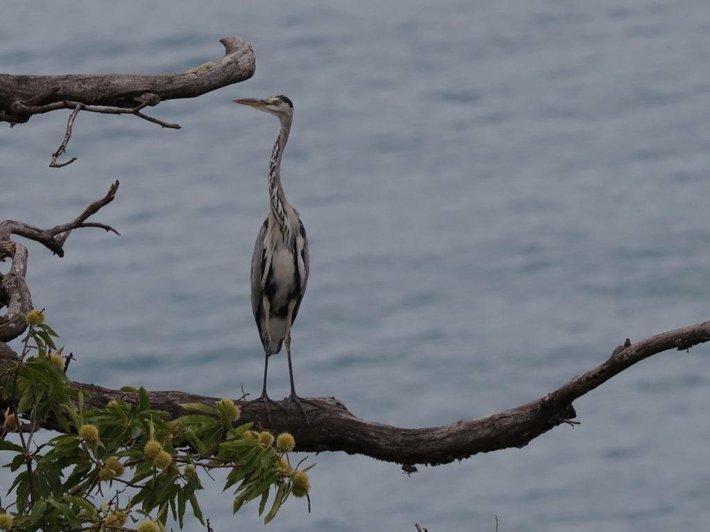 Un Héron cendré a choisi un vieux châtaignier comme perchoir temporaire.